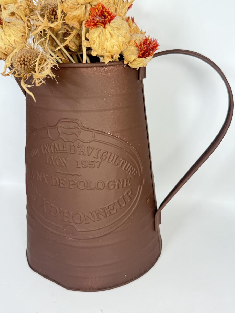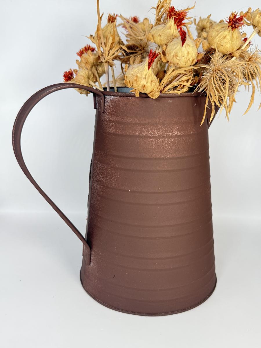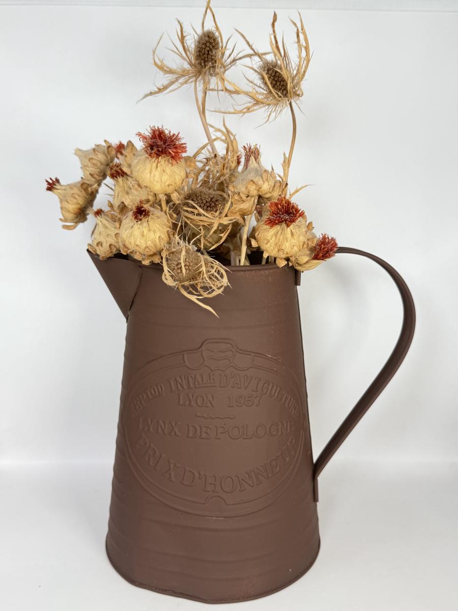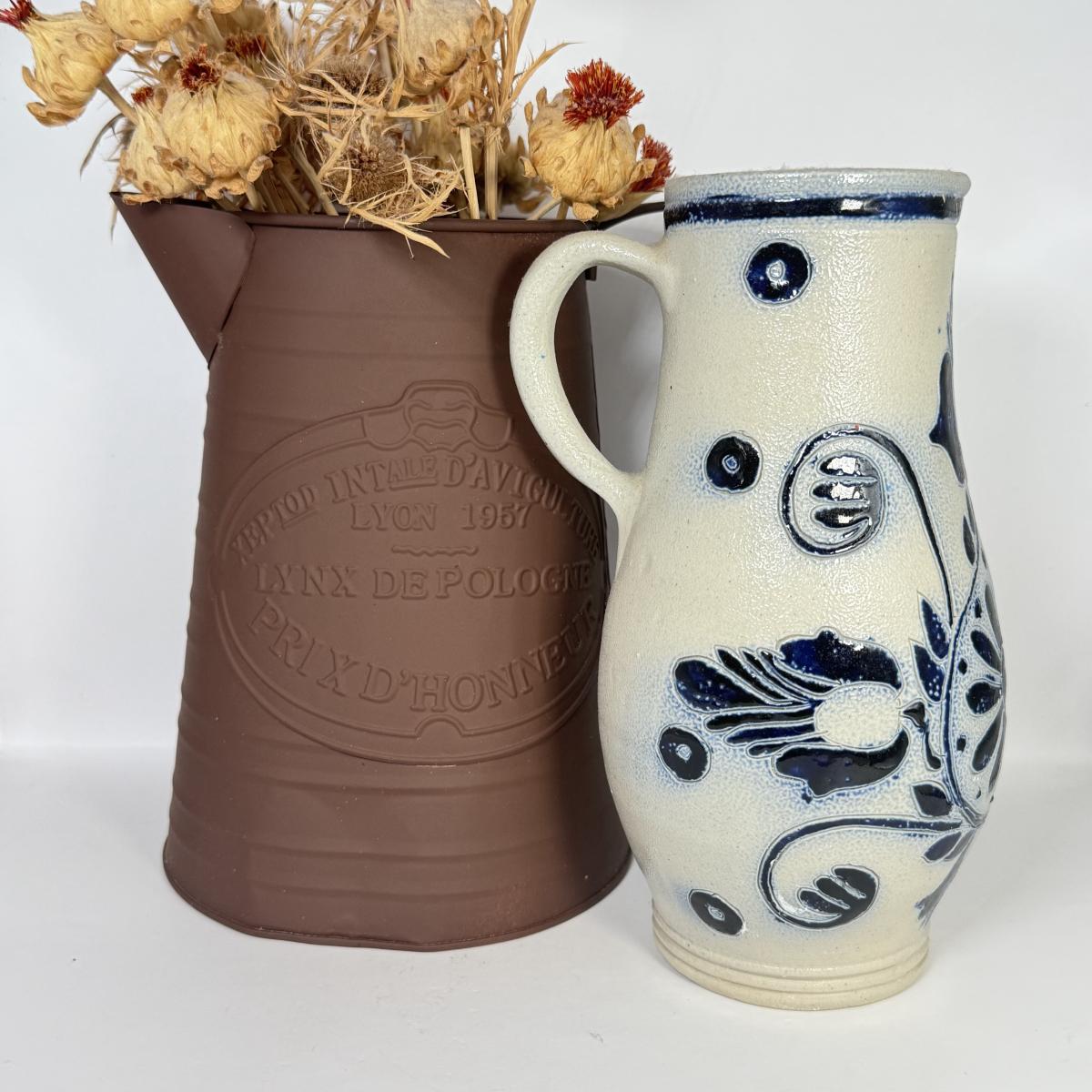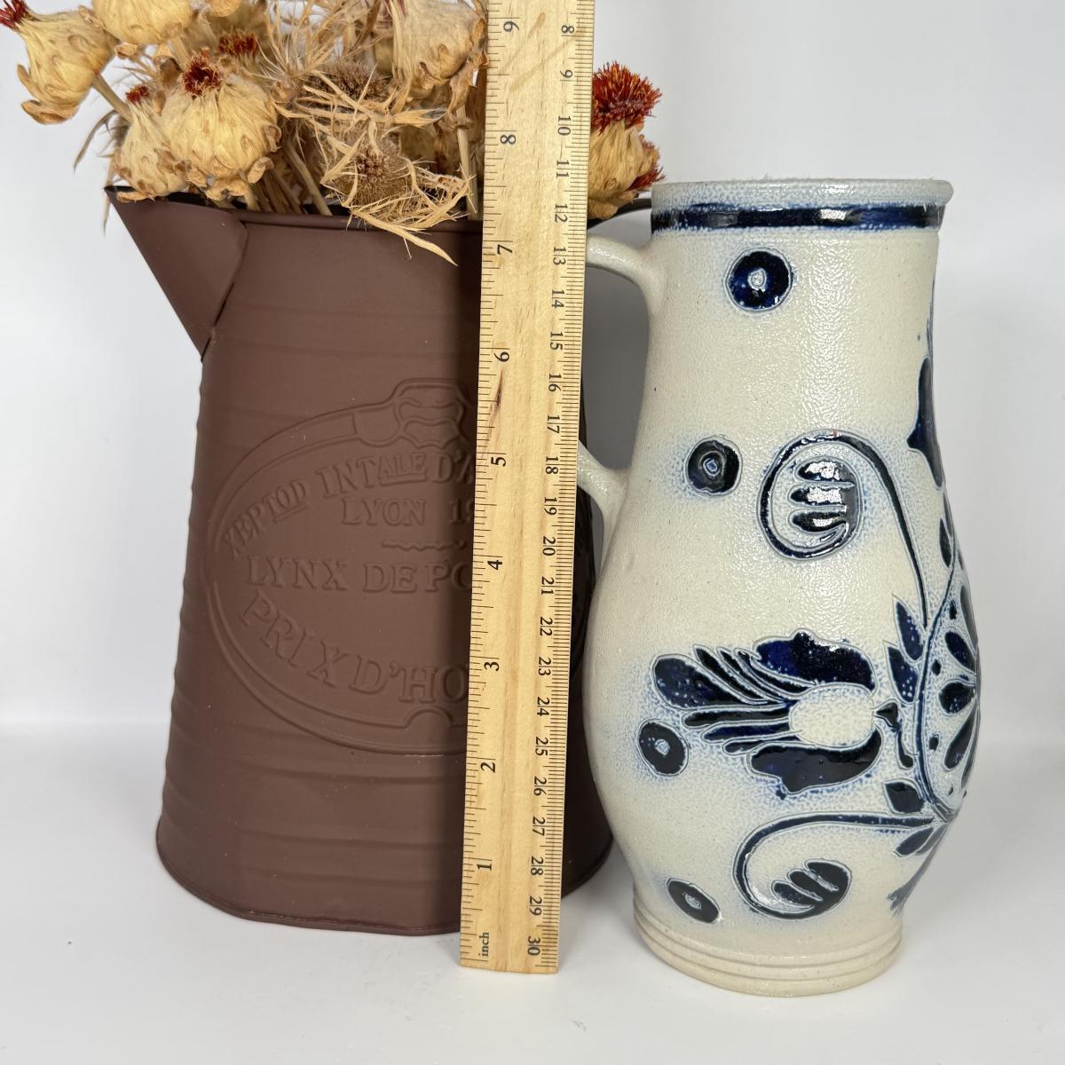 LOT 51F: Williamsburg Blur Stoneware Pottery Pitcher & Rustic Lynx Depologie Metal Pitcher w/ Dried Thistle