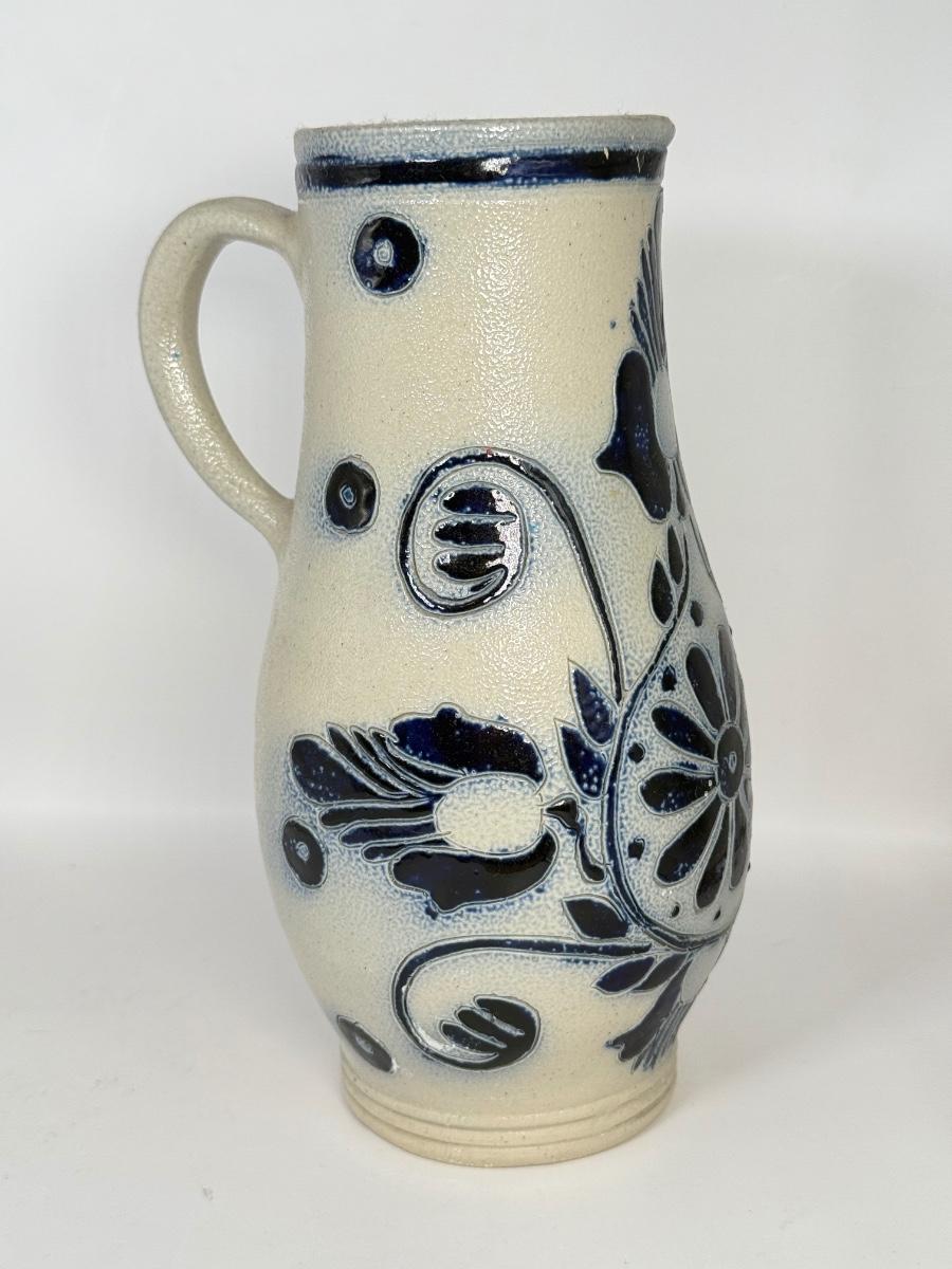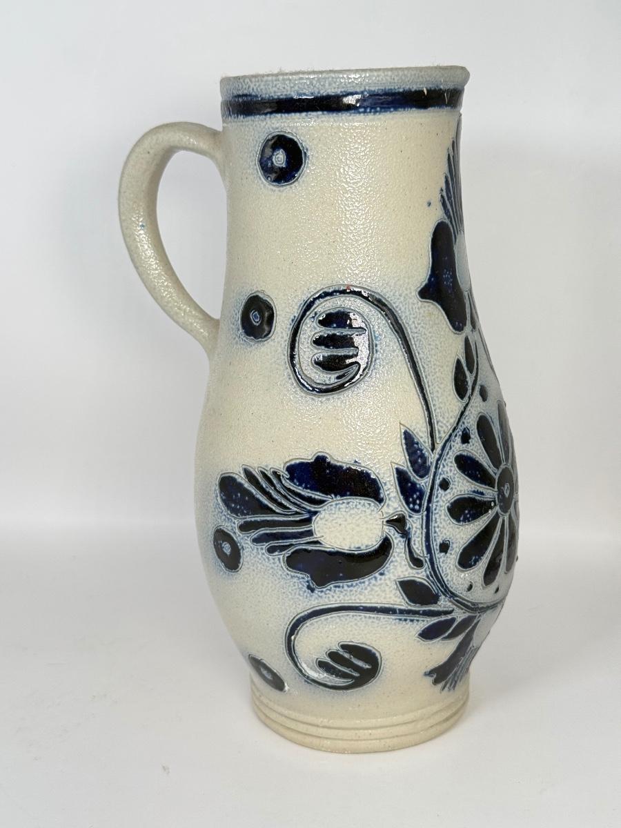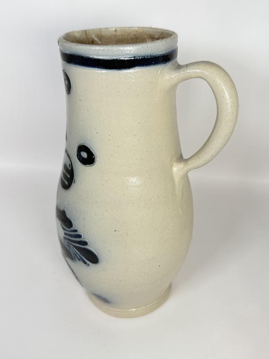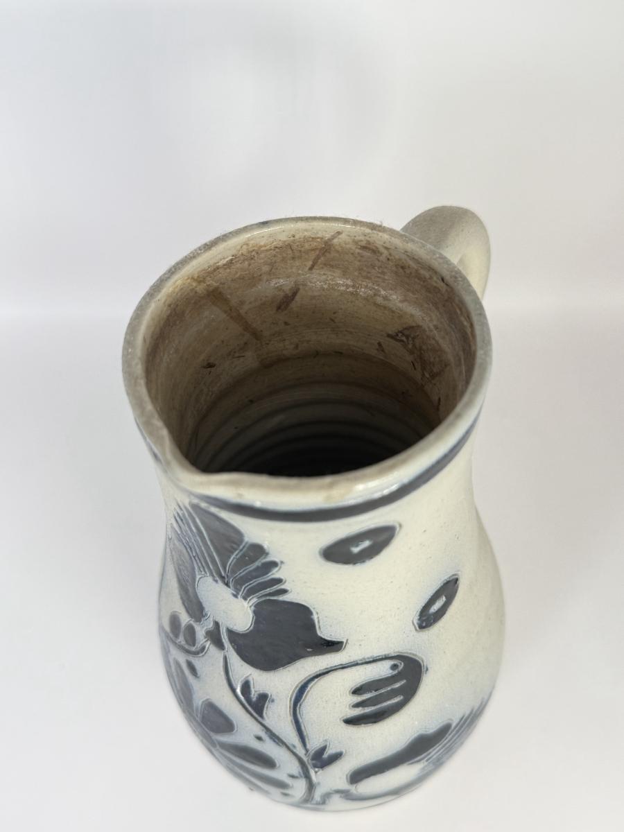 LOT 51F: Williamsburg Blur Stoneware Pottery Pitcher & Rustic Lynx Depologie Metal Pitcher w/ Dried Thistle