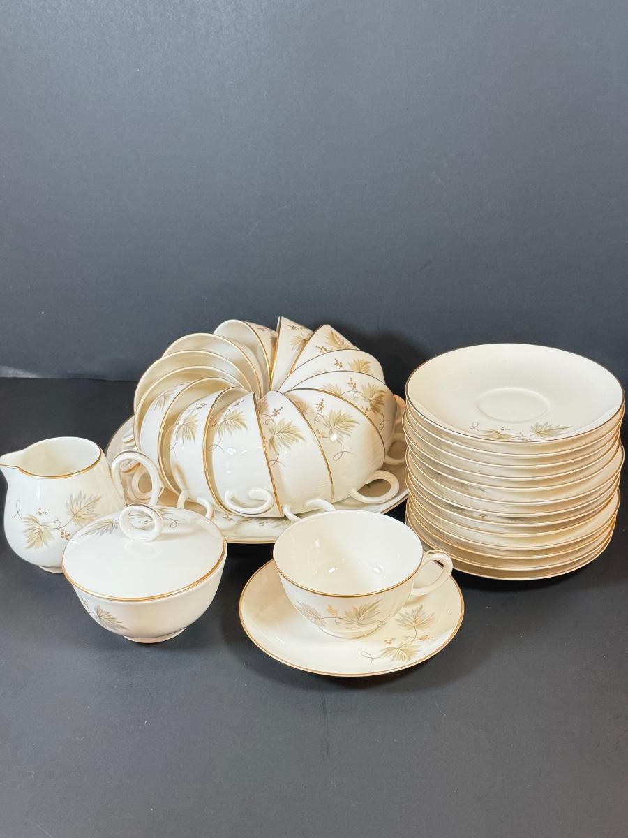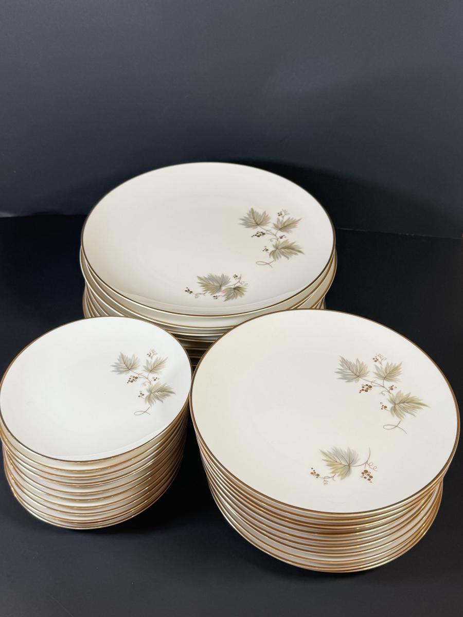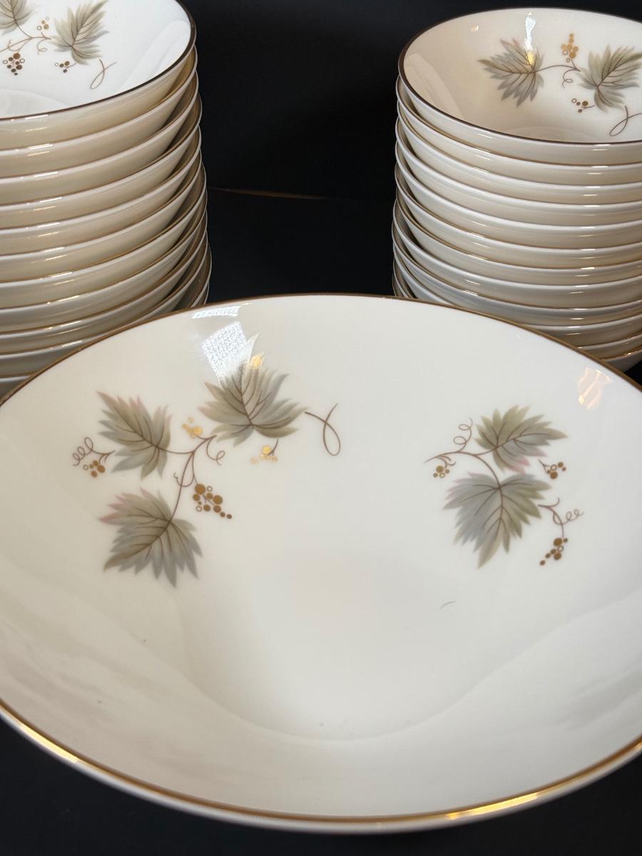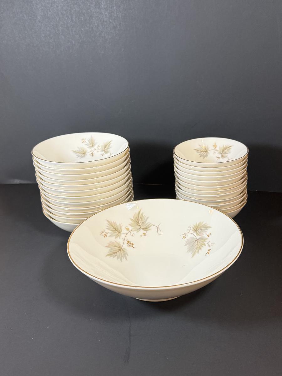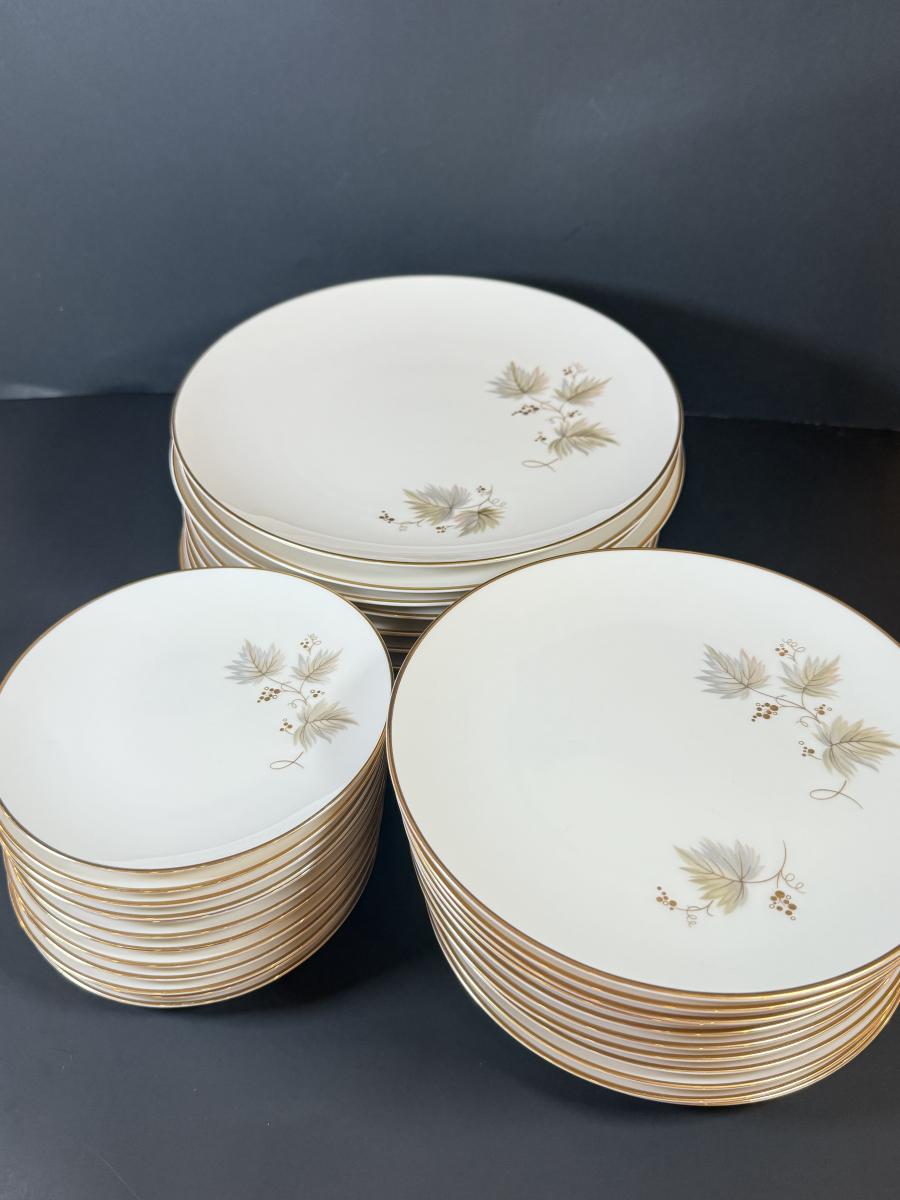 LOT 55F: Noritake Fantasia 7532 Pattern Ivory China Set: 3 sizes of Plates, 2 sizes of Bowls, Tea Cups & Saucers - Service for 12 plus Serving Dishes, Sugar Bowl & Creamer