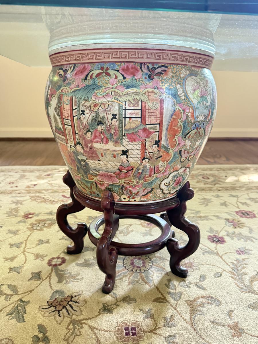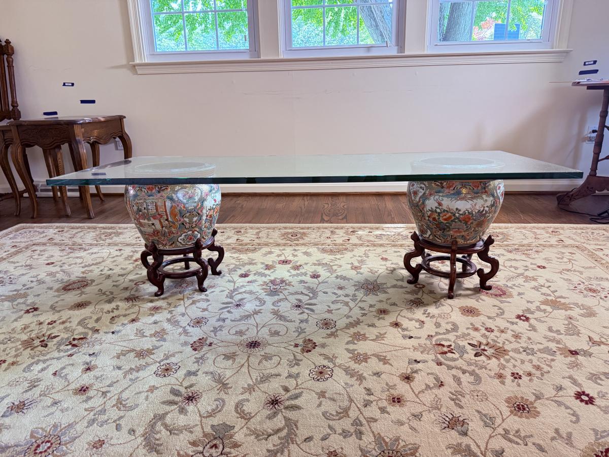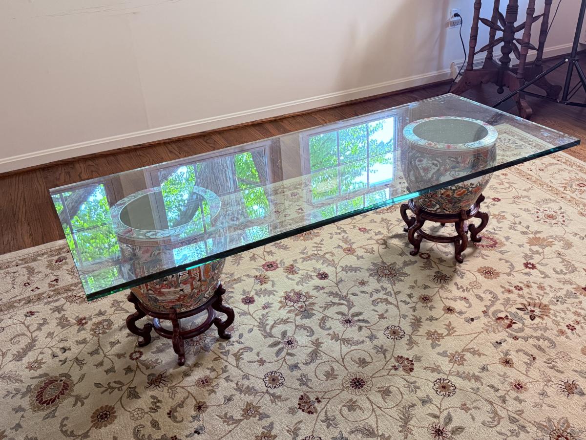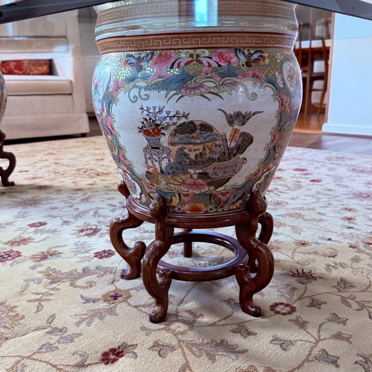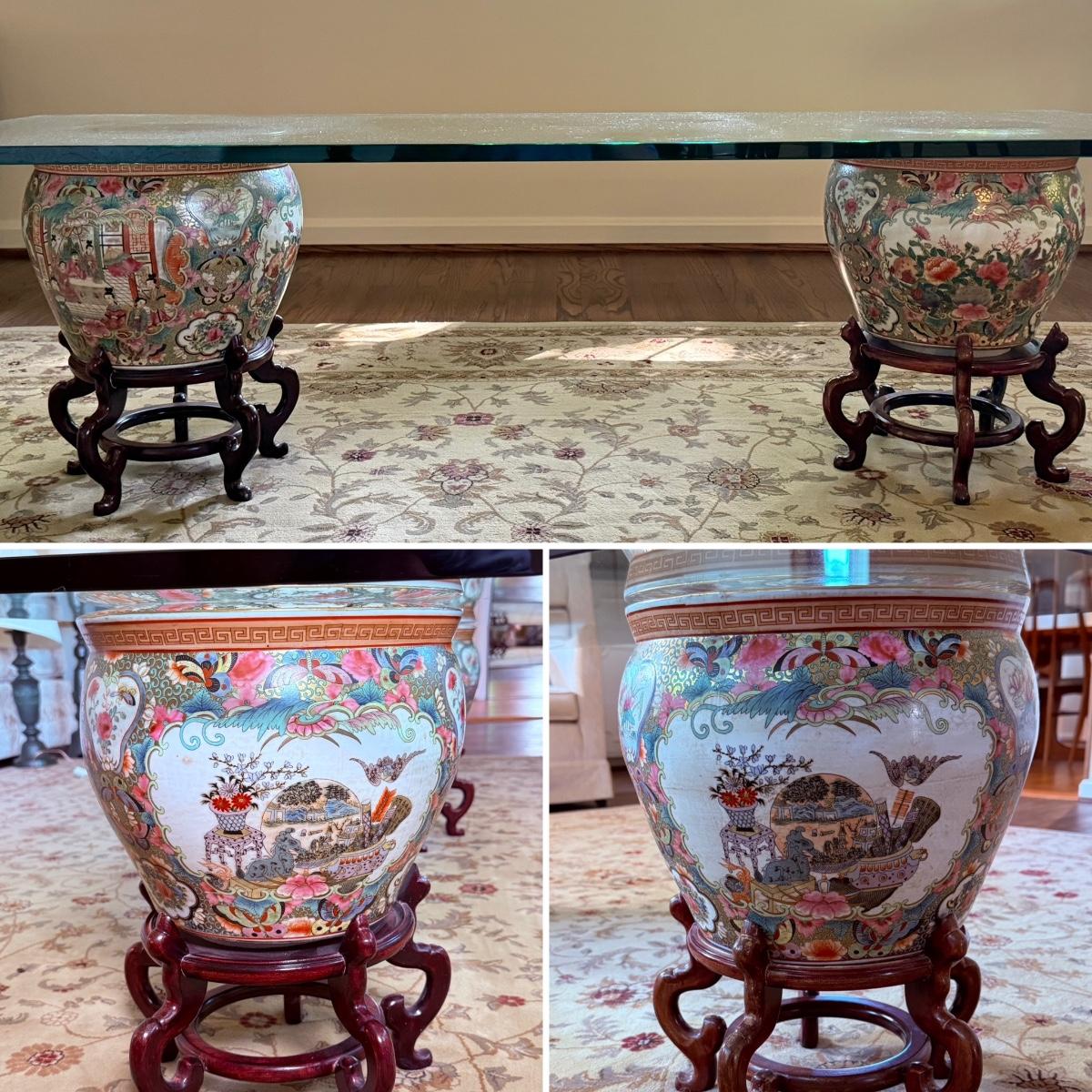 LOT 58F: Antique Koi Pots on Stands (one signed) w/ Thick Glass Table Top