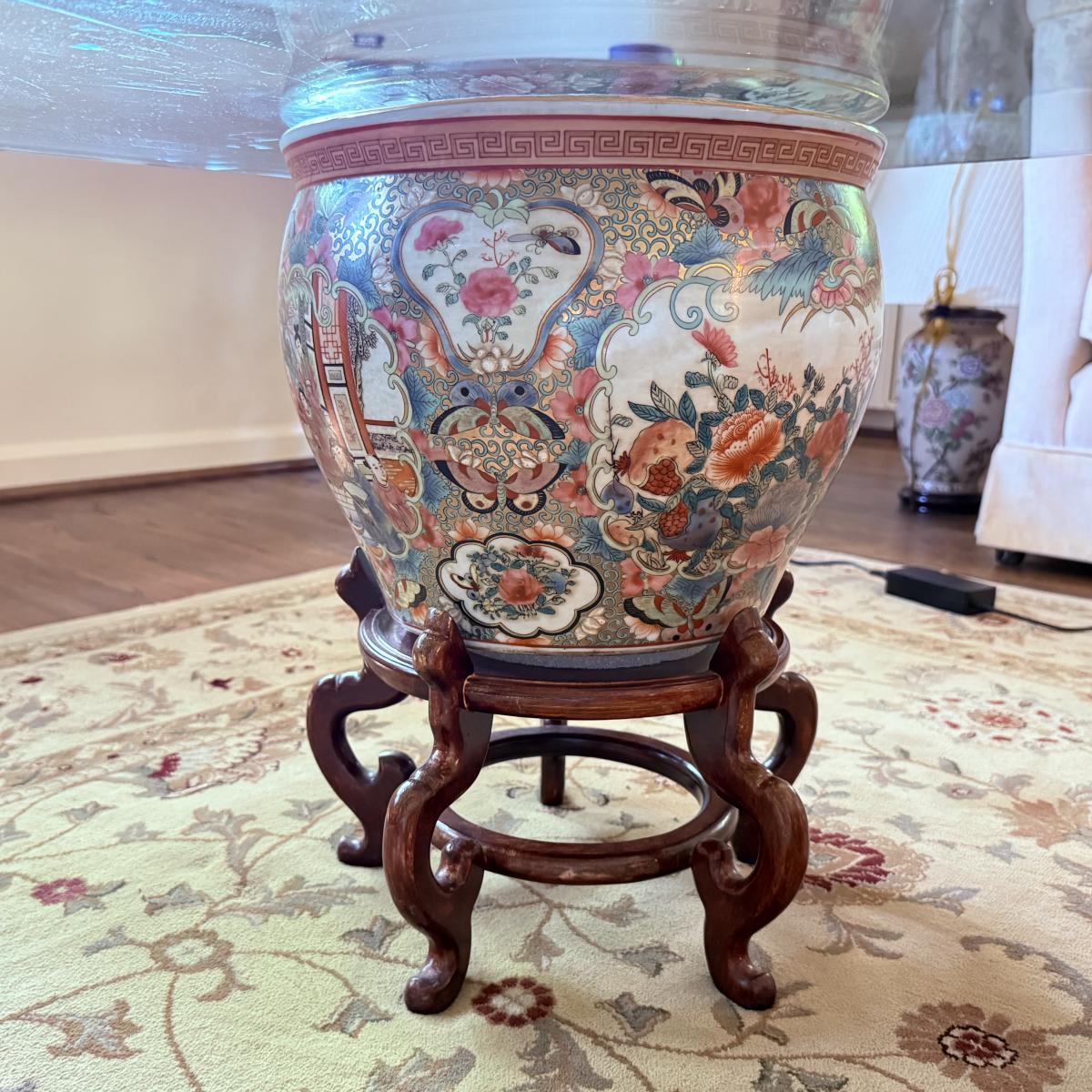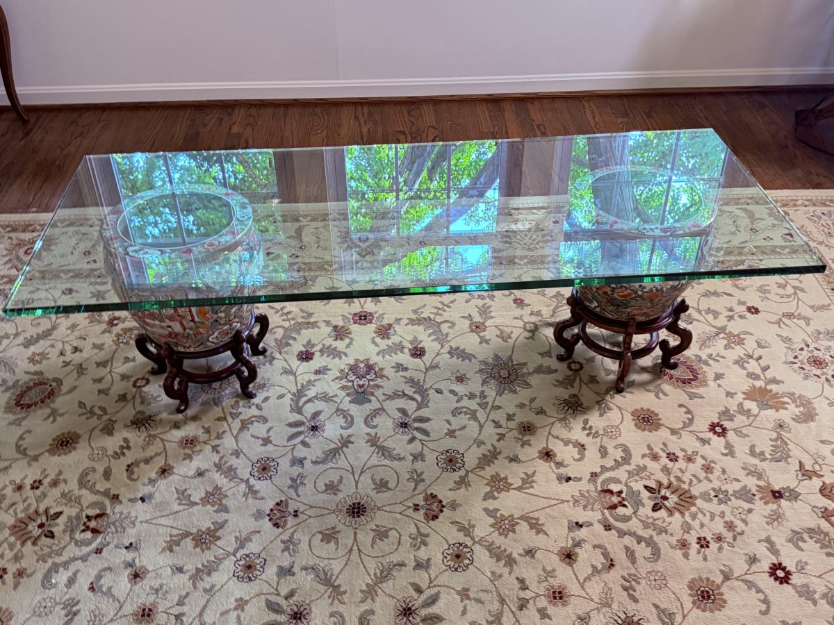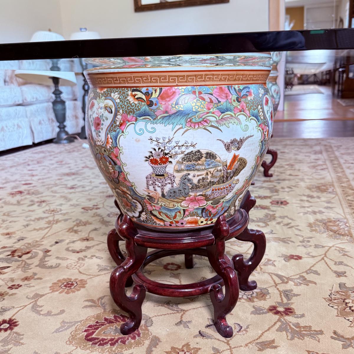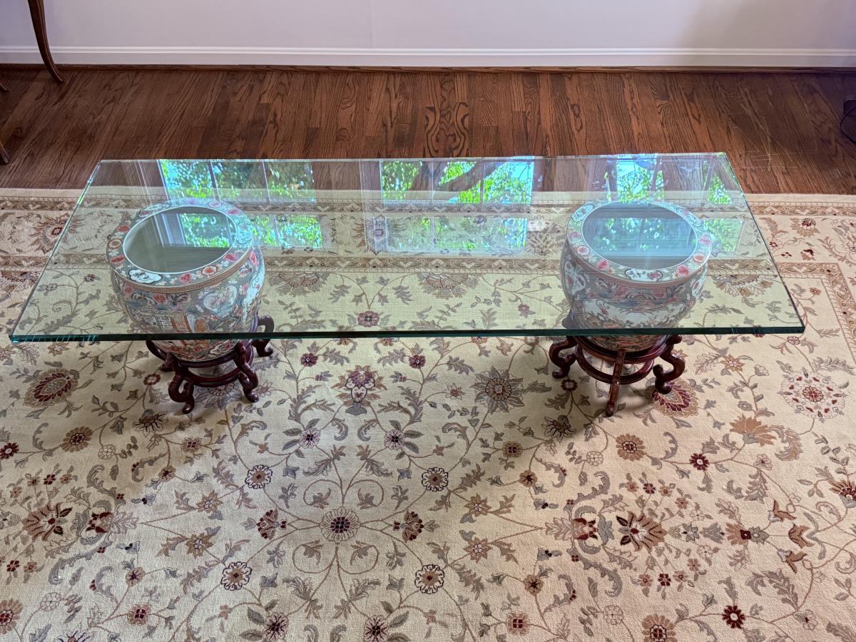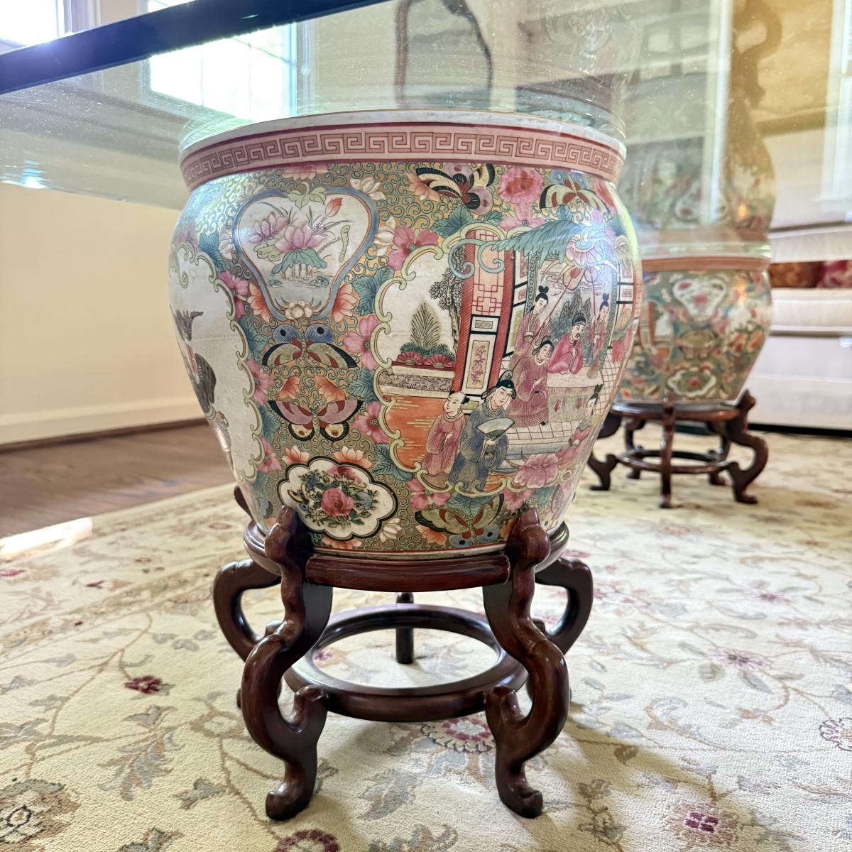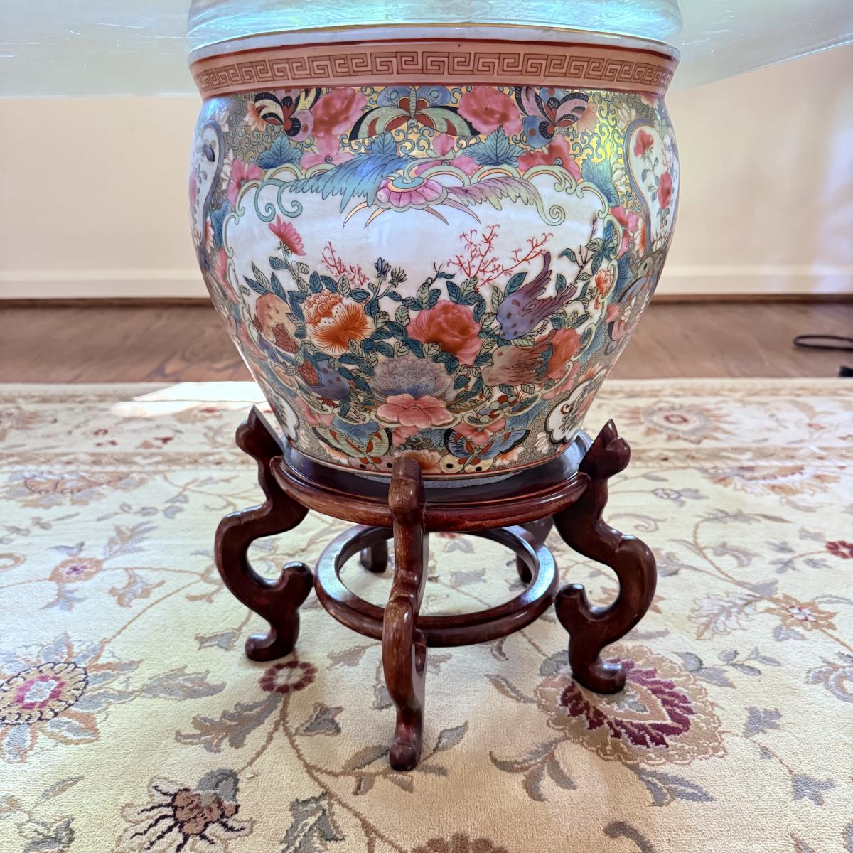 LOT 58F: Antique Koi Pots on Stands (one signed) w/ Thick Glass Table Top