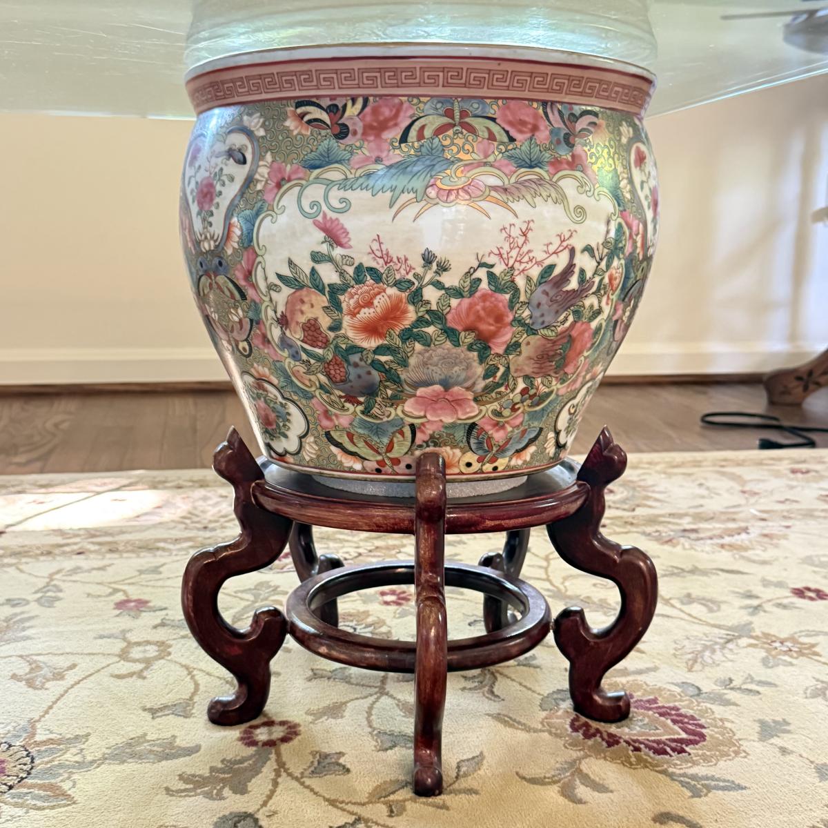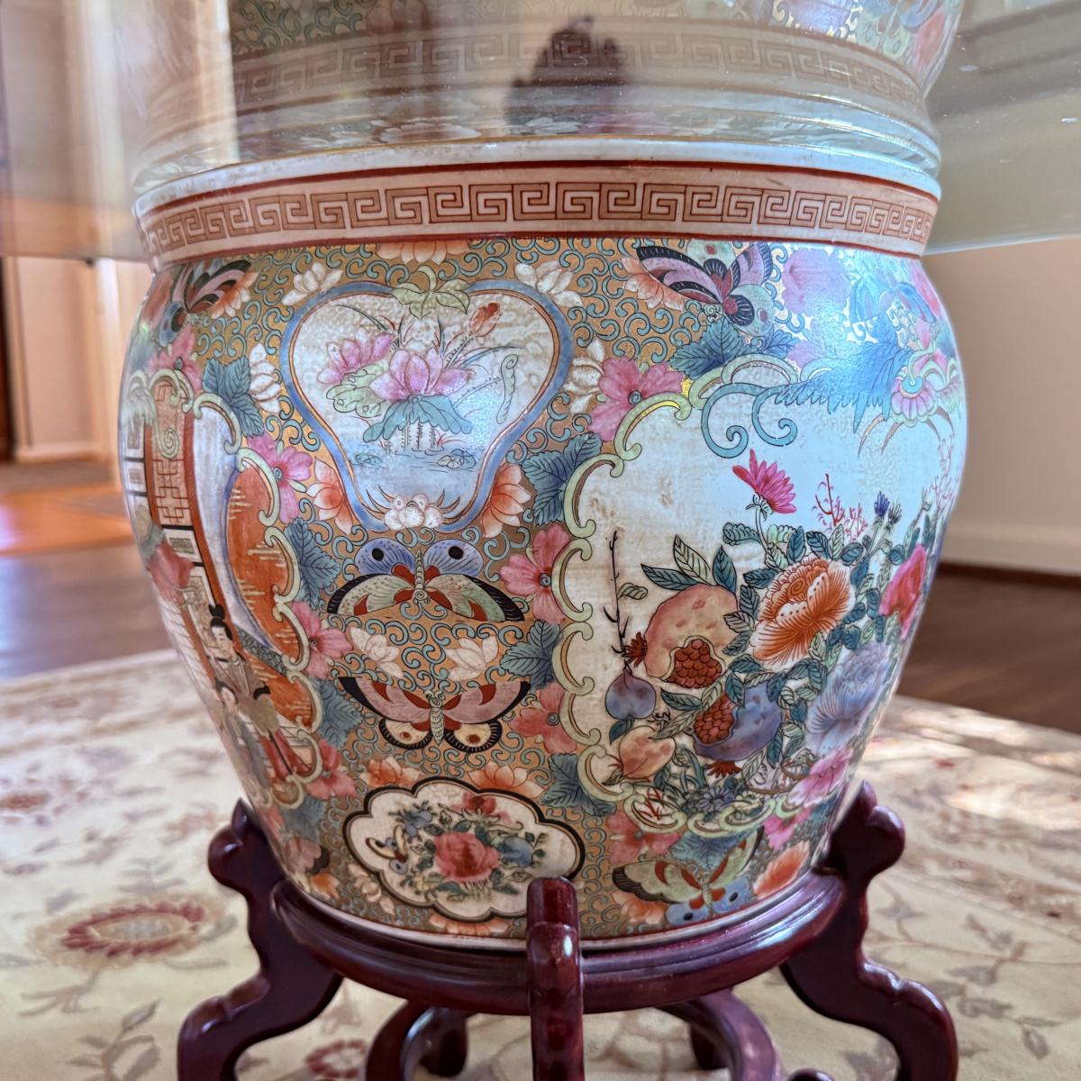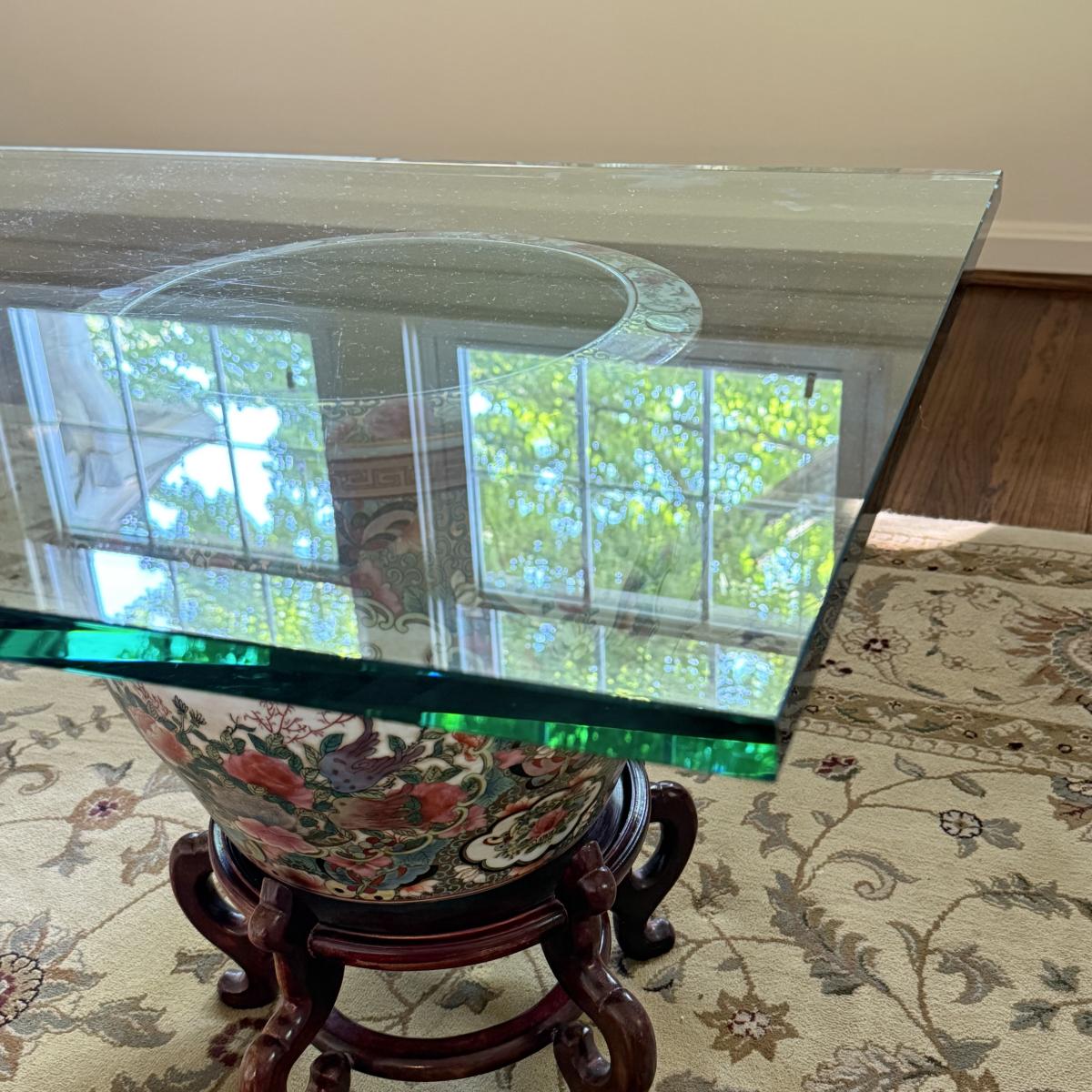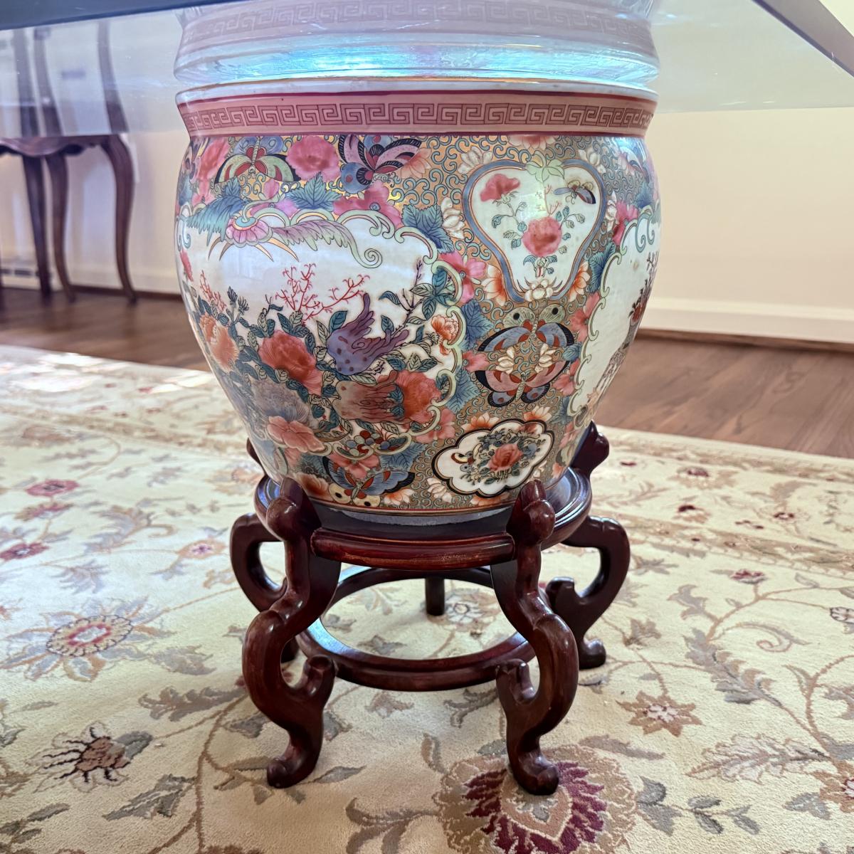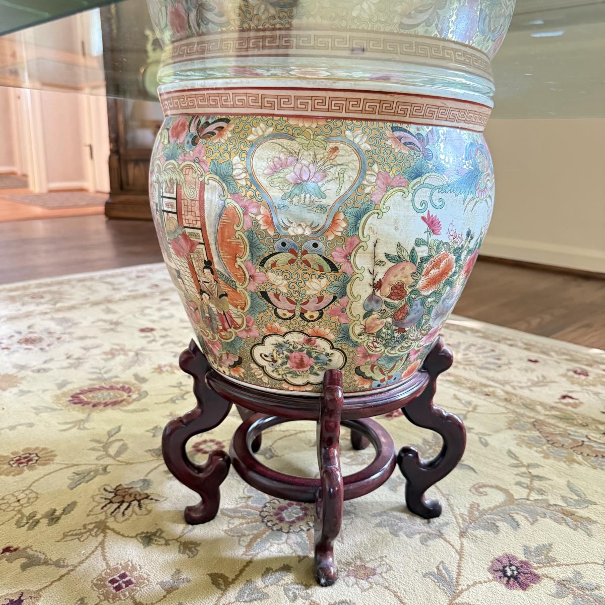 LOT 58F: Antique Koi Pots on Stands (one signed) w/ Thick Glass Table Top