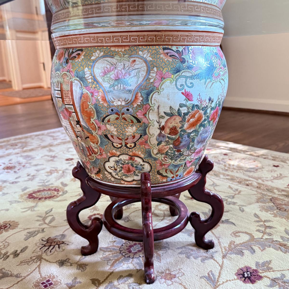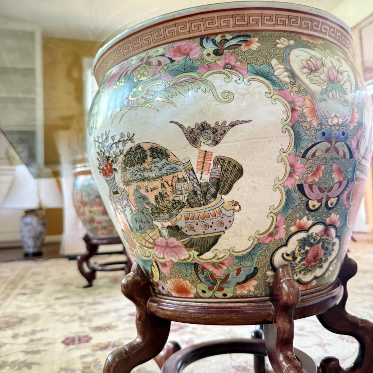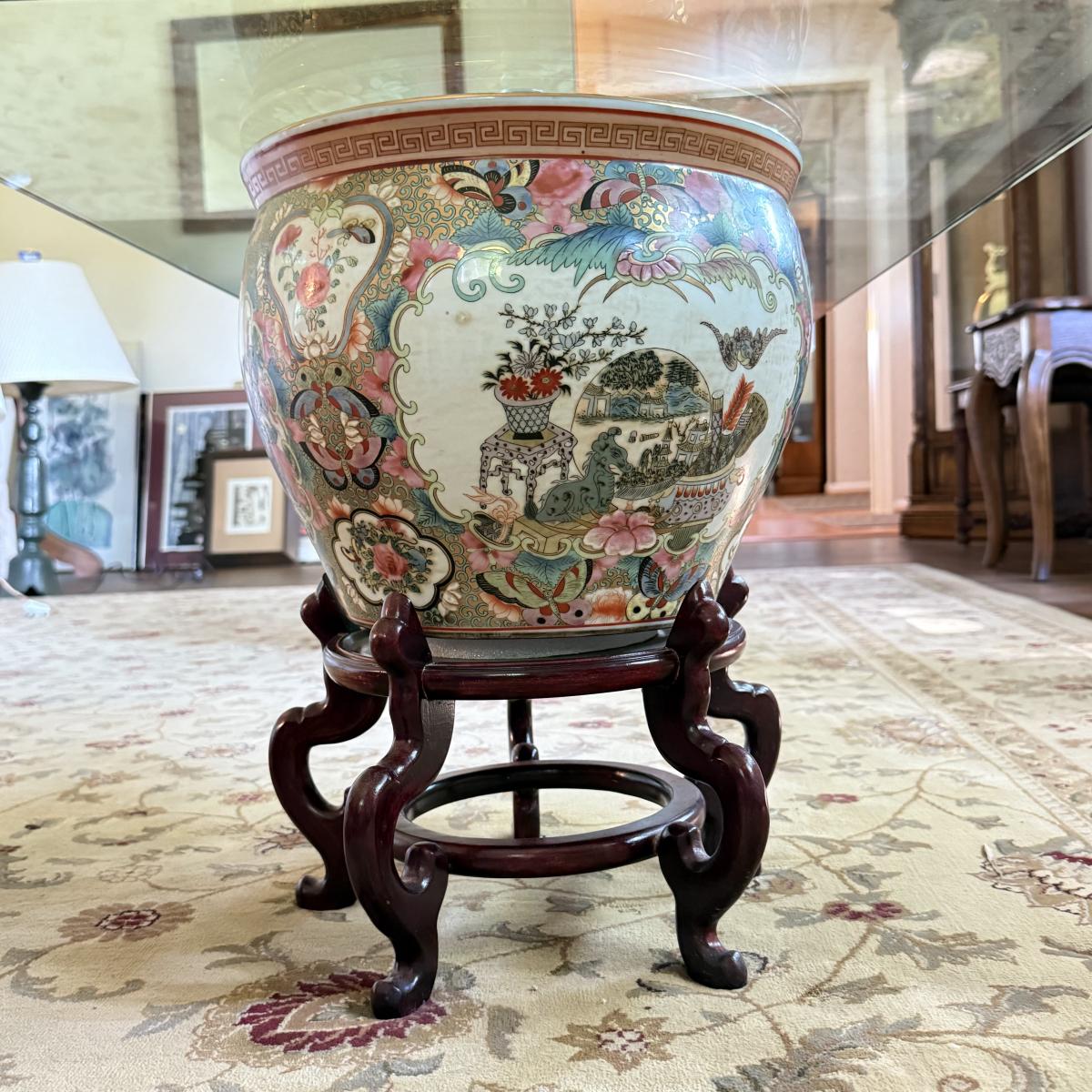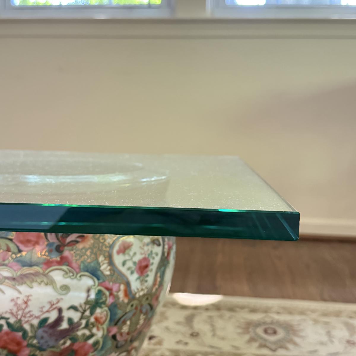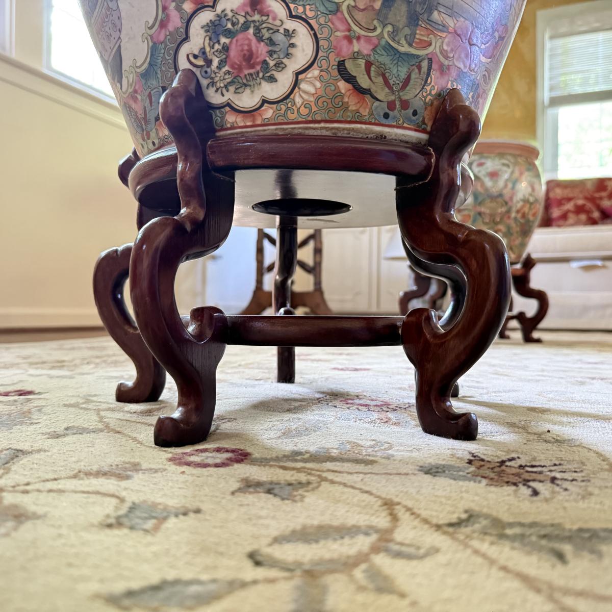LOT 58F: Antique Koi Pots on Stands (one signed) w/ Thick Glass Table Top
