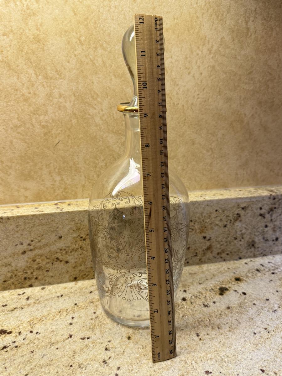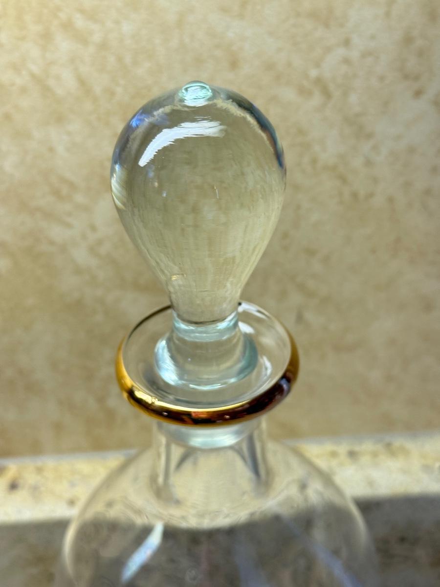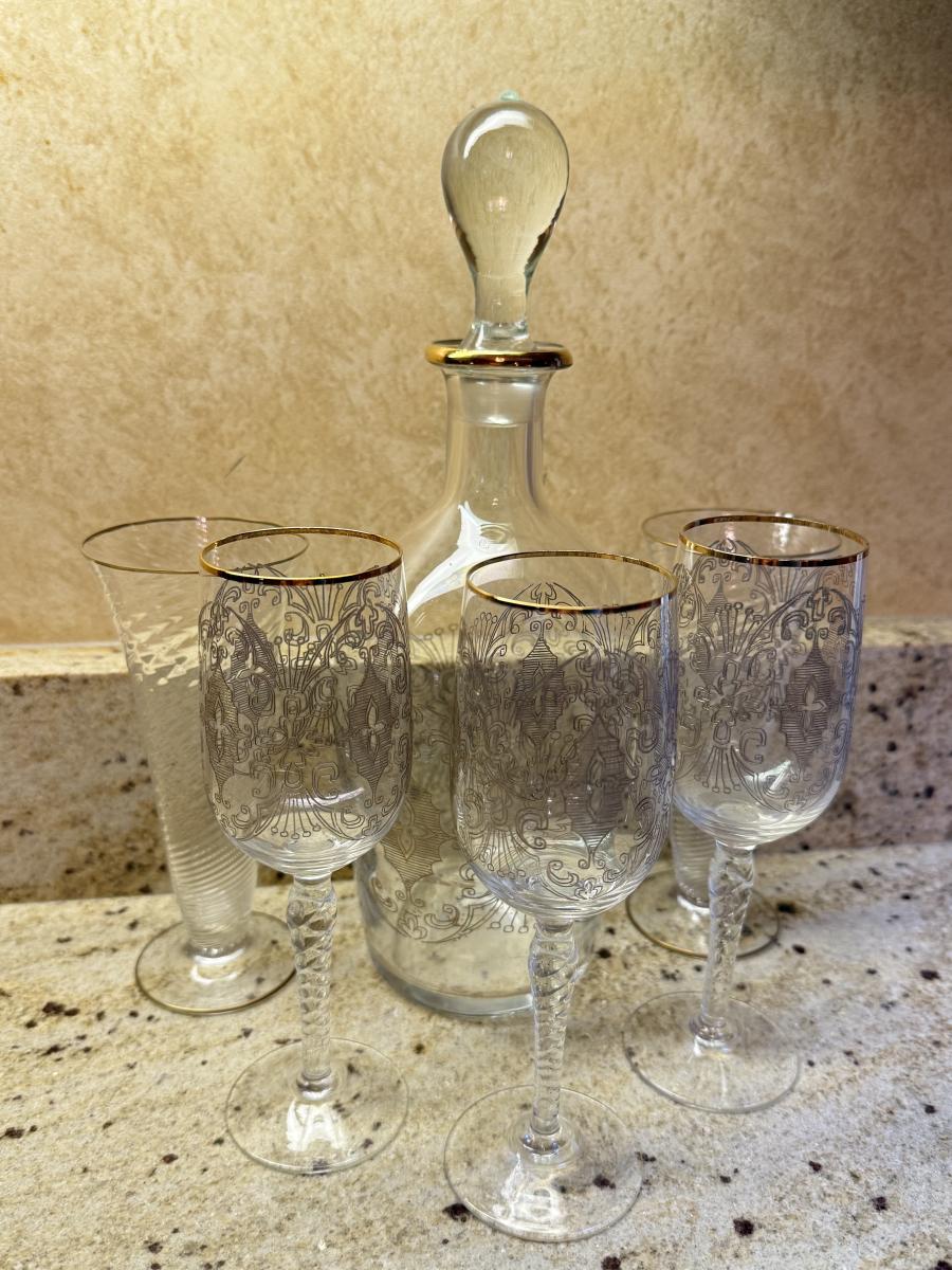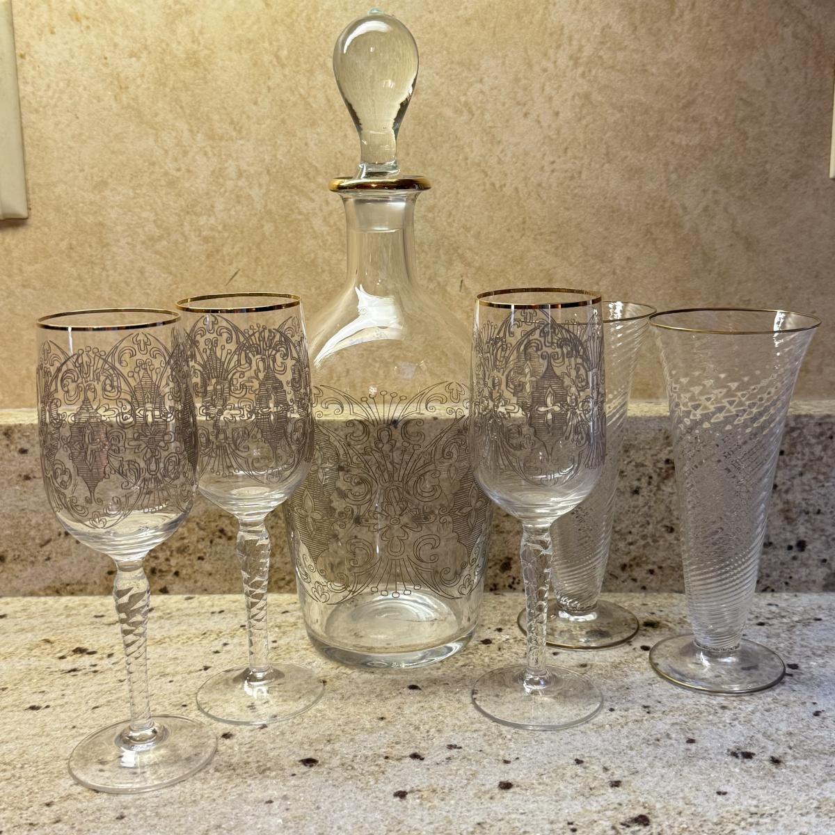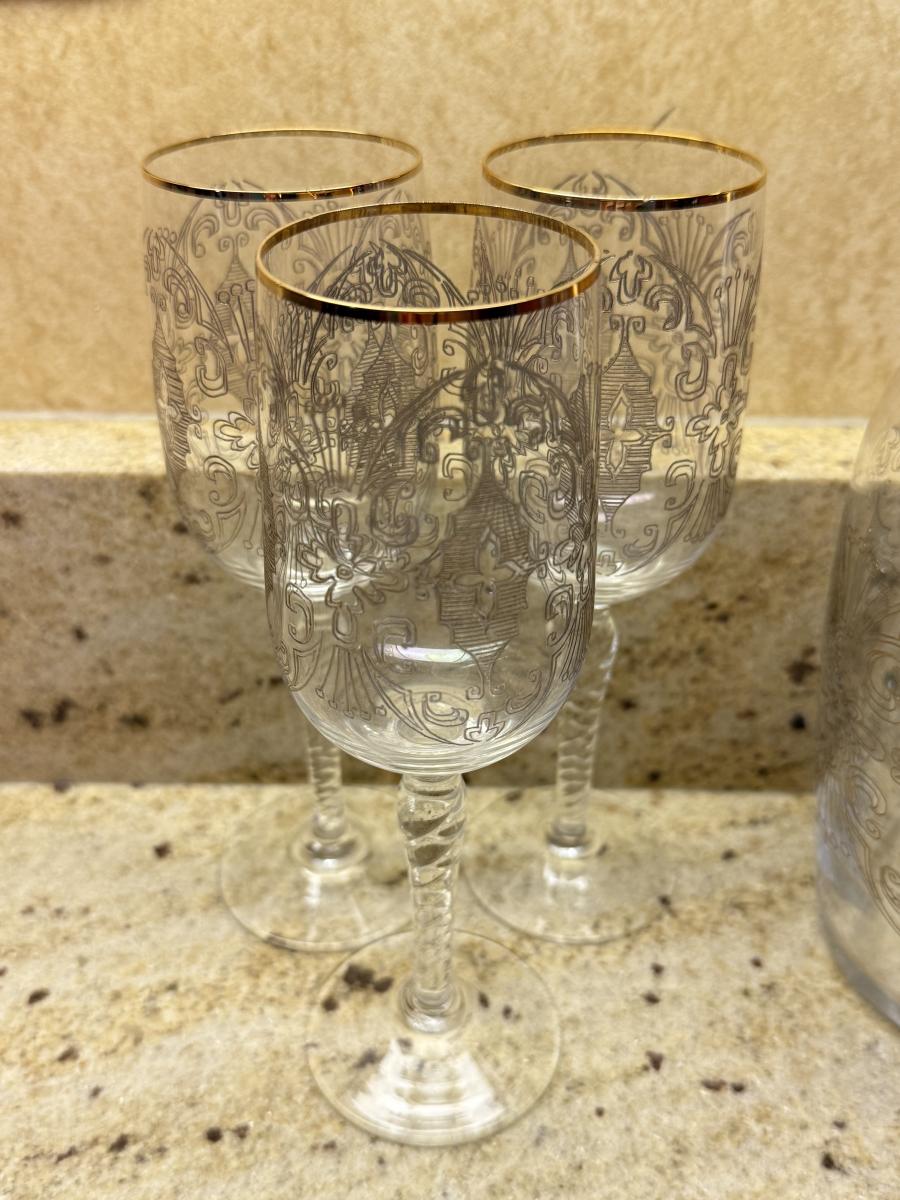 LOT 109K: Gold Rim Decanter w/ 3 Matching Wine Glasses & More