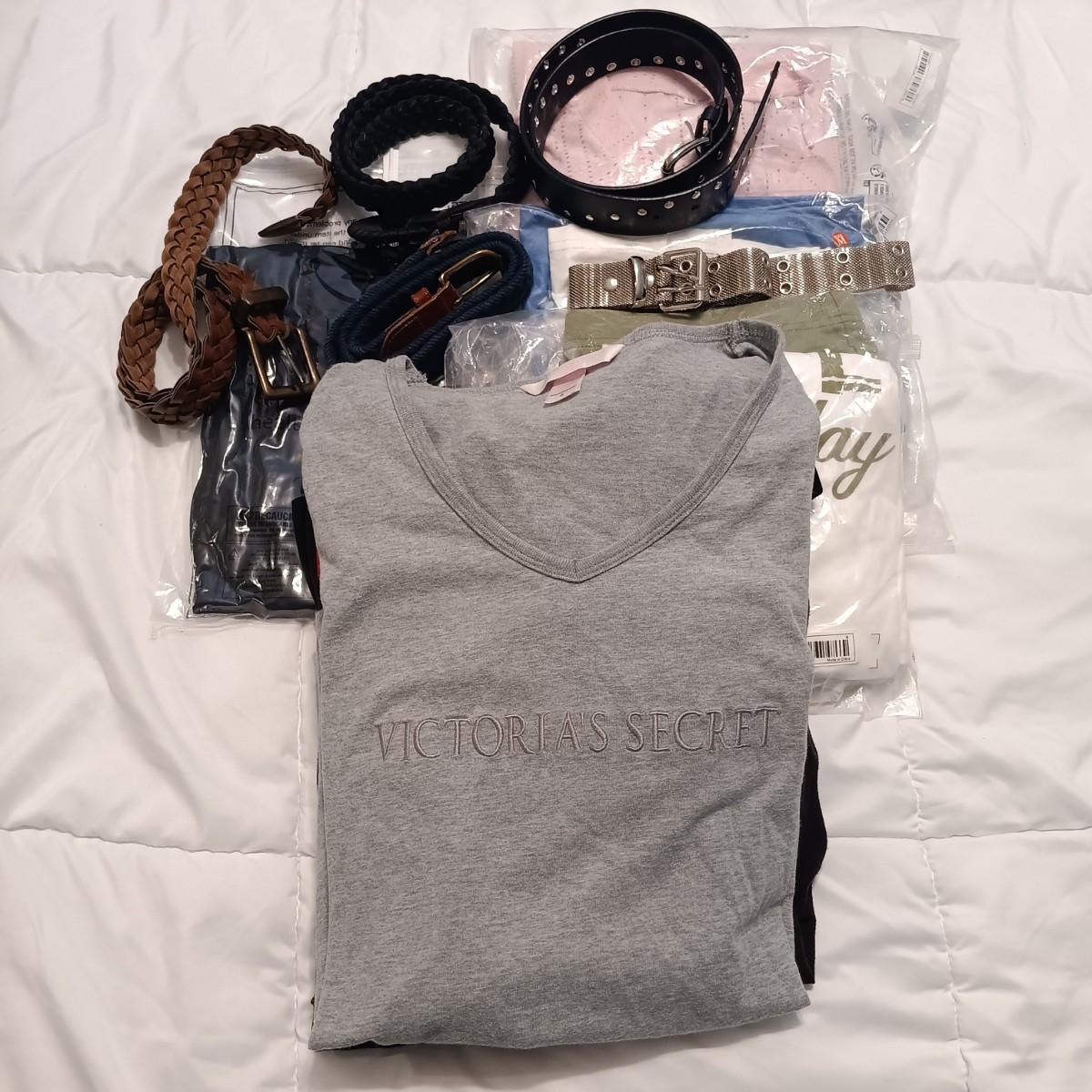 LOT 17: New in Bag Women's Medium Clothing Set with Preowned Victoria Secret Shirts & Various Belts