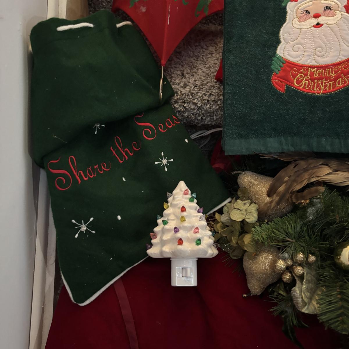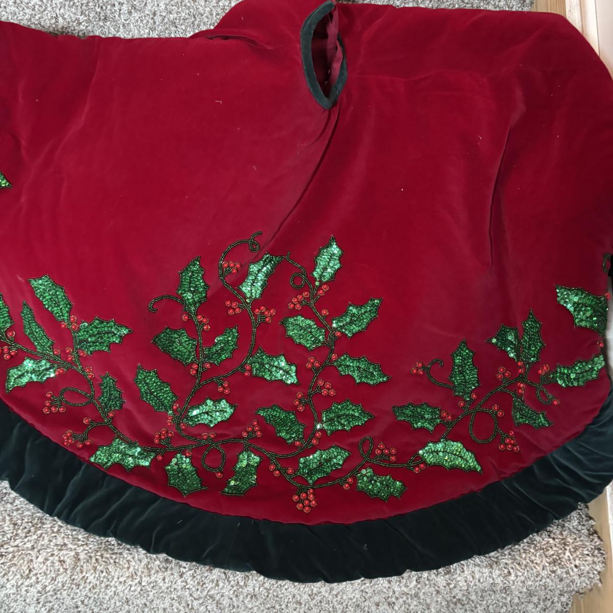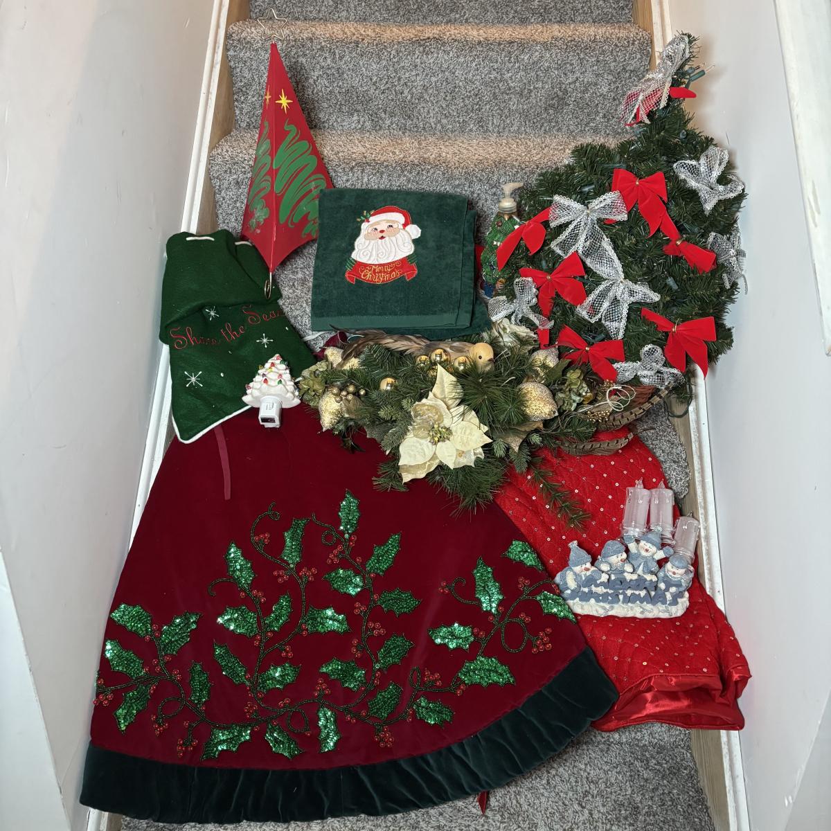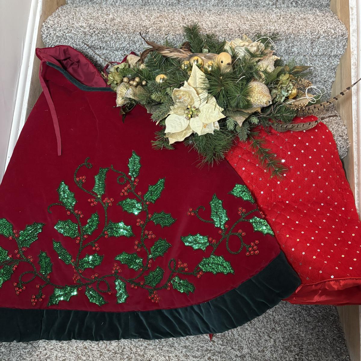 LOT 28: Holiday Decor: Sequined Tree Skirts, Center Piece, Fabric Tree Lamp and More