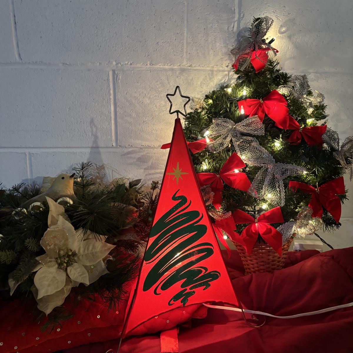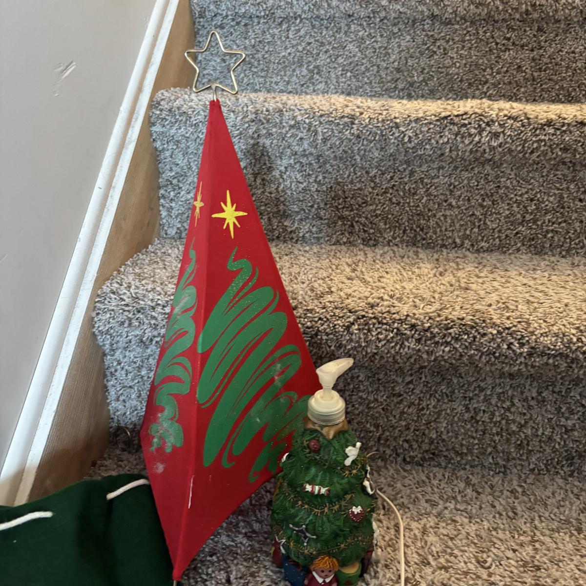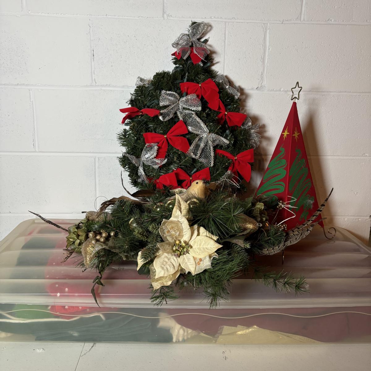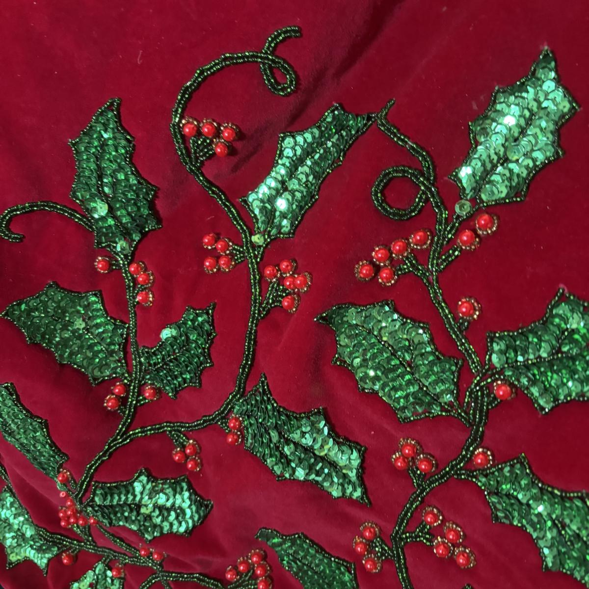 LOT 28: Holiday Decor: Sequined Tree Skirts, Center Piece, Fabric Tree Lamp and More