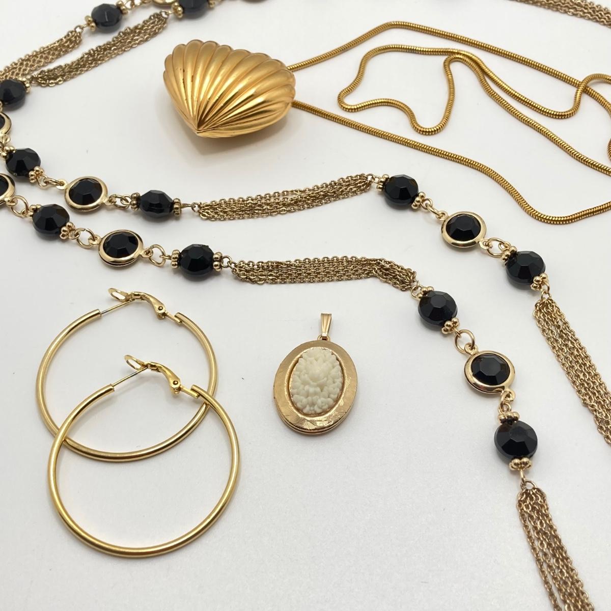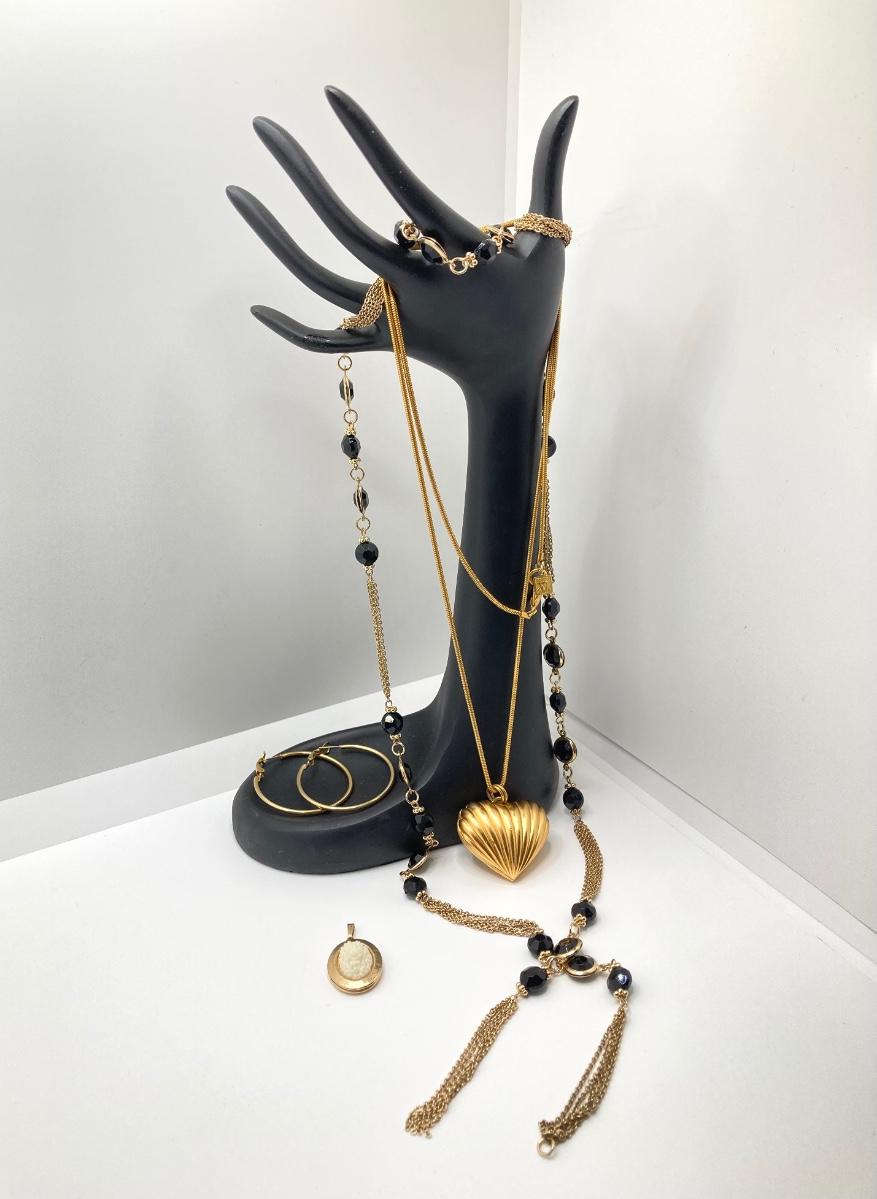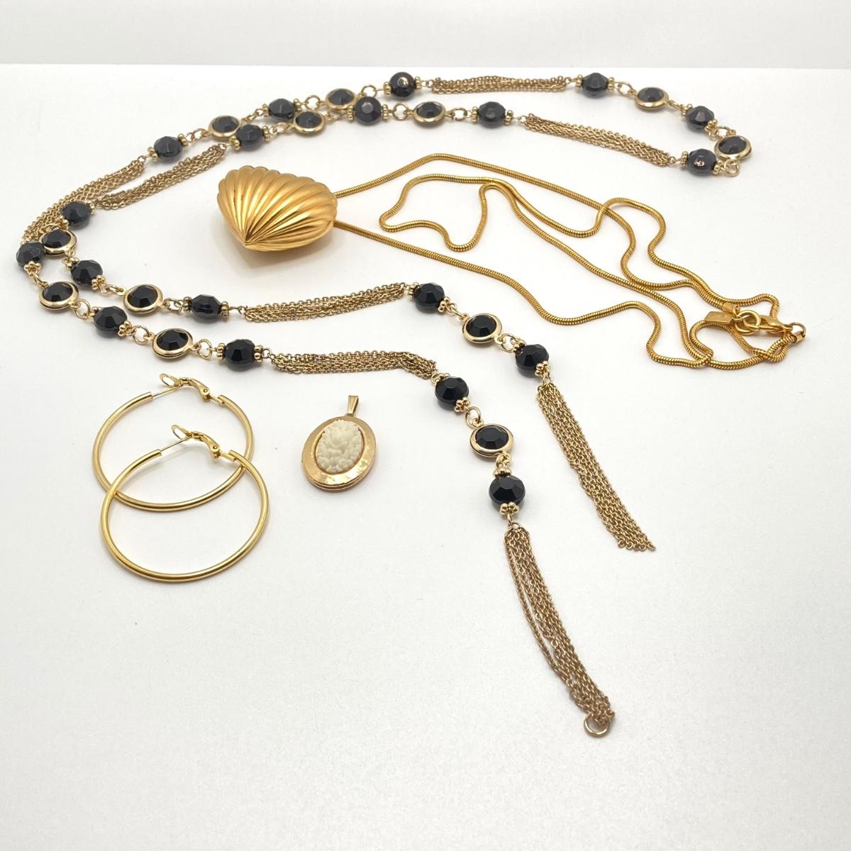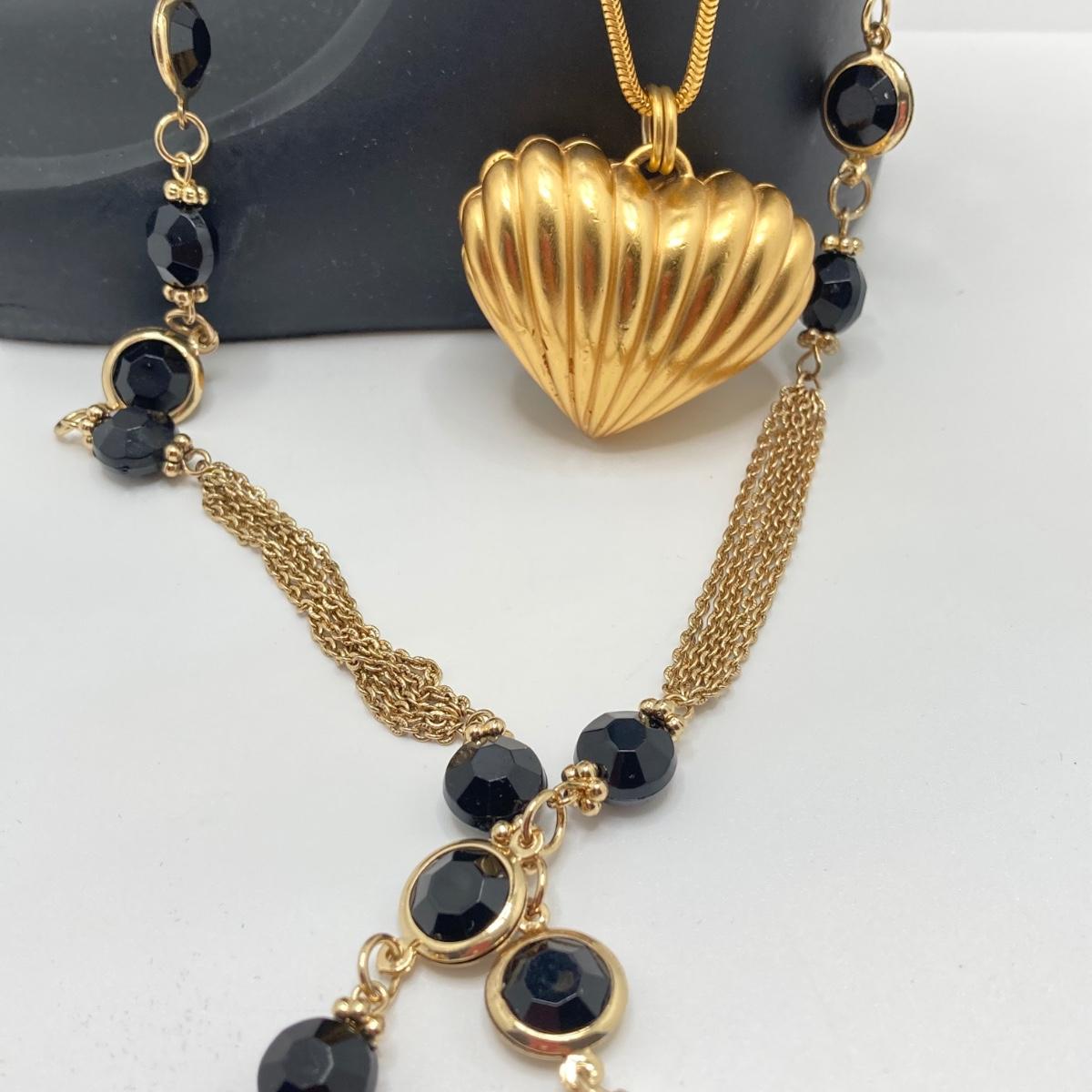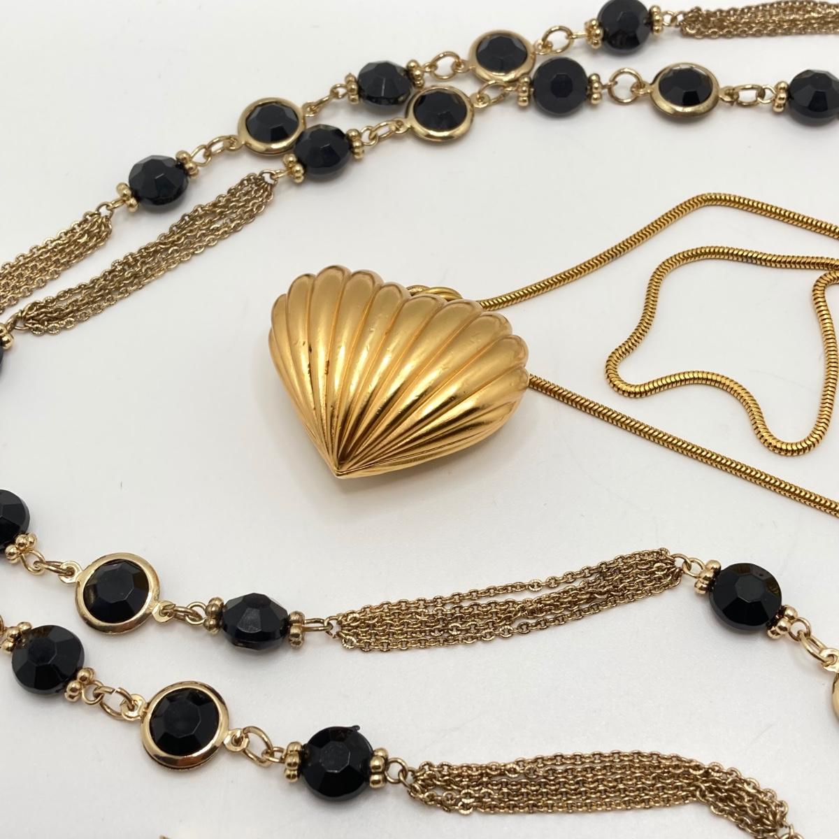 LOT 58: Fashion Jewelry - Anne Klein Puffy Gold Tone Heart Pendant Necklace, Lariat Gold Tone and BlackBead Chain, Locket Pendant and more