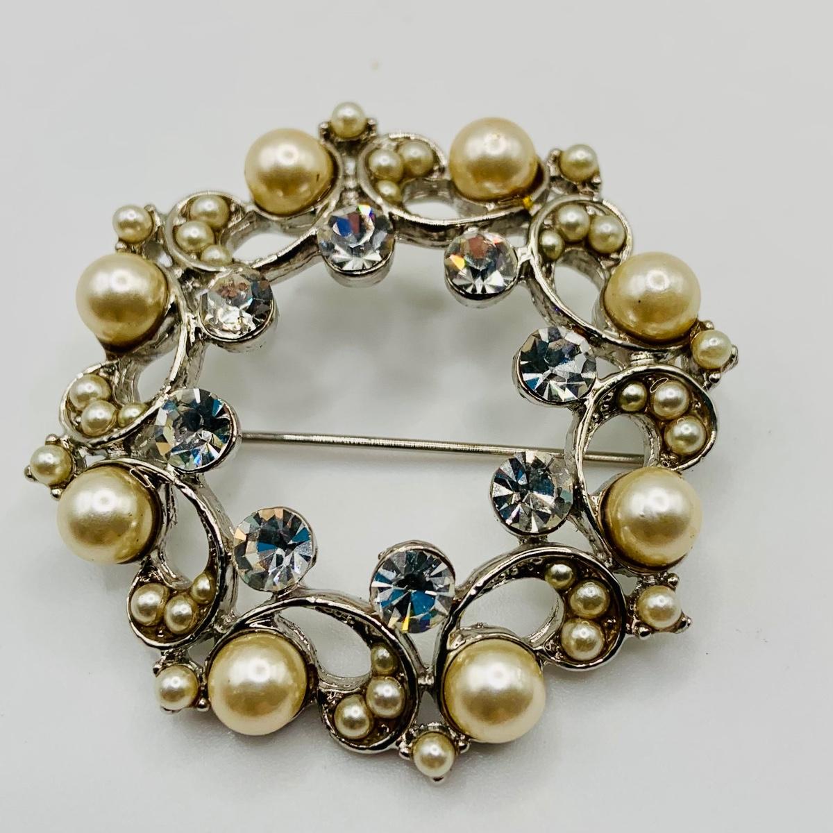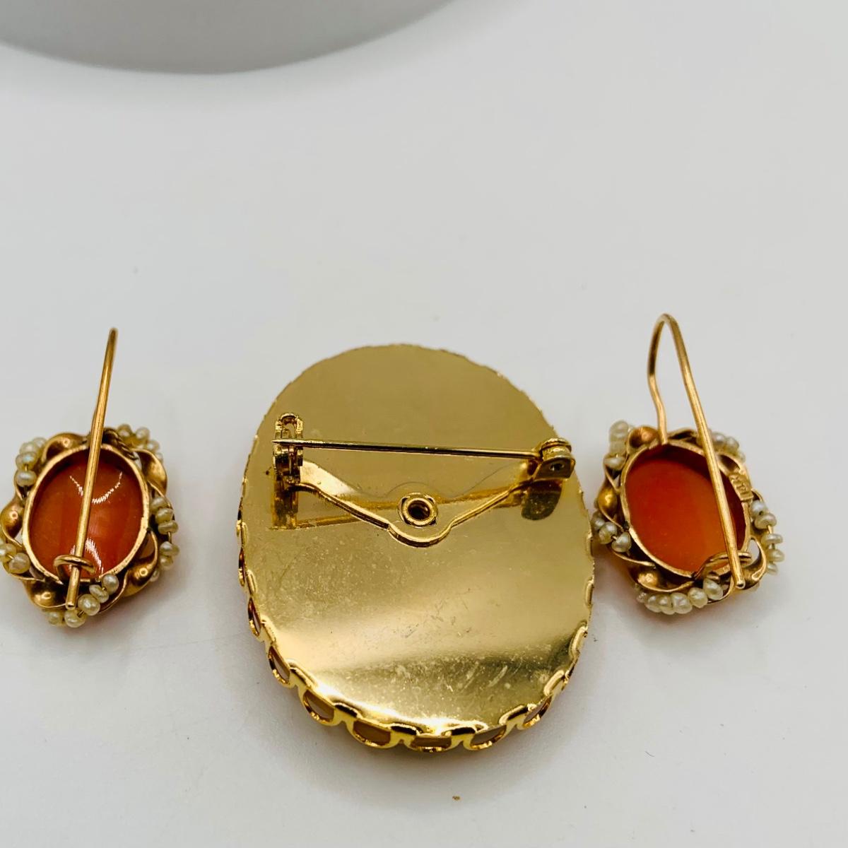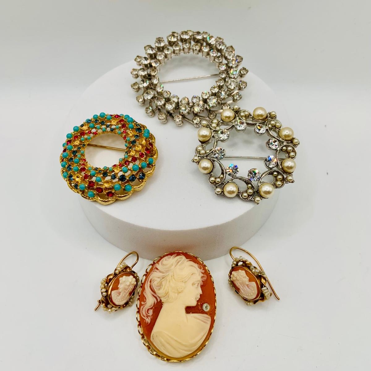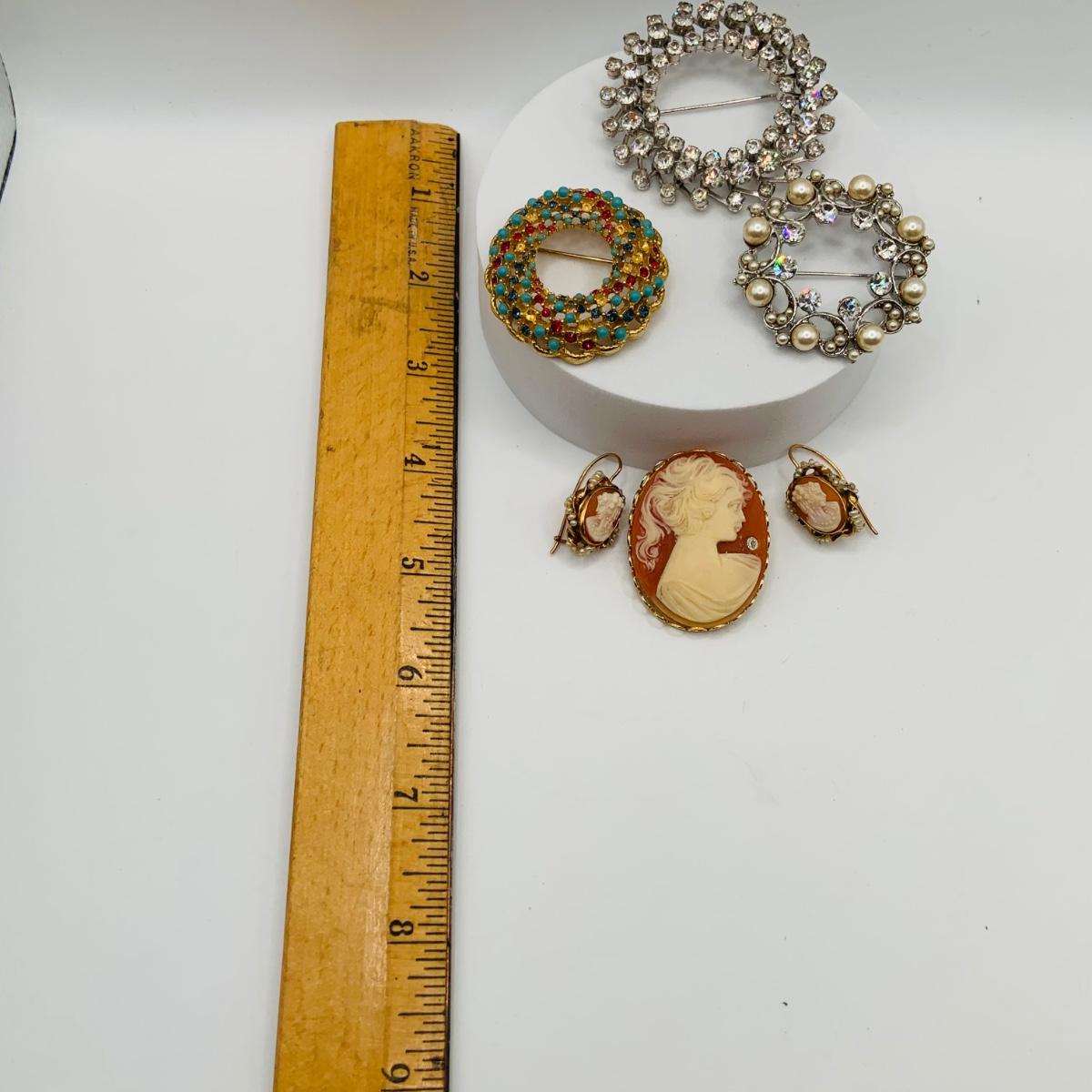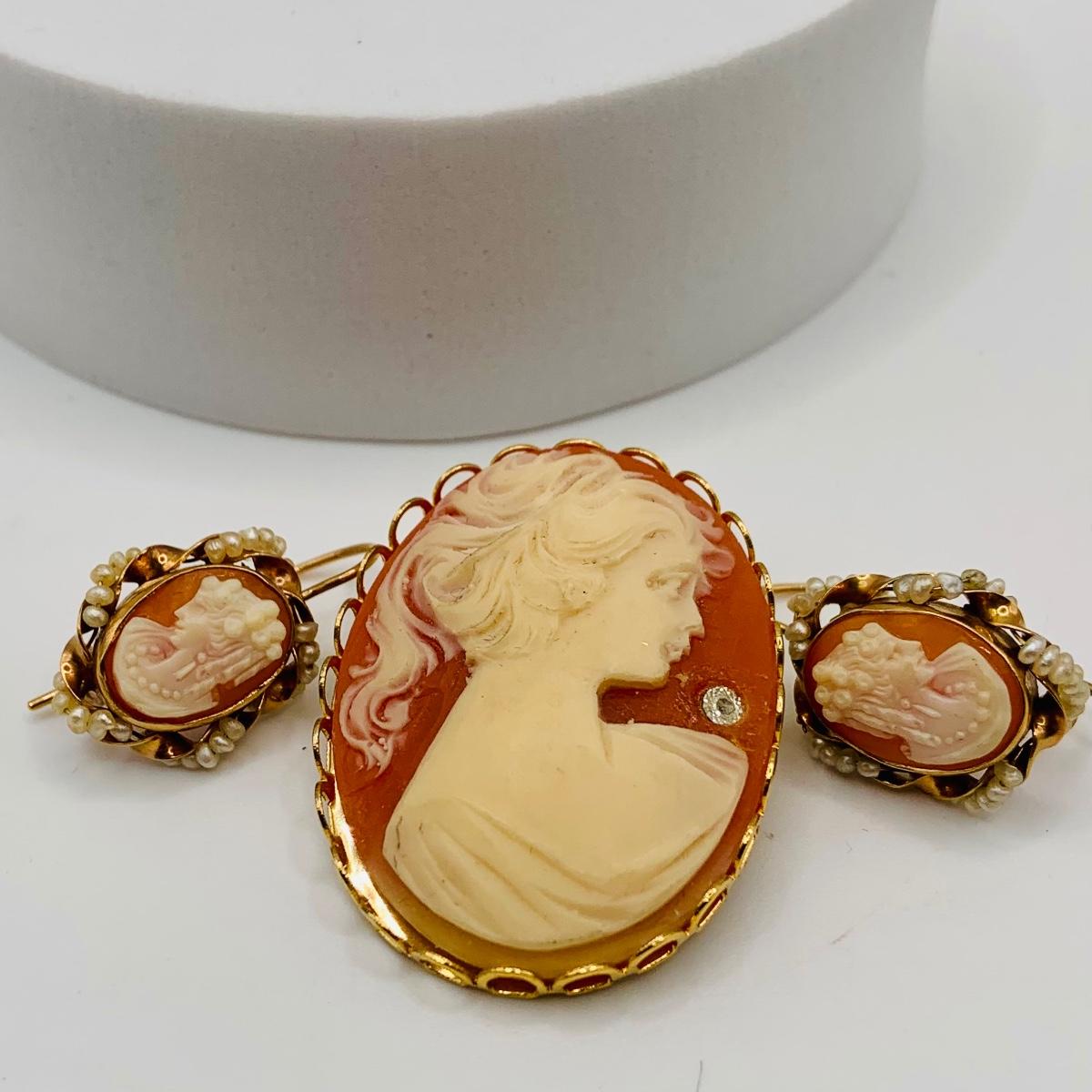 LOT 75: Beautiful 14K Gold Cameo & Seed Pearl Pierced Earrings along with Vintage Brooches