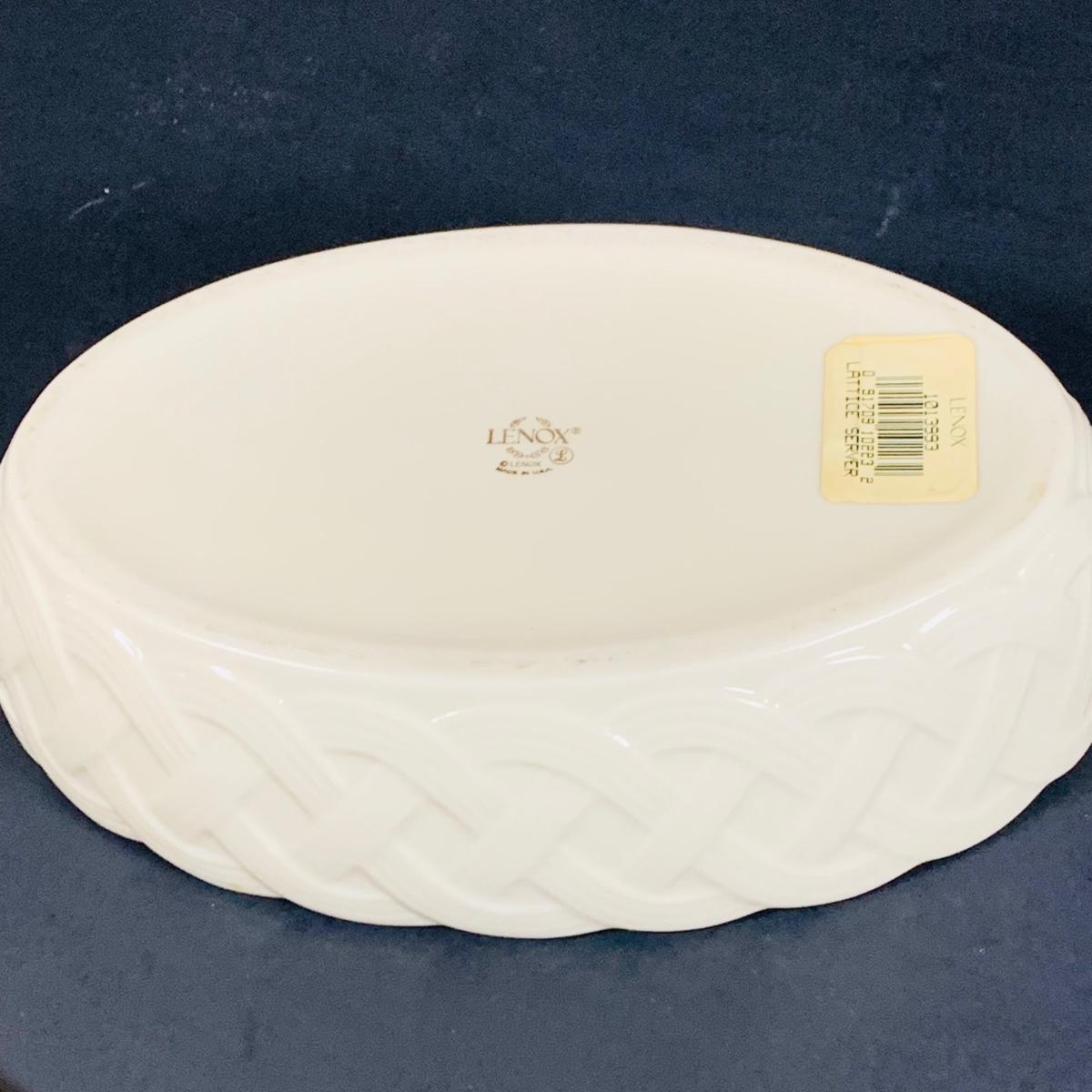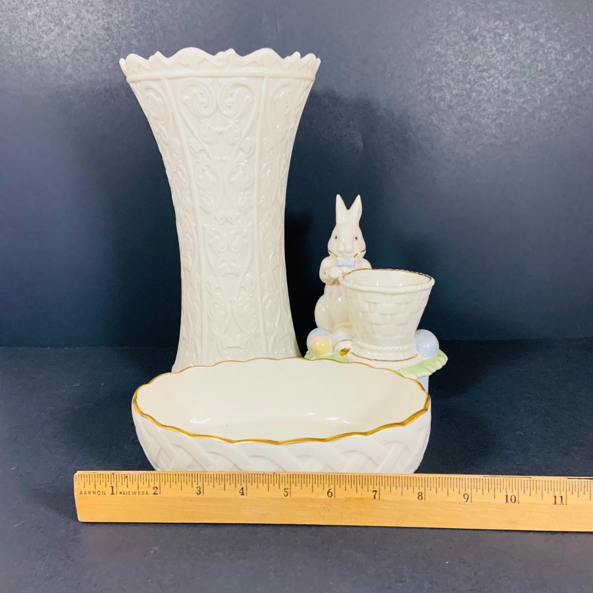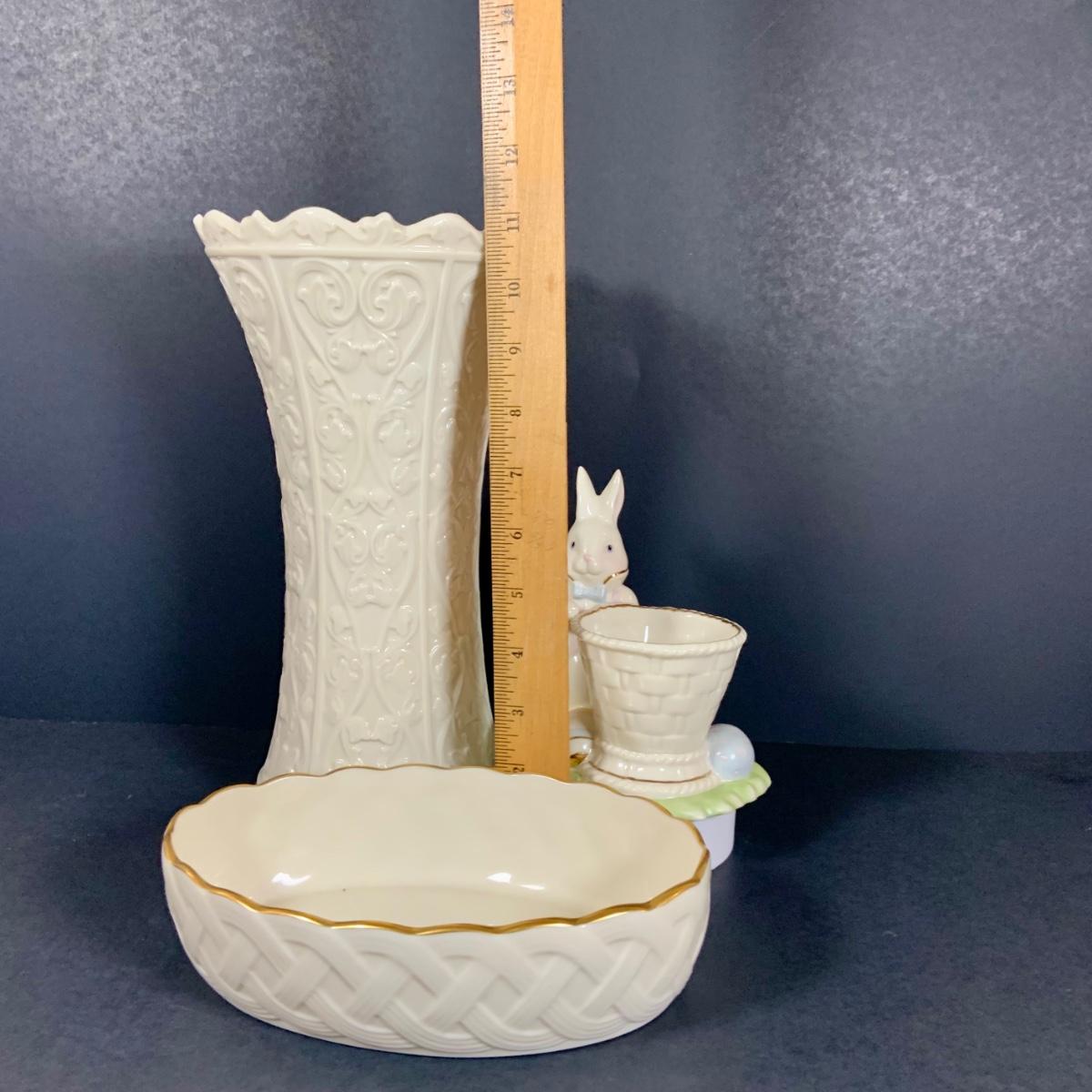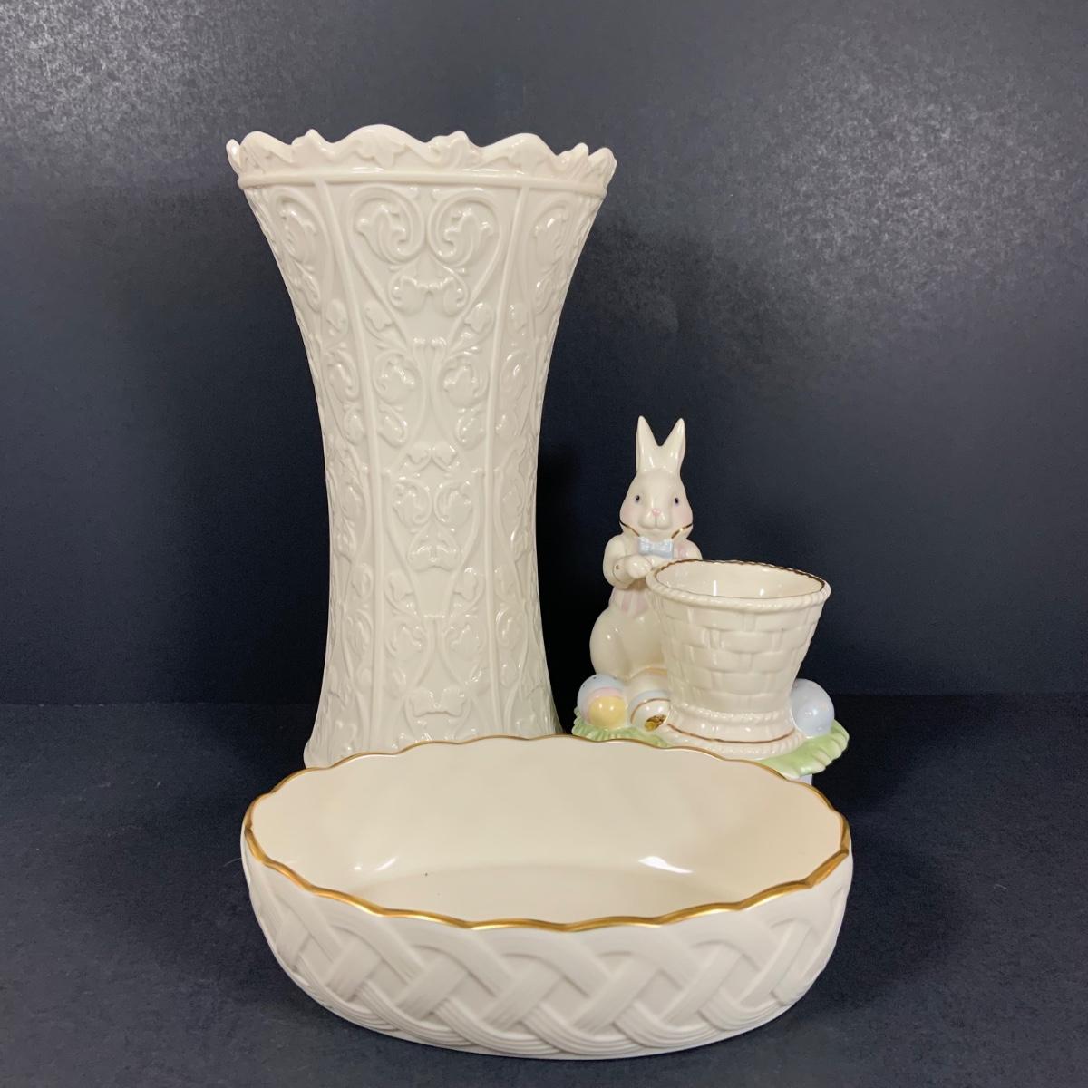 LOT 202: Tall Lenox Wentworth Vase, Lenox Lattice Oval Server and Lenox Easter Bunny Votive Candle Holder