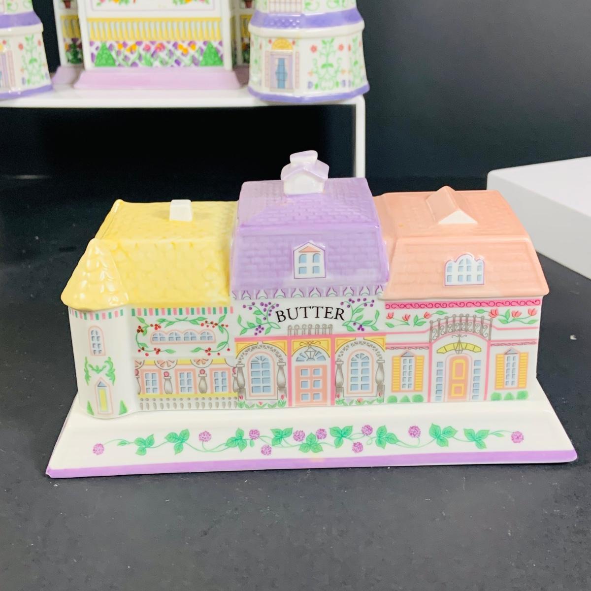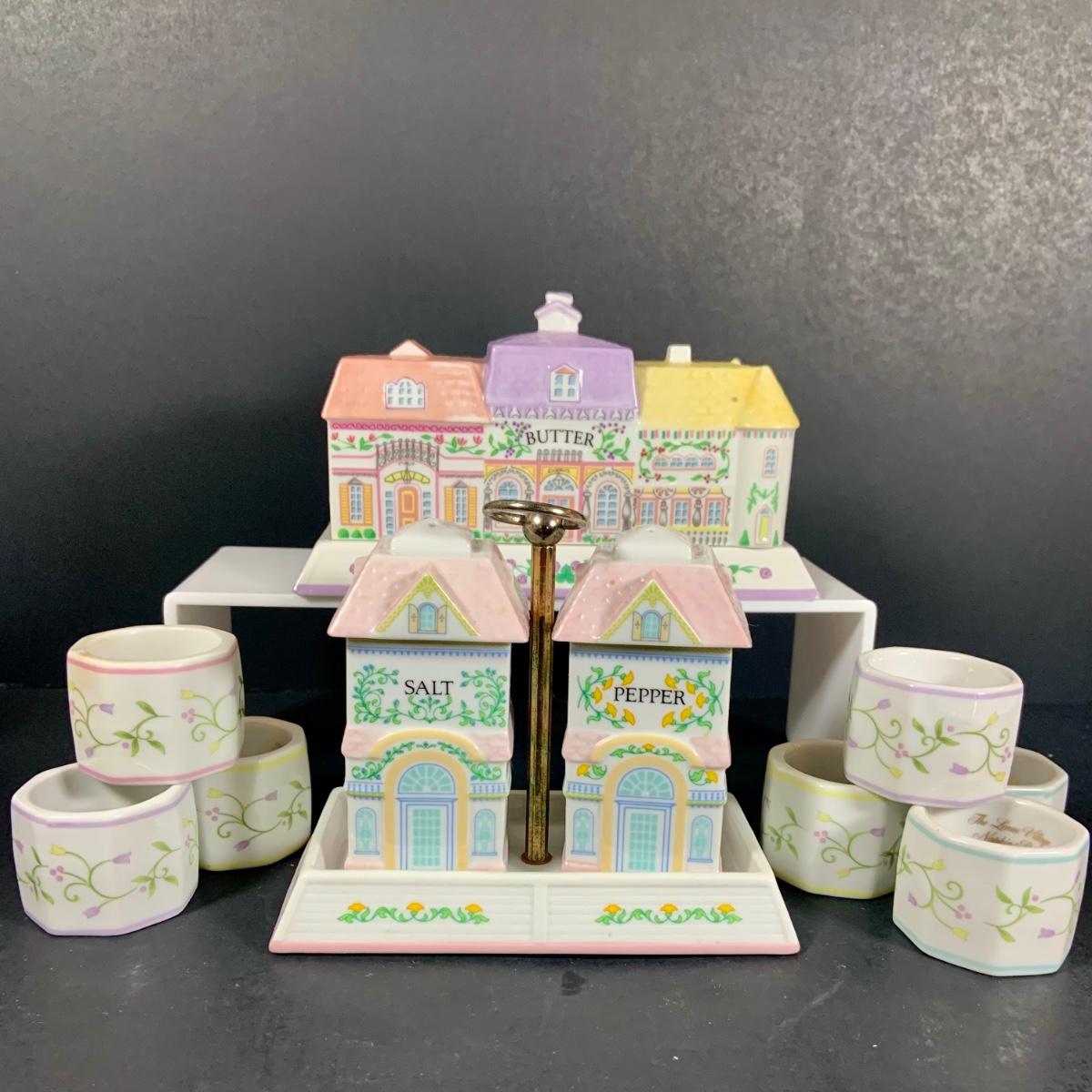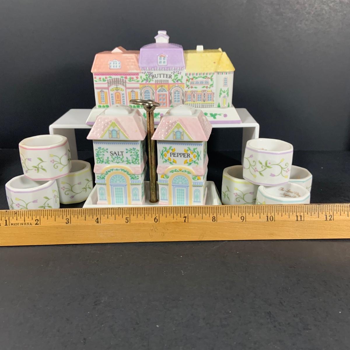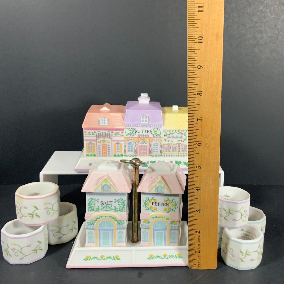 LOT205: Lenox The Love Village Butter Dish, Salt and Pepper Shakers with Caddie and Napkin Rings