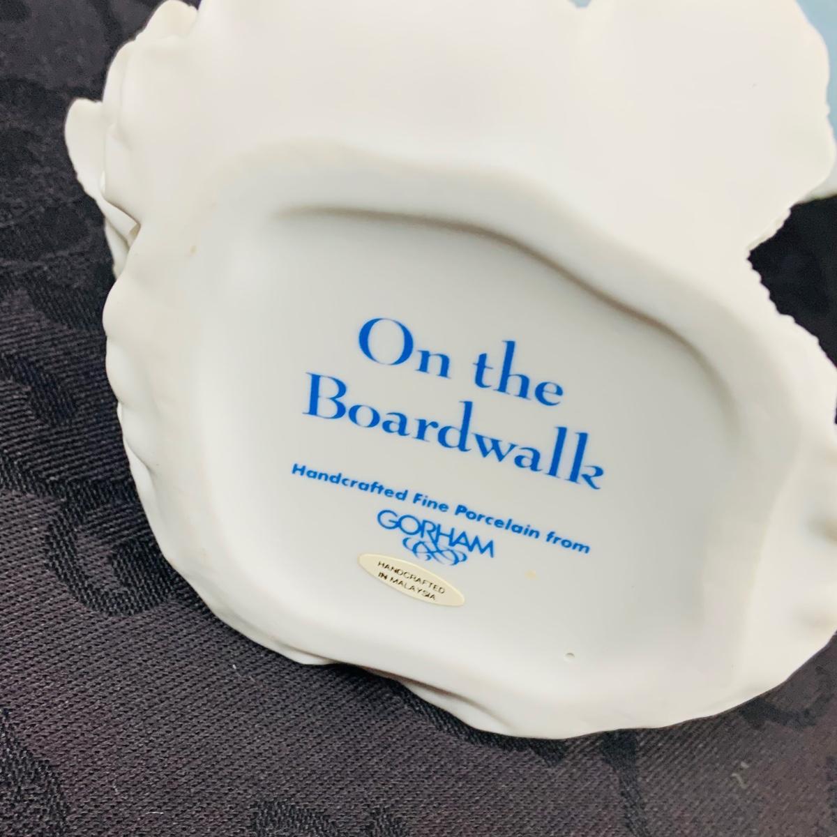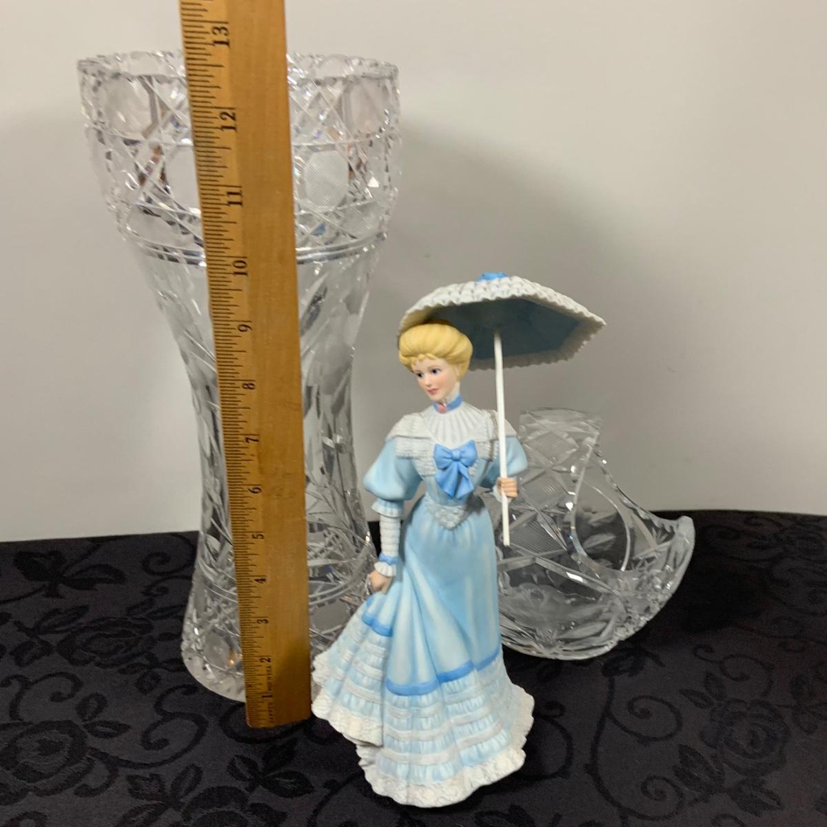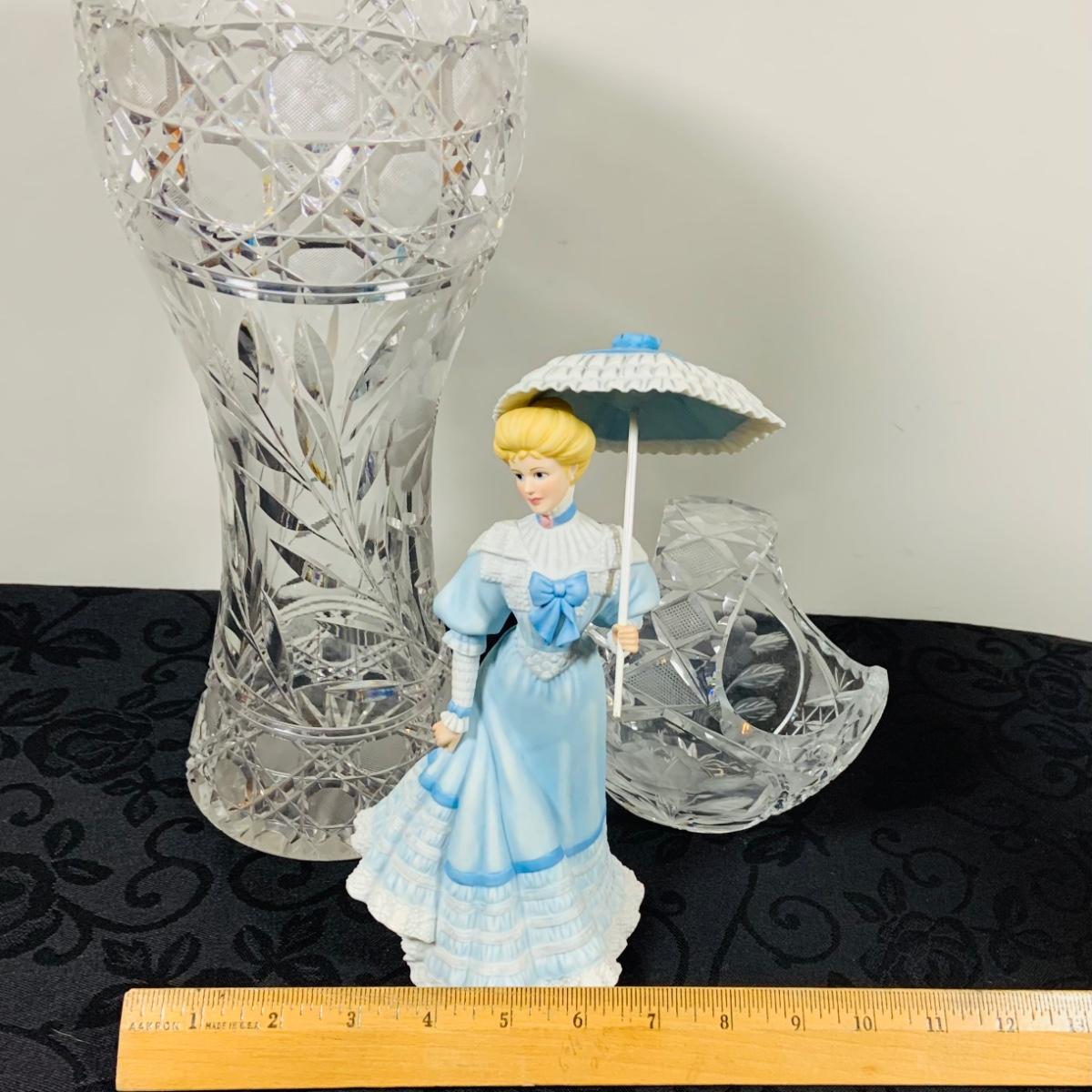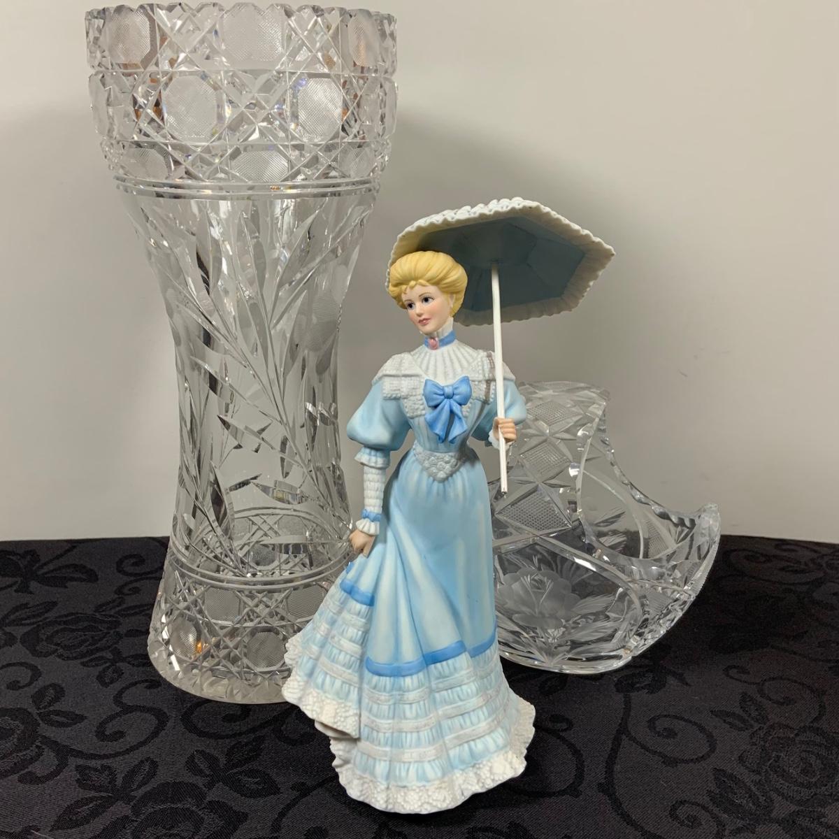 LOT 213: Gorham On the Boardwalk Porcelain Figurine, Large Crystal Vase and Crystal Basket