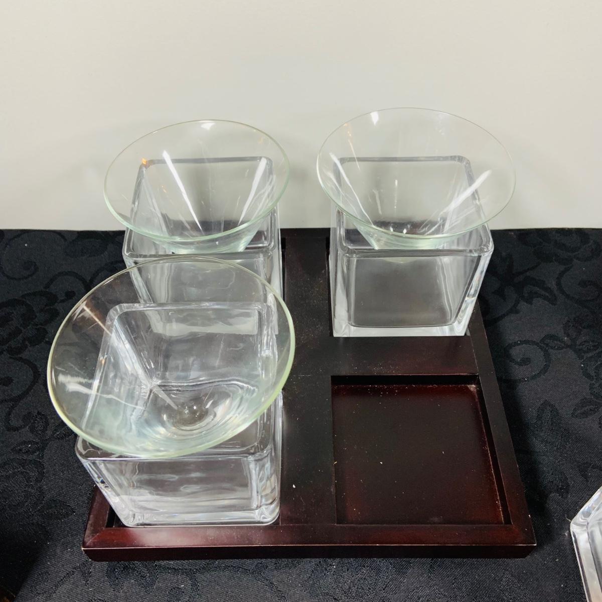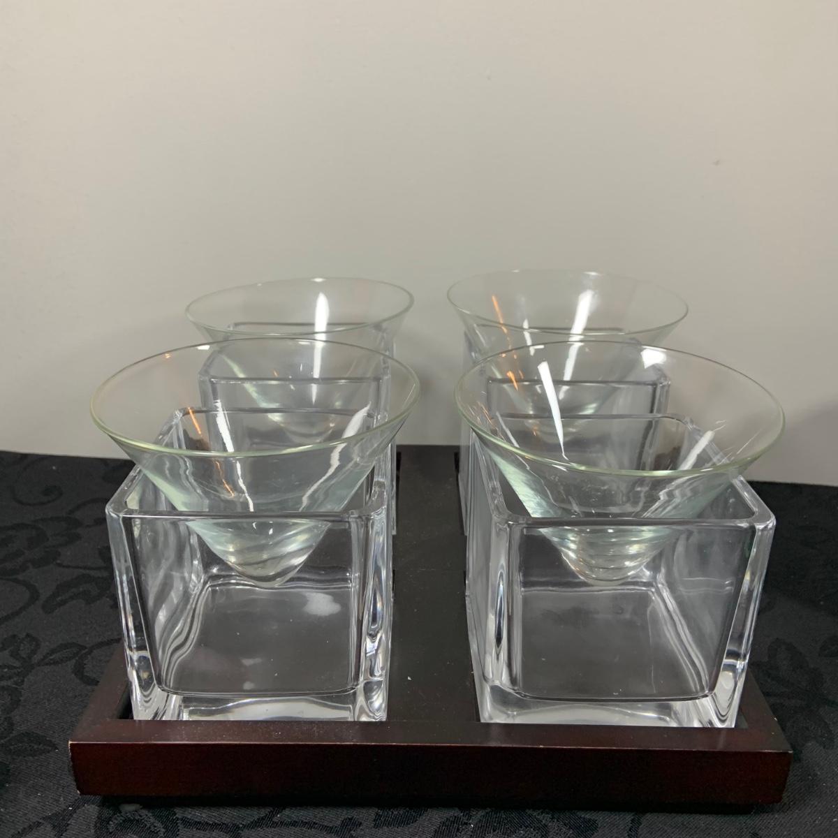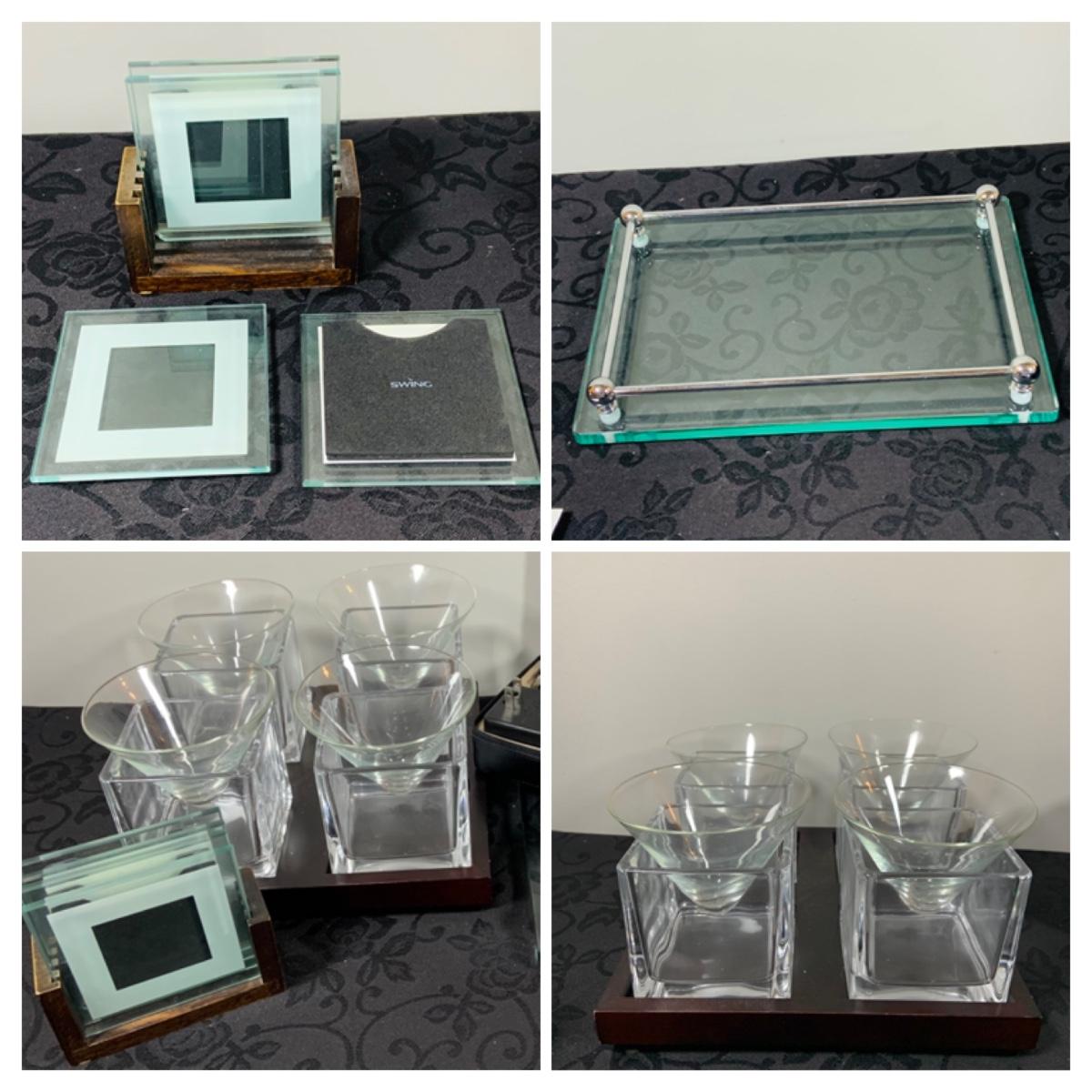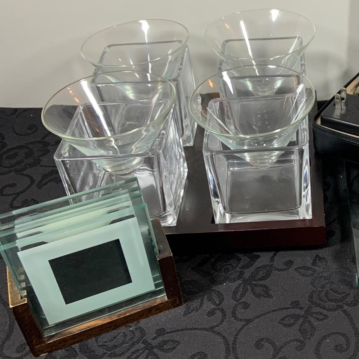 LOT216: For the Modern Bar - Red Envelope Cubist Martini Glass Set with Tray, Swing Glass Picture Frame Coasters, and Glass Tray