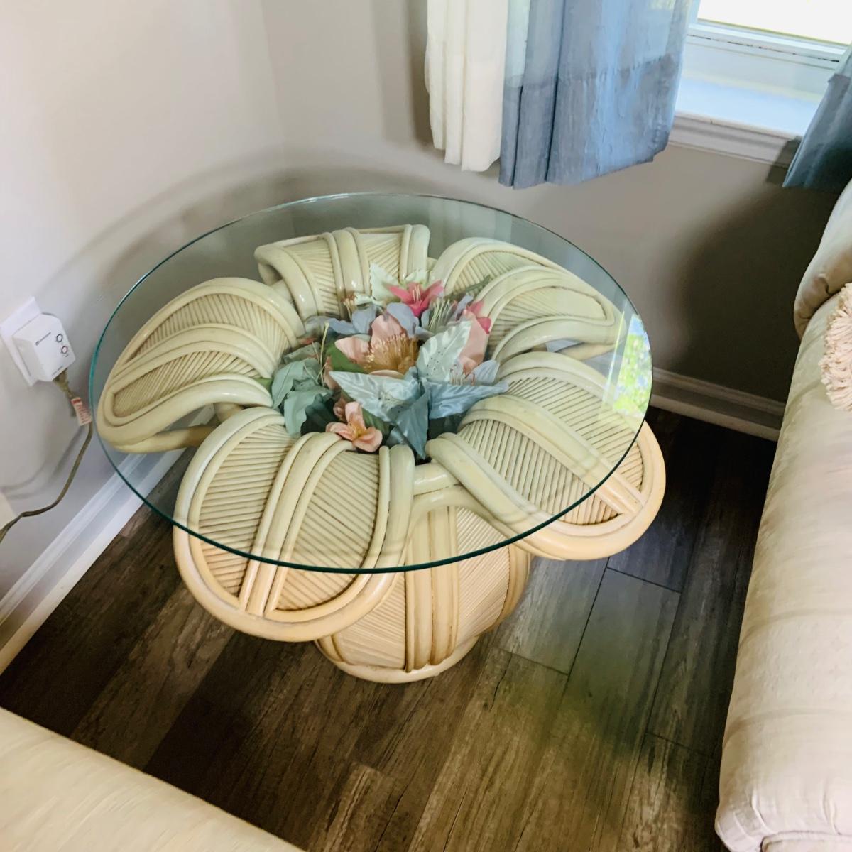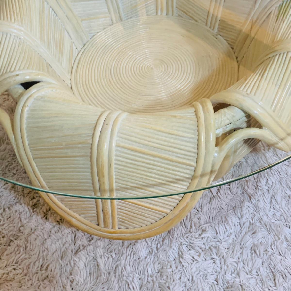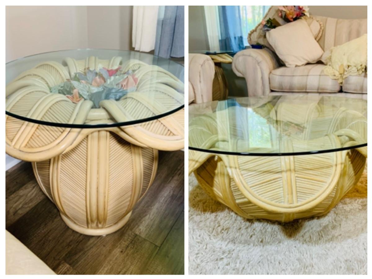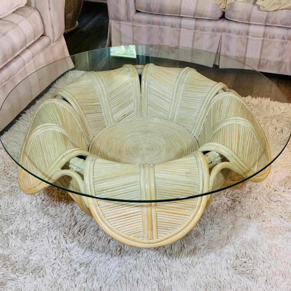 LOT 218: Rattan Split Reed Bell Flower Side and Coffee Tables with Glass Tops
