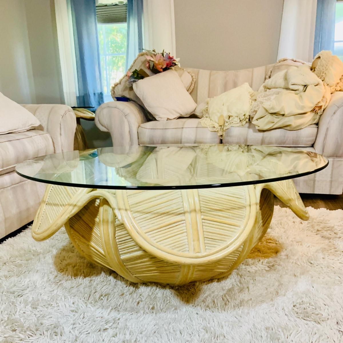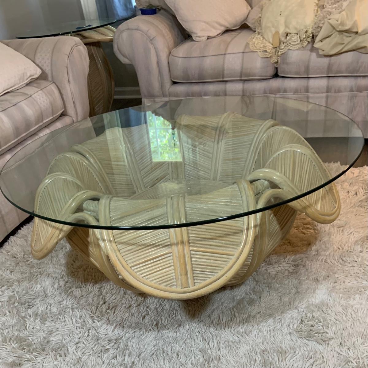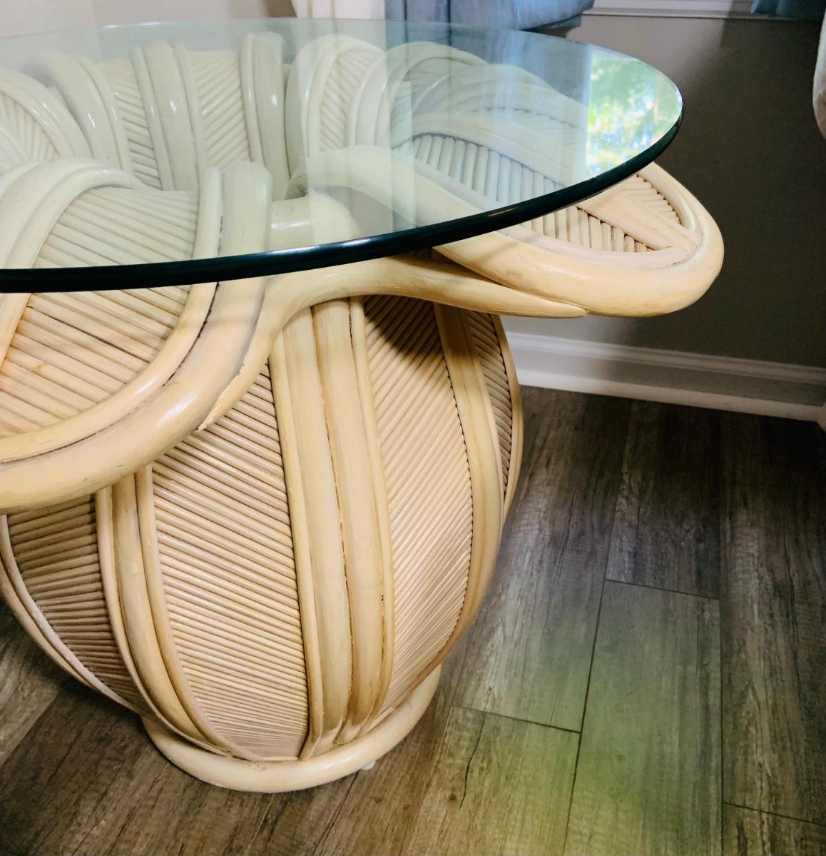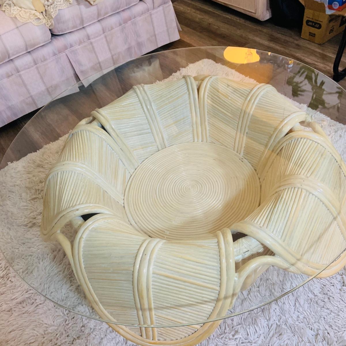 LOT 218: Rattan Split Reed Bell Flower Side and Coffee Tables with Glass Tops