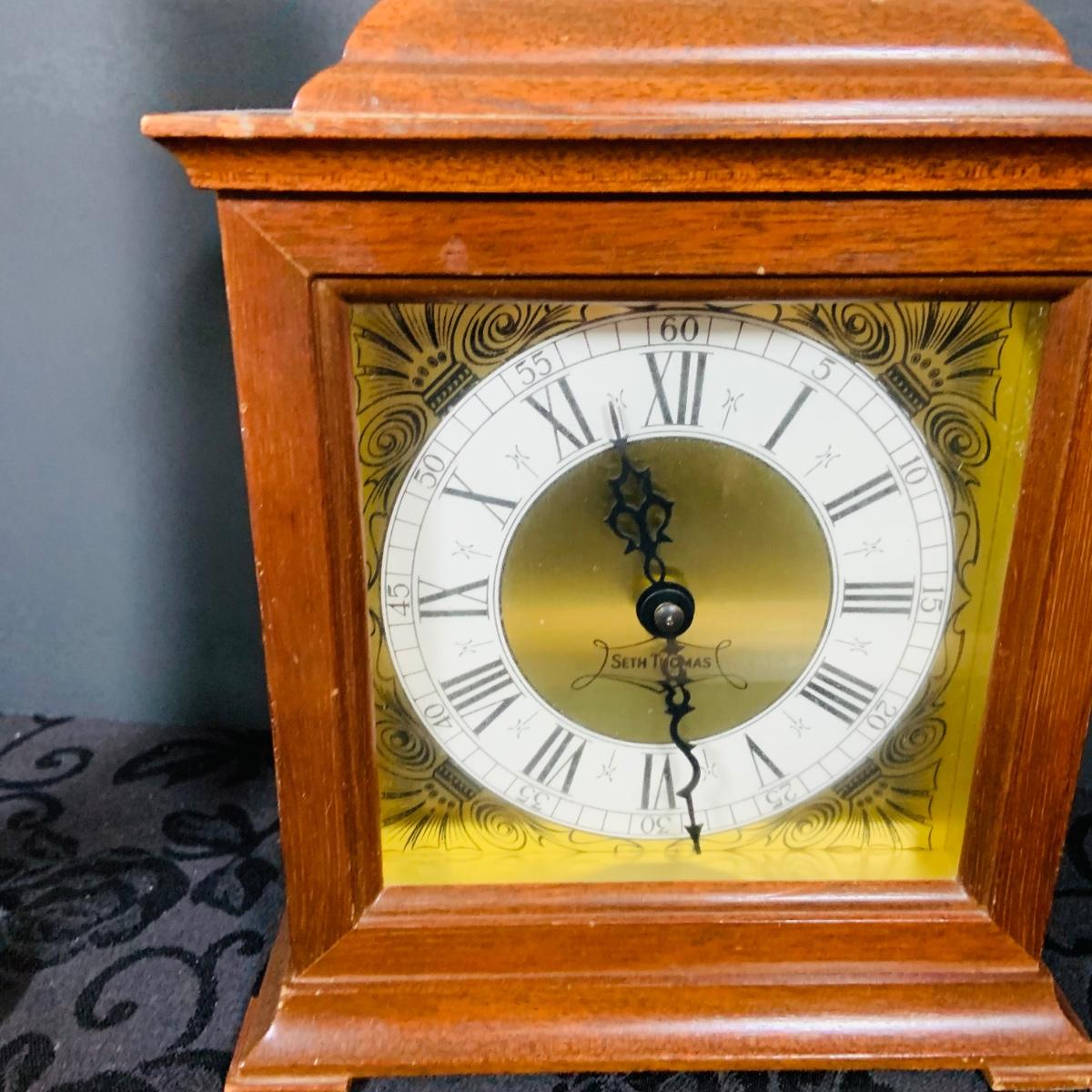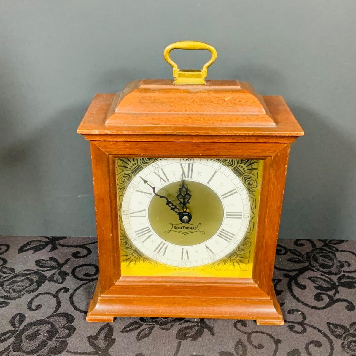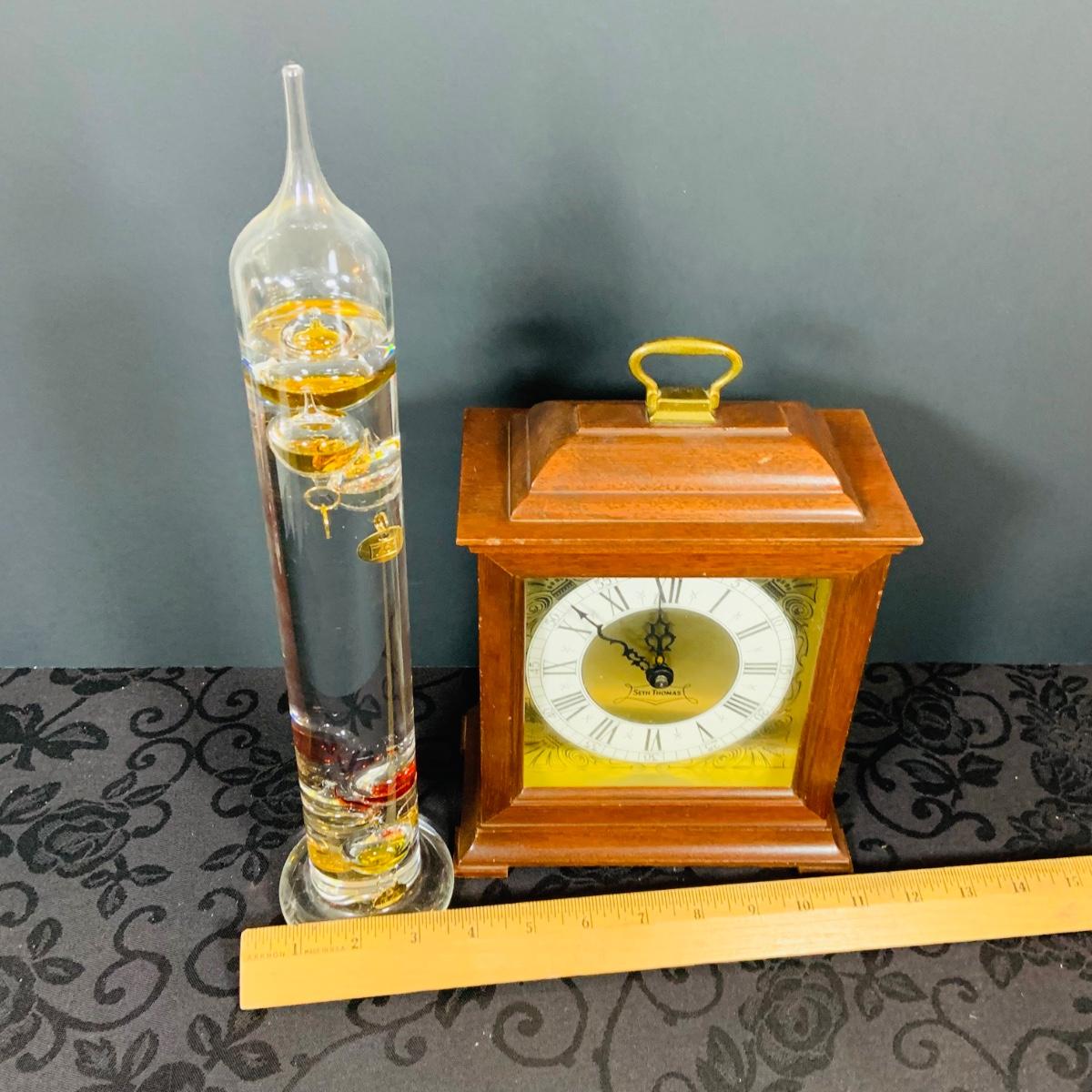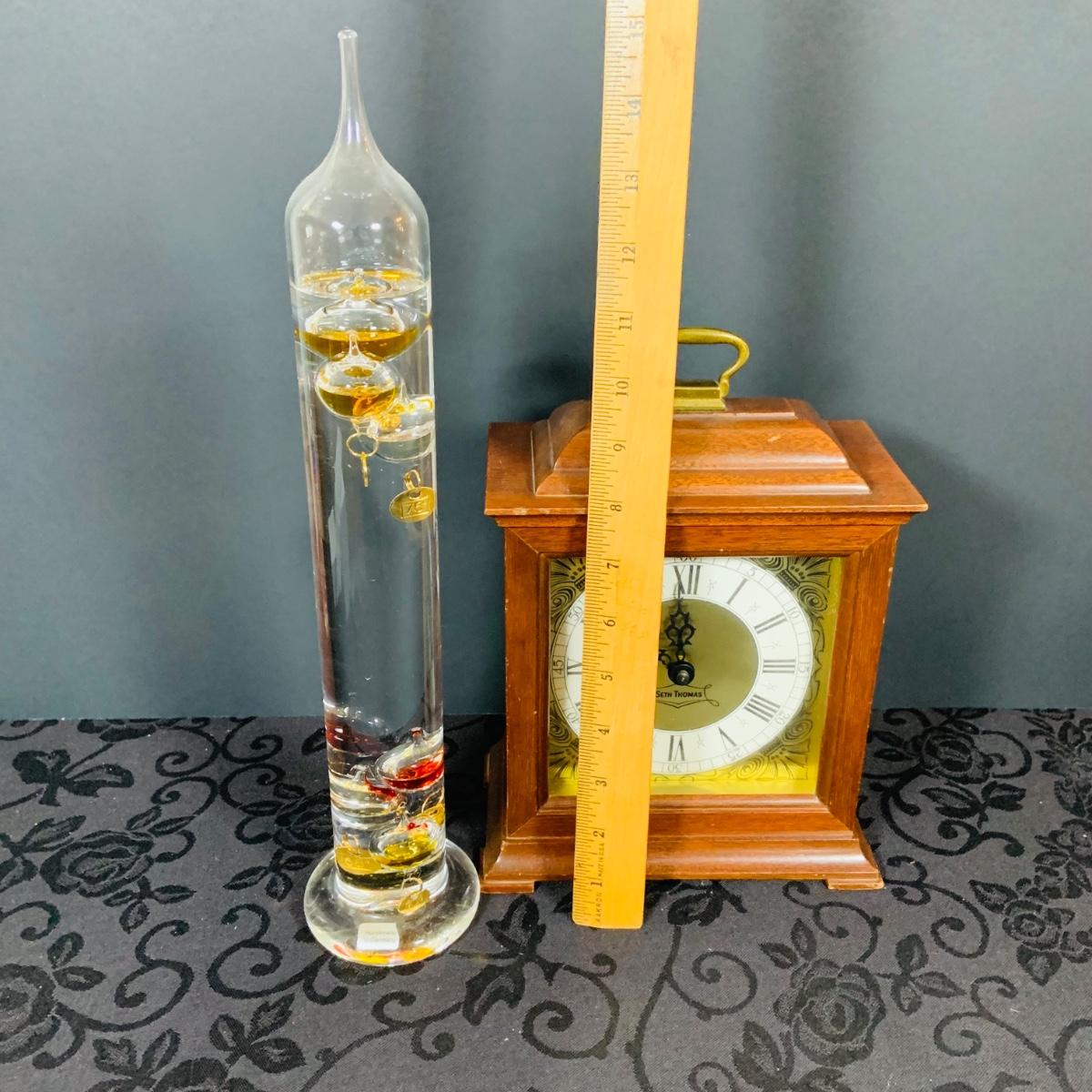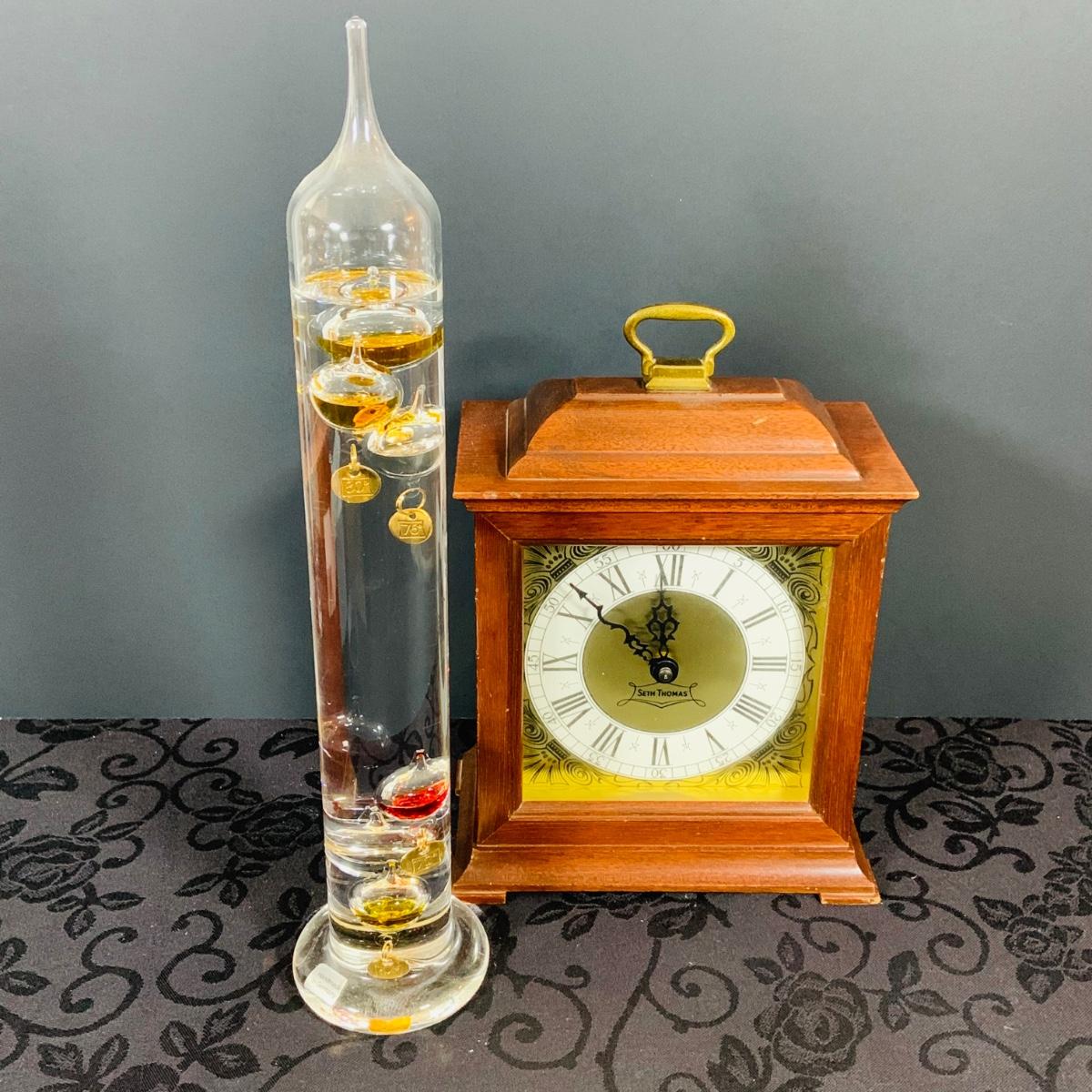 LOT 226: Seth Thomas Mechanical Mantle Clock and Glass Galileo Thermometer