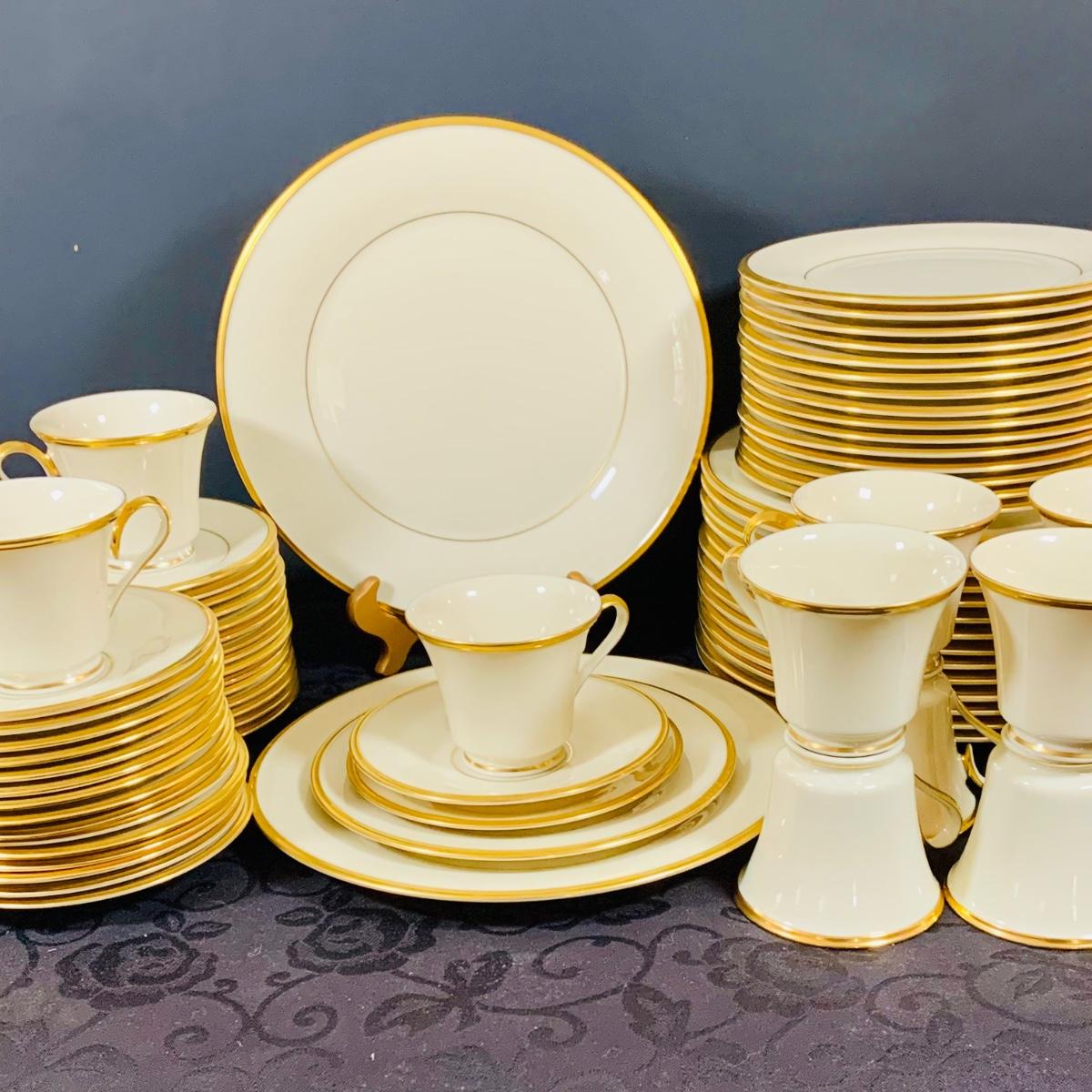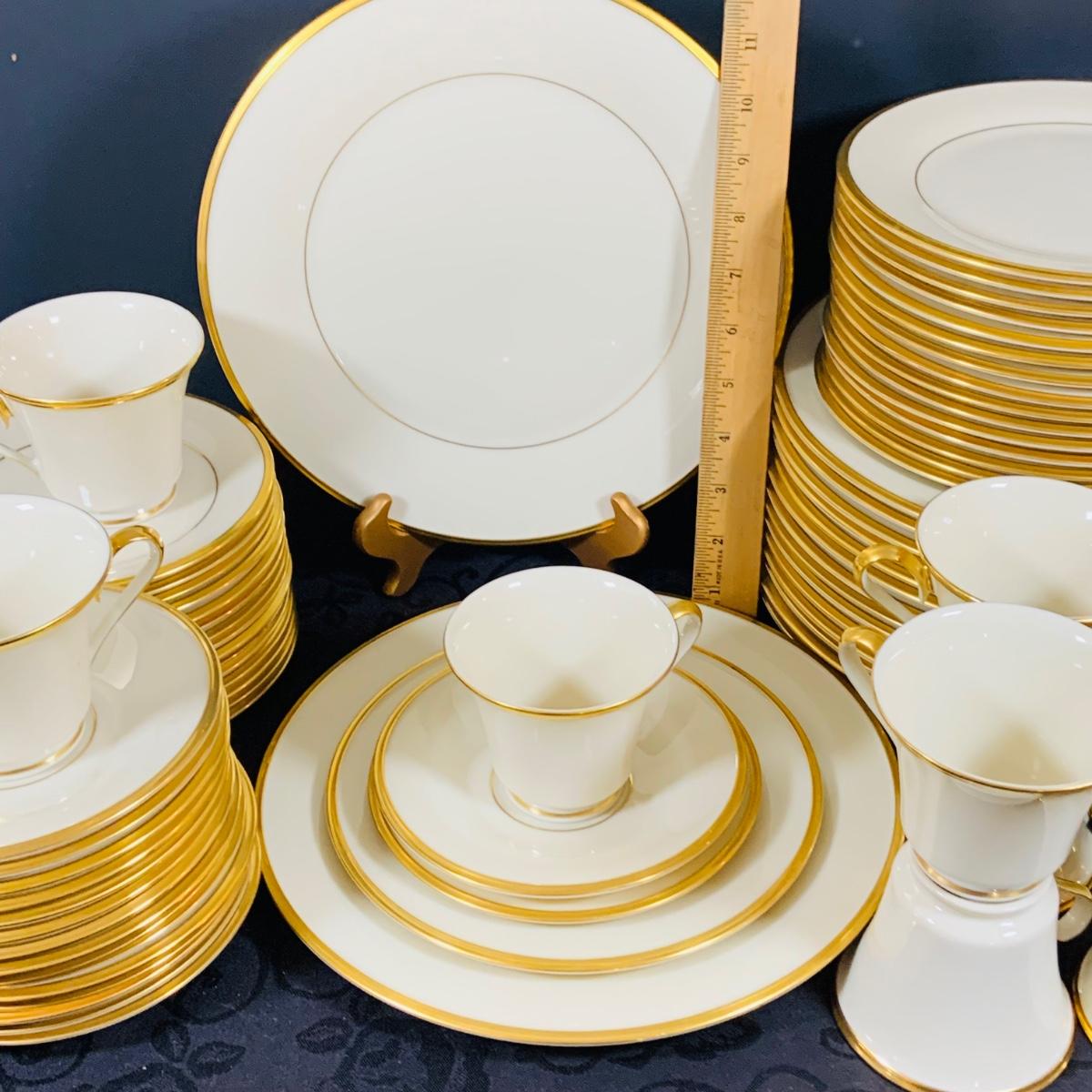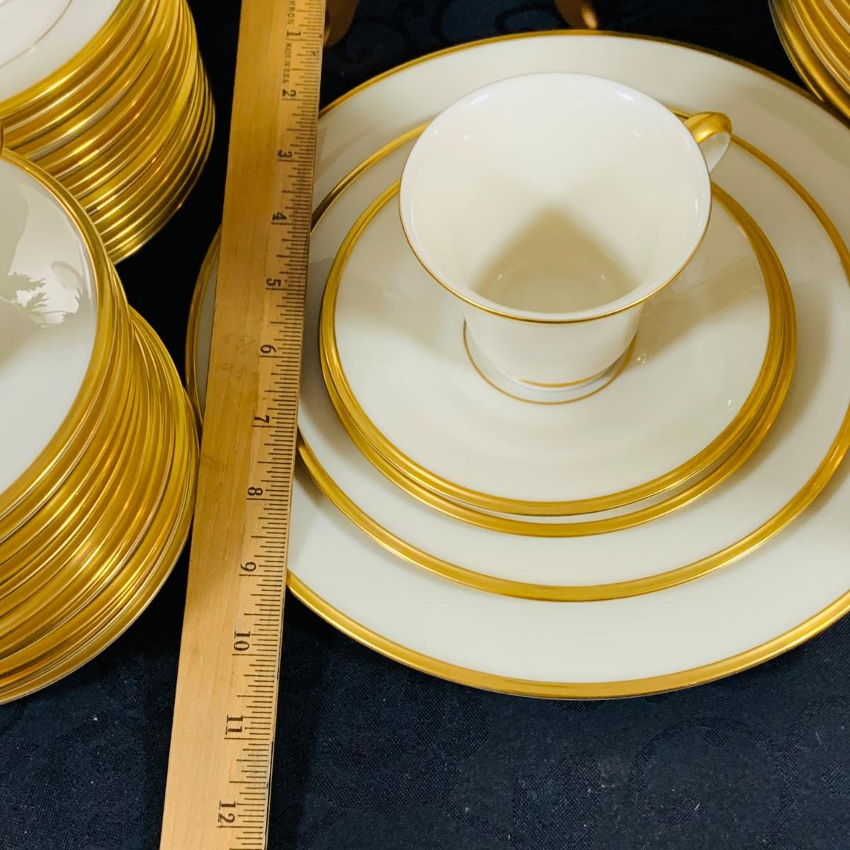LOT 227 Lenox Dimension Collection Eternal Gold Rimmed China- Five (5) Piece Table Setting Cup, Saucer, Dinner Plate, Salad Plate and Dessert Plate. - 16 of Each Piece