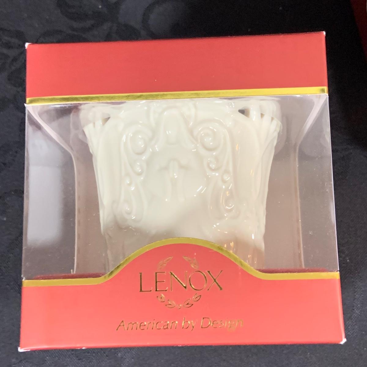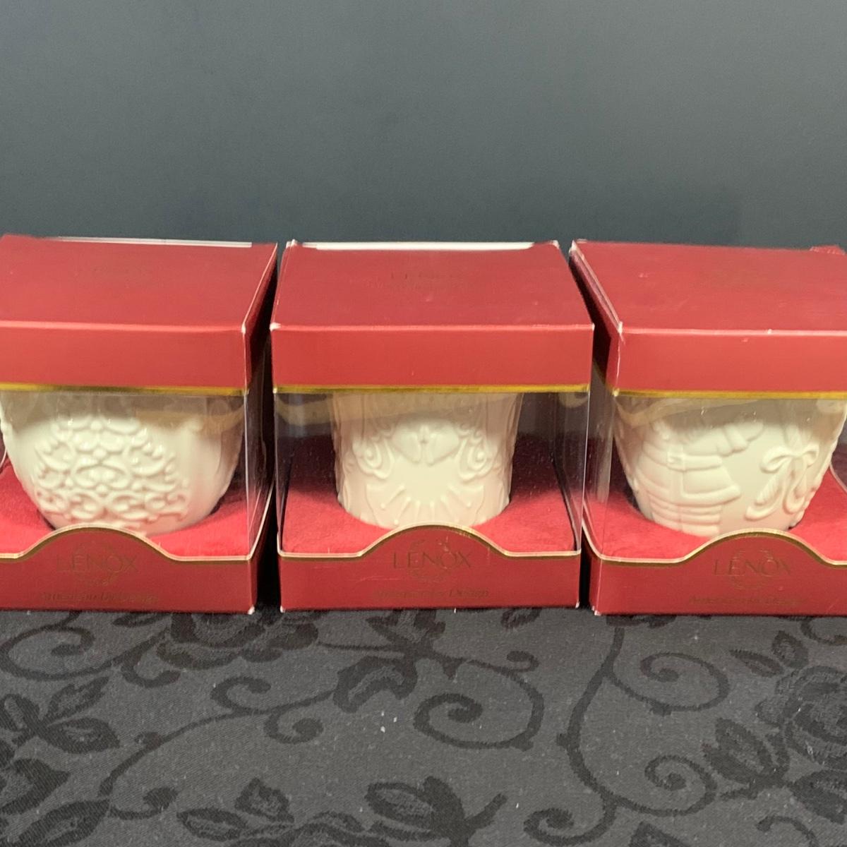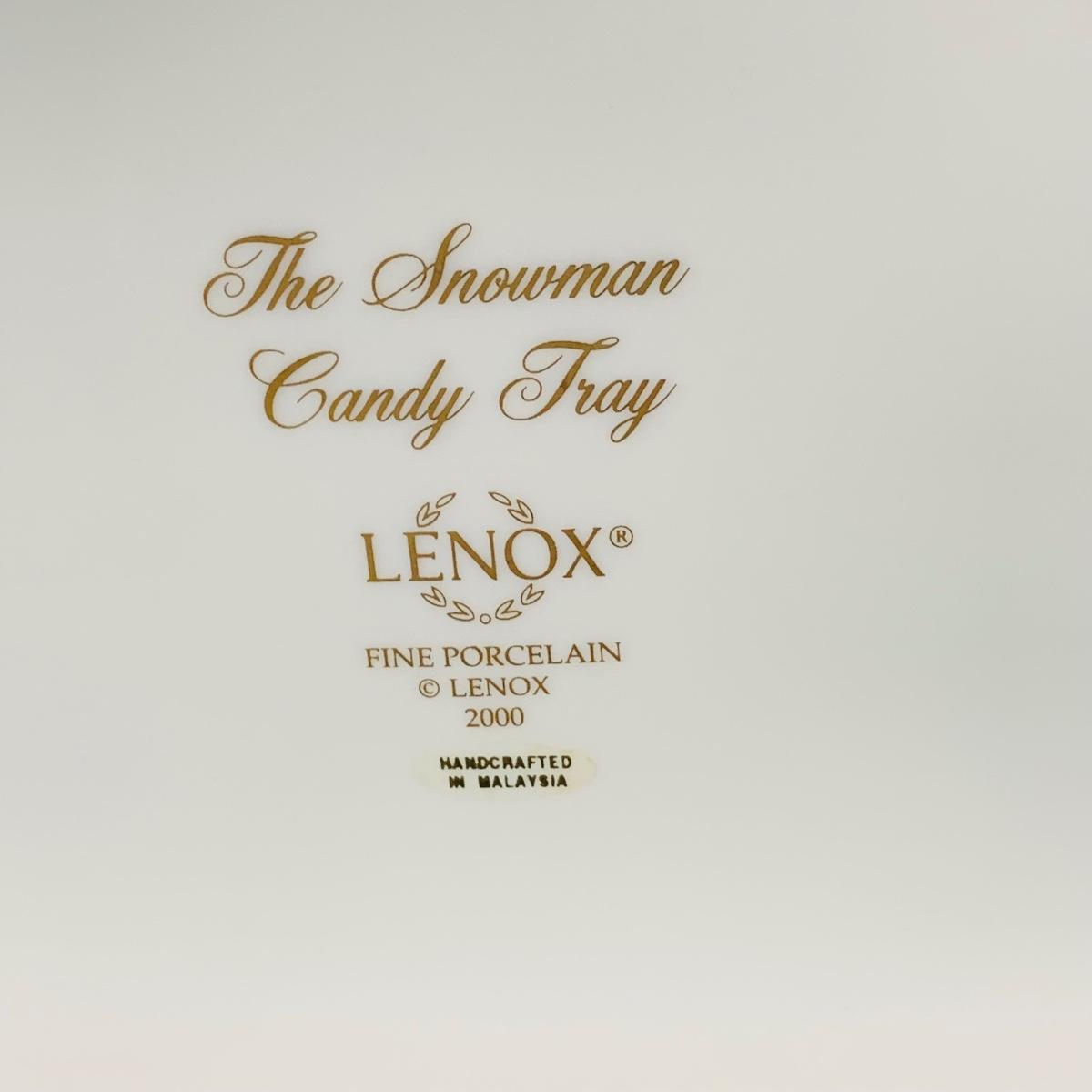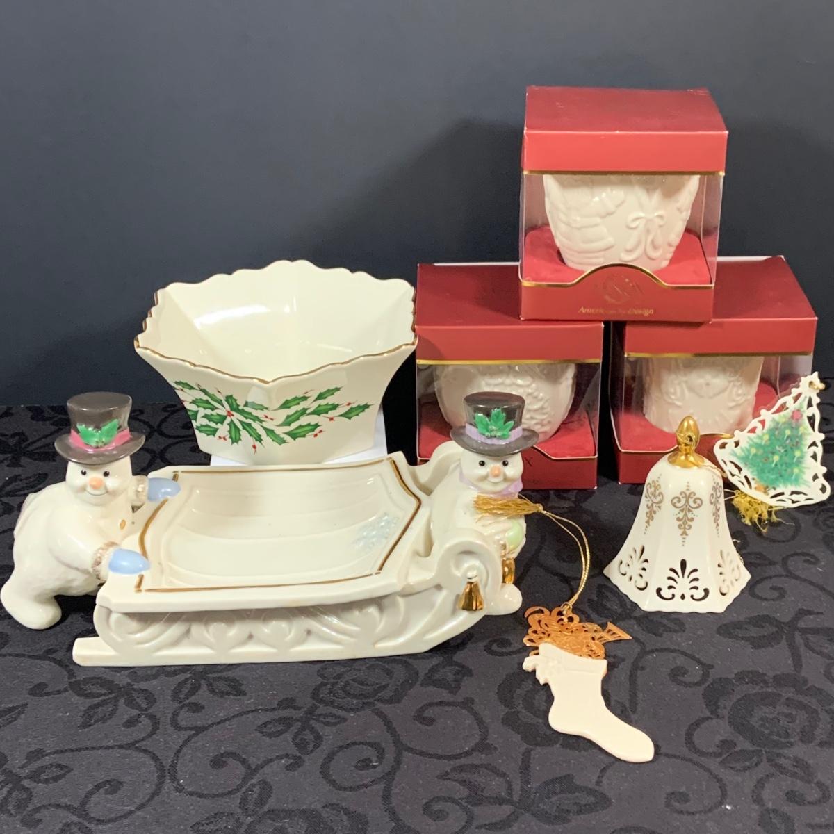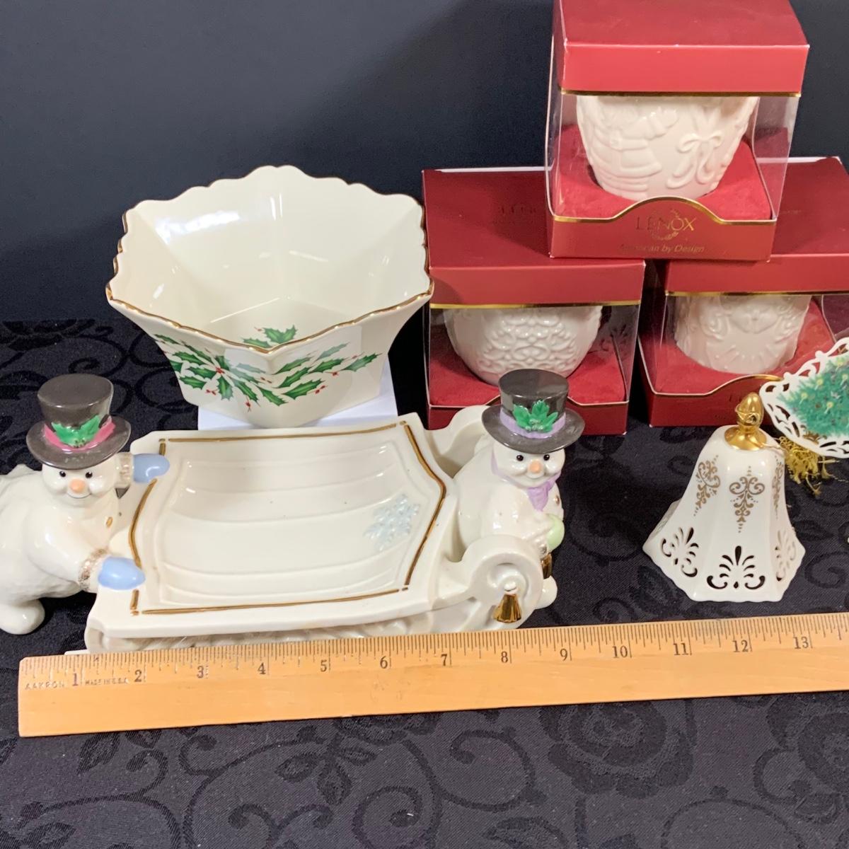 LOT 230: Lenox Holiday Decor Including Three (3) Candle Holder In Original Box, Holiday Paneled Bowl, Snowman Candy Tray 1990 Bell and Ornaments
