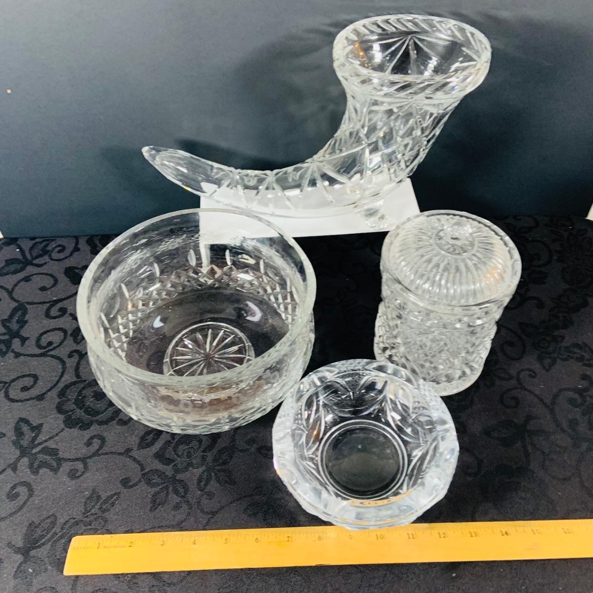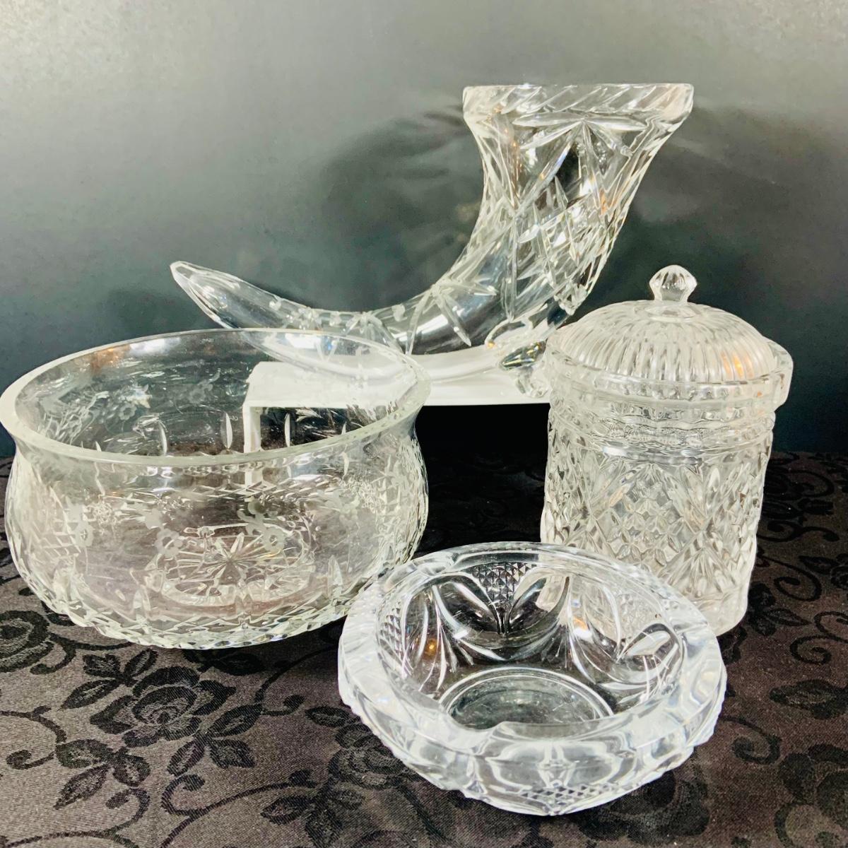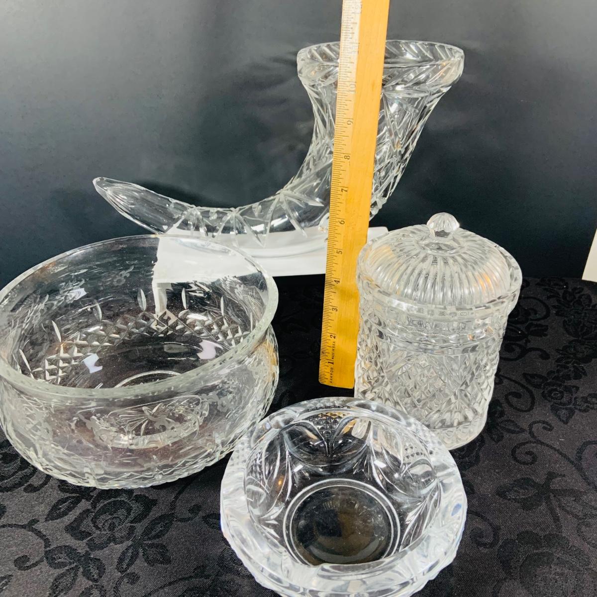 LOT 236: Collection of Crystal Pieces - Horn Cornucopia, Bowl, Jar and Ashtray