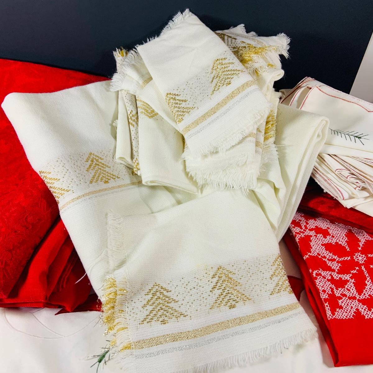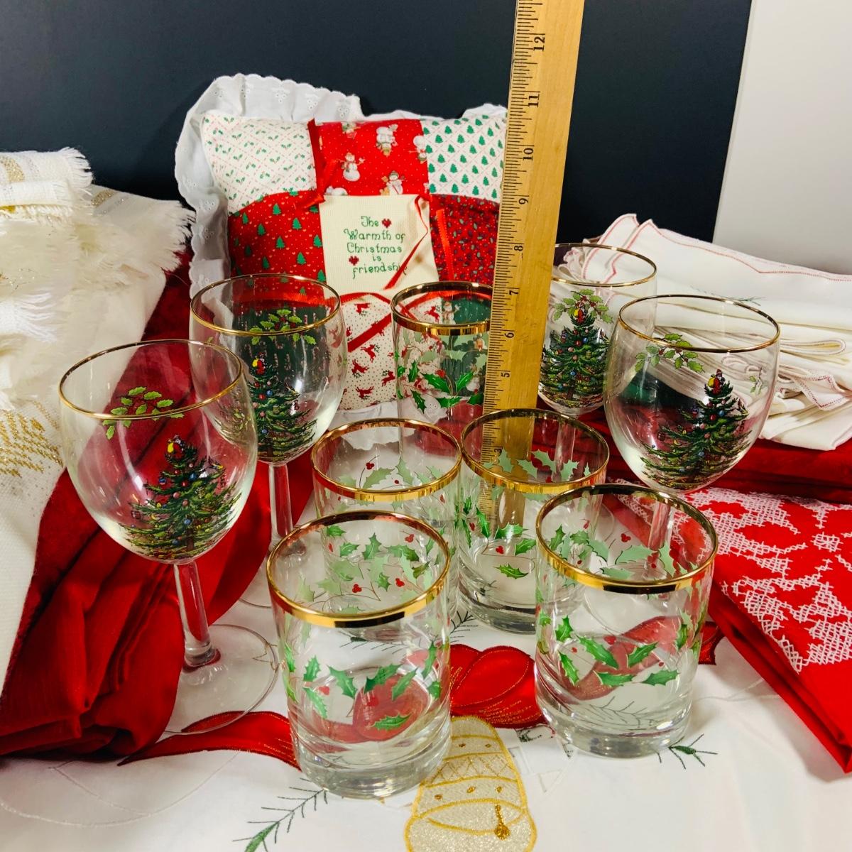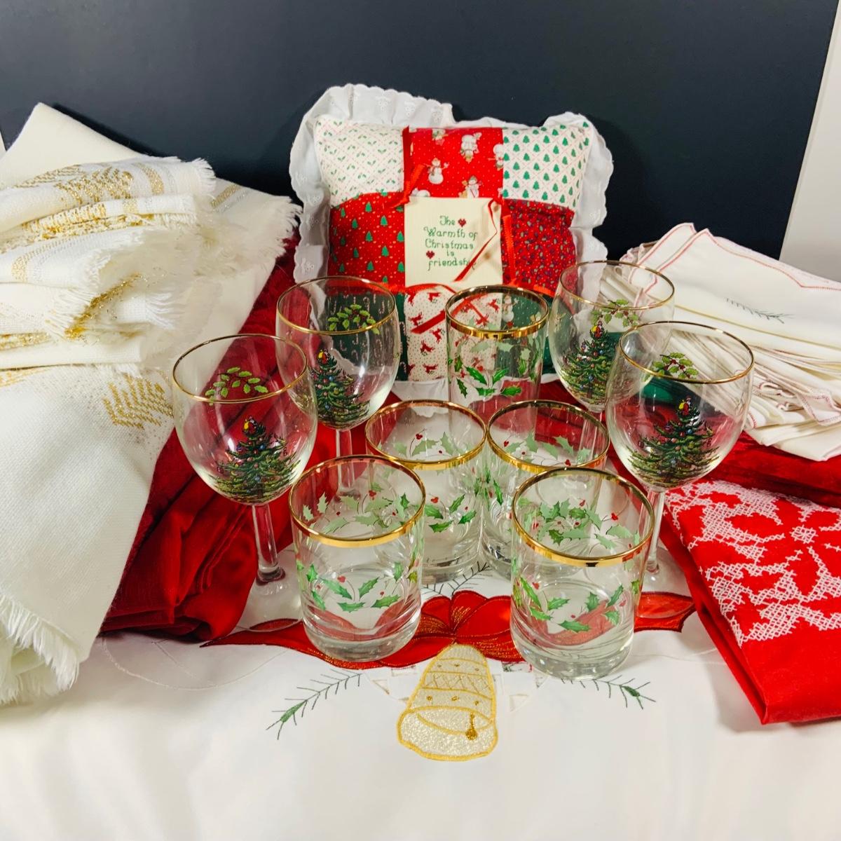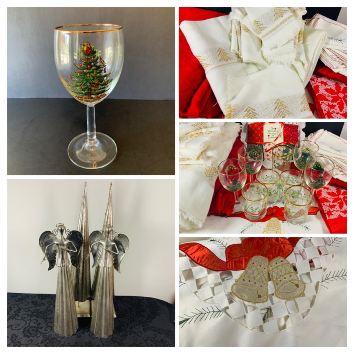 LOT 238: Large Selection of Christmas Linens, Holiday Glasses and Metal Decor