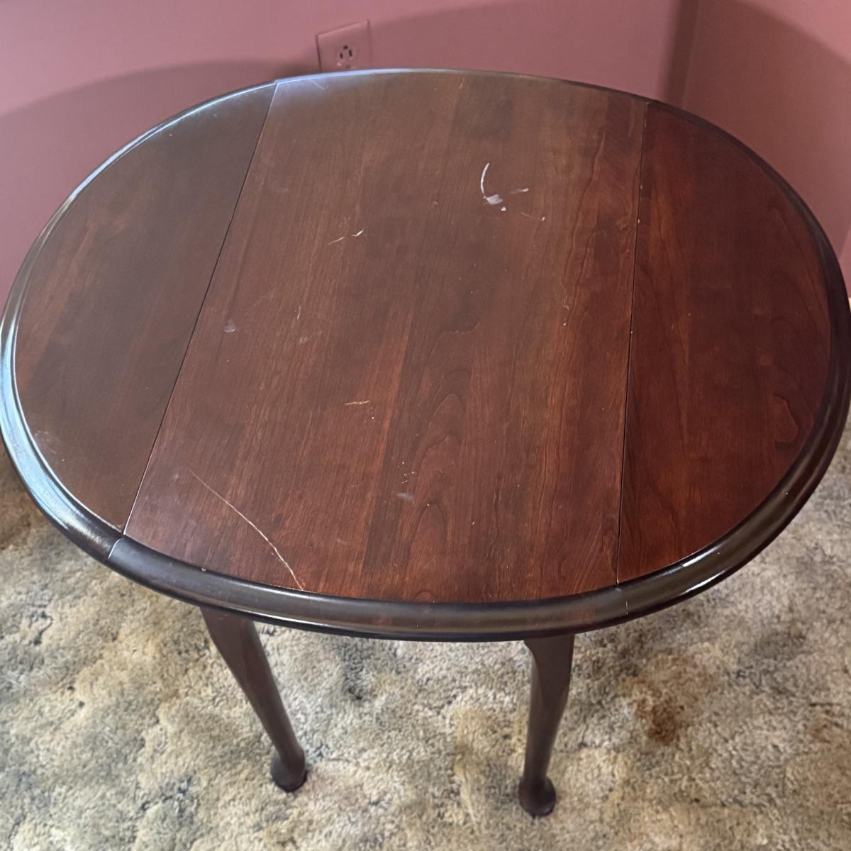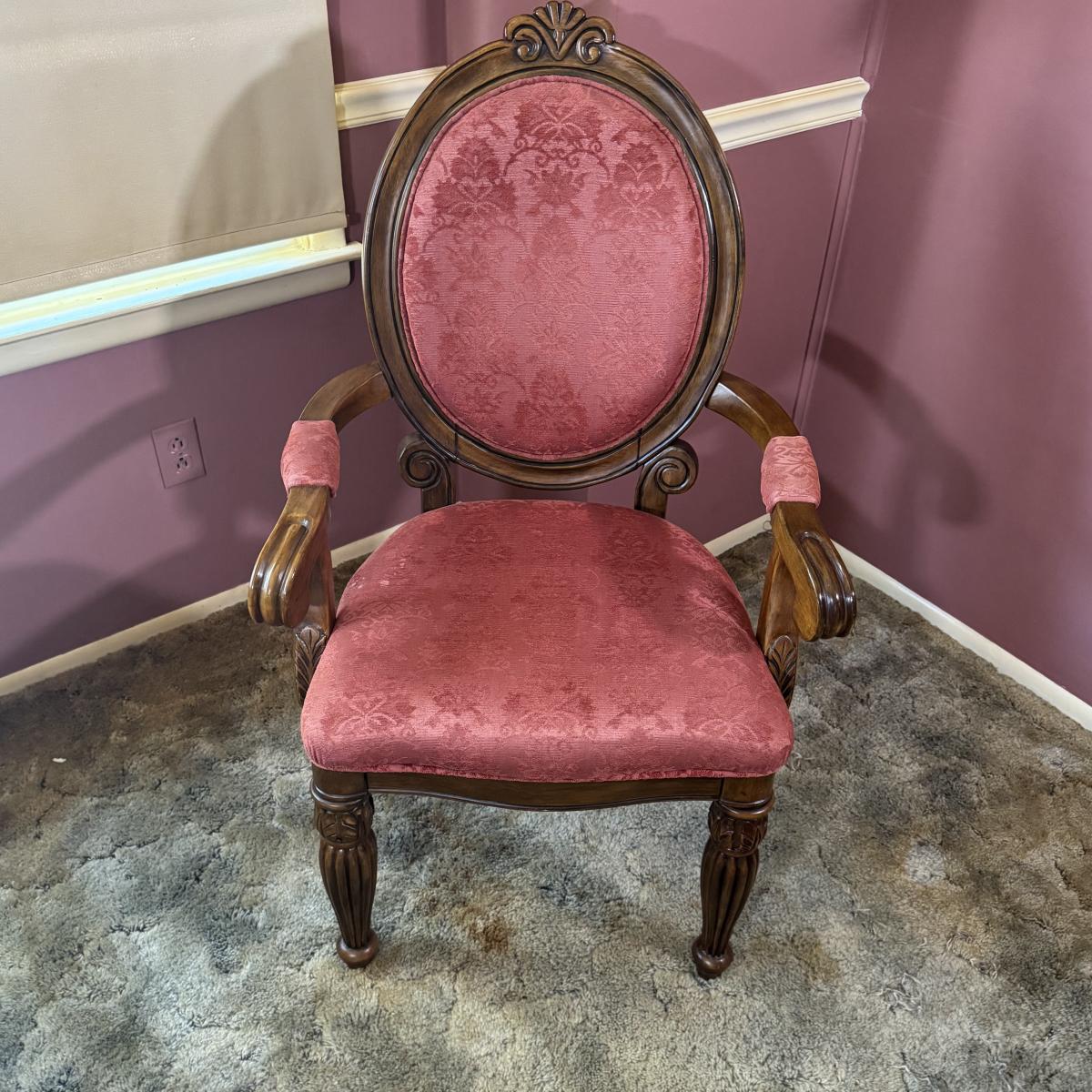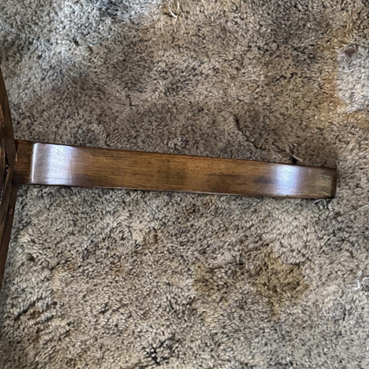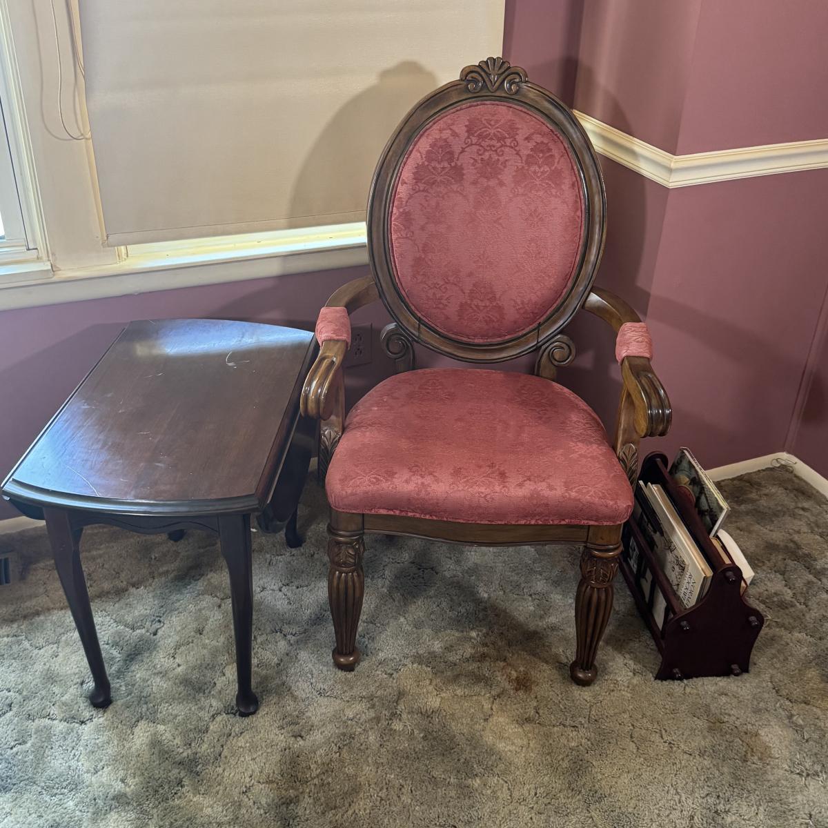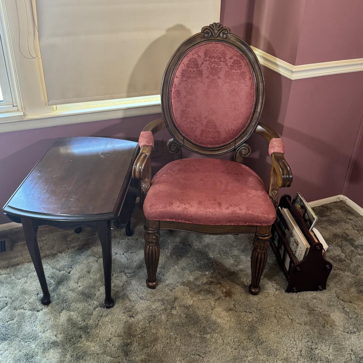 Chair is 41” h, 25” across, 19” d. Magazine rack is 11.5” h, 17” w, 8” d. Each drop leaf is 7.5” wide. Total dimensions of table with leaves are 21.5” h, 30” w, 27” d. Please see all pictures as they are the best representation of the items. The pictures show condition, measurements if taken, and what is included in the lot. Due to the large amount that we photograph and the time frame, we are not always able to take measurements. All items unless noted, are pre-owned and have been used. If you purchased furniture, you must bring help. We do not allow one person to carry large furniture out on their own. Bring help, tools and a truck for the safety of our client’s homes, and your personal safety. Any damages that result to the property including walls, and floors due to moving of the furniture will be charged to the buyer. Company policy. Thank you.