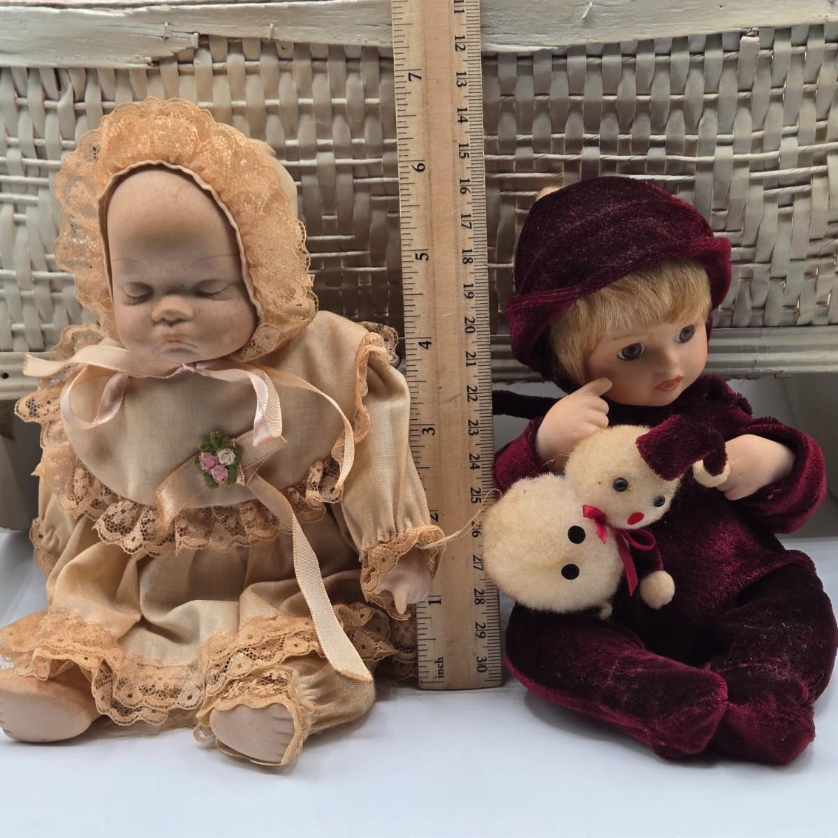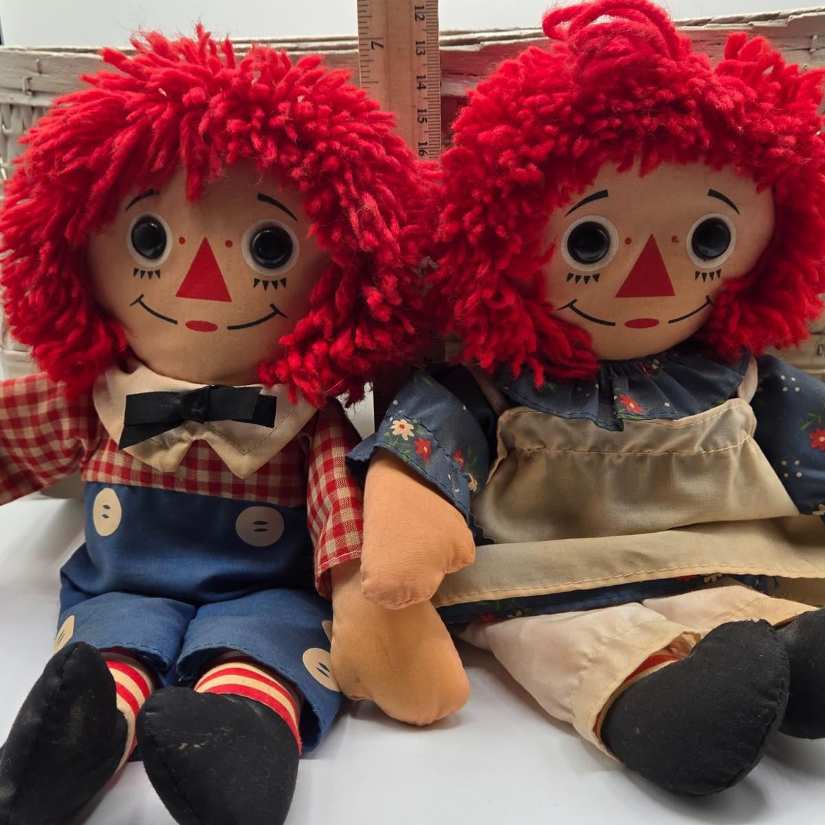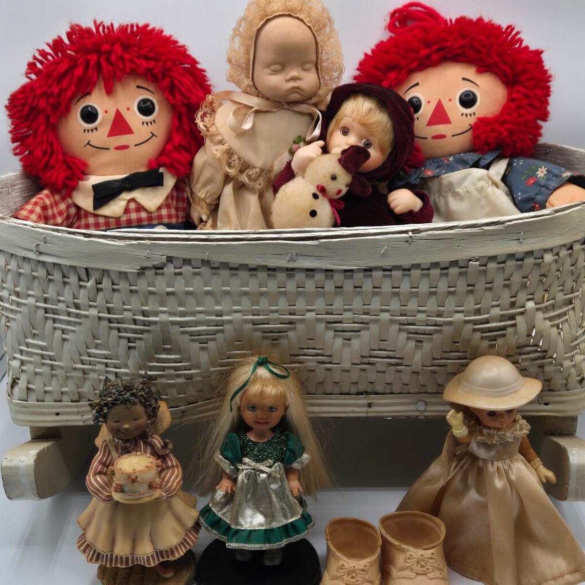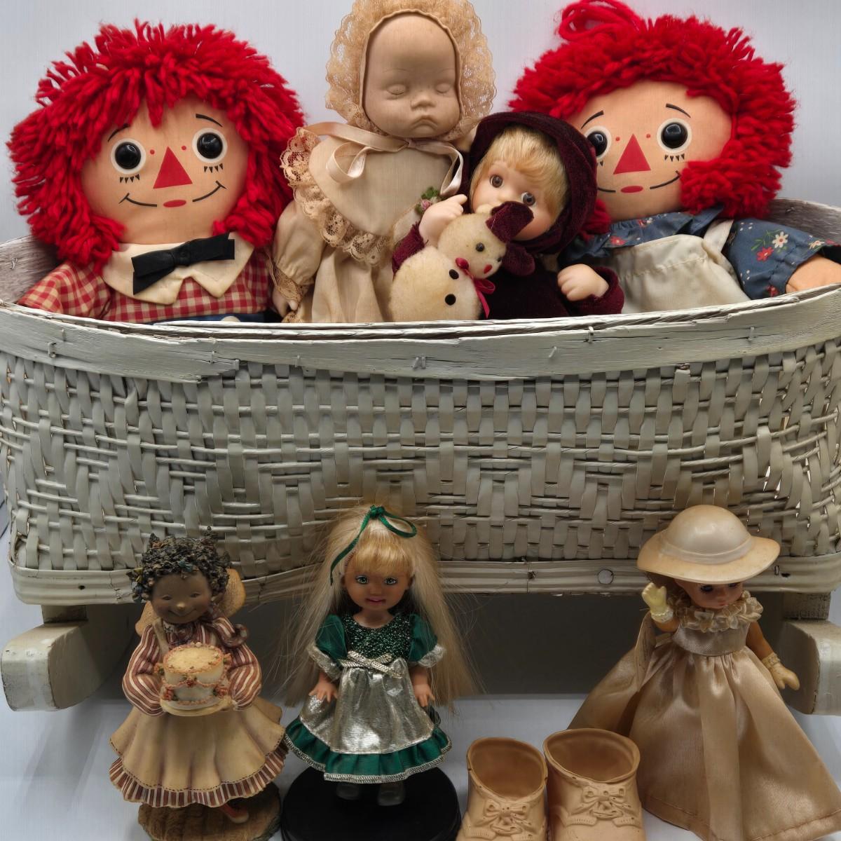 LOT 42A: Wicker Doll Cradle, Raggedy Ann & Andy, Porcelain Sleeping Baby Doll, Porcelain Baby with Snowman, and More