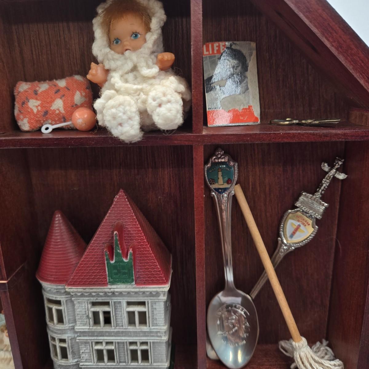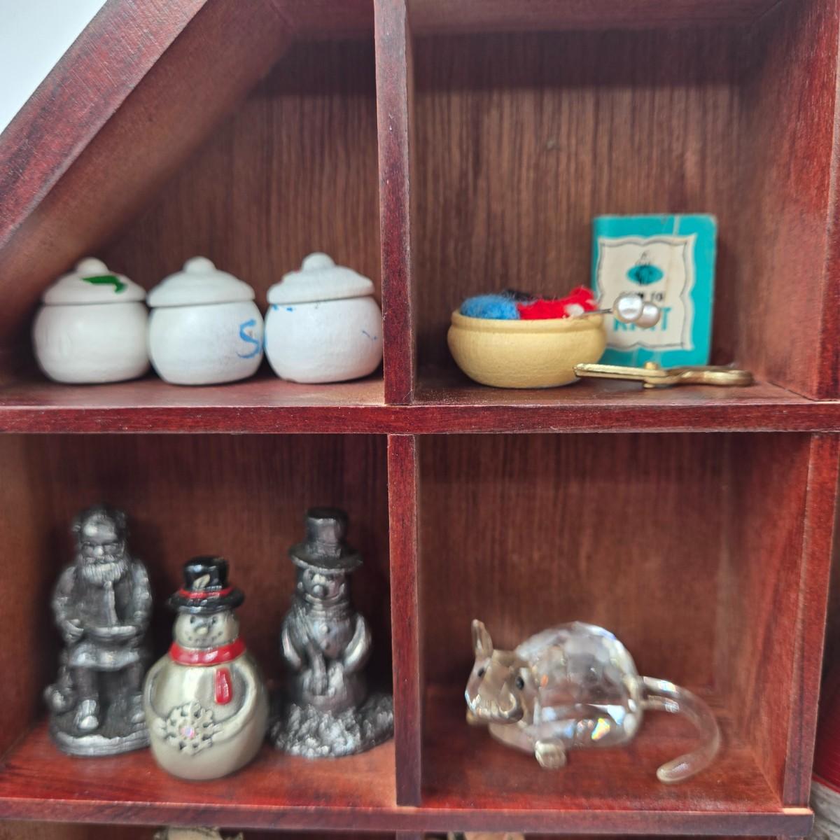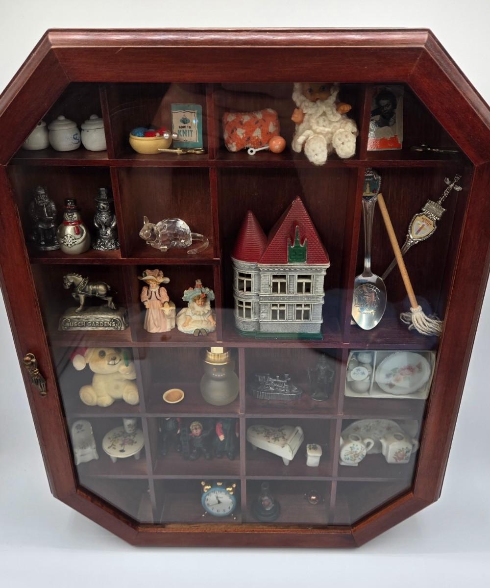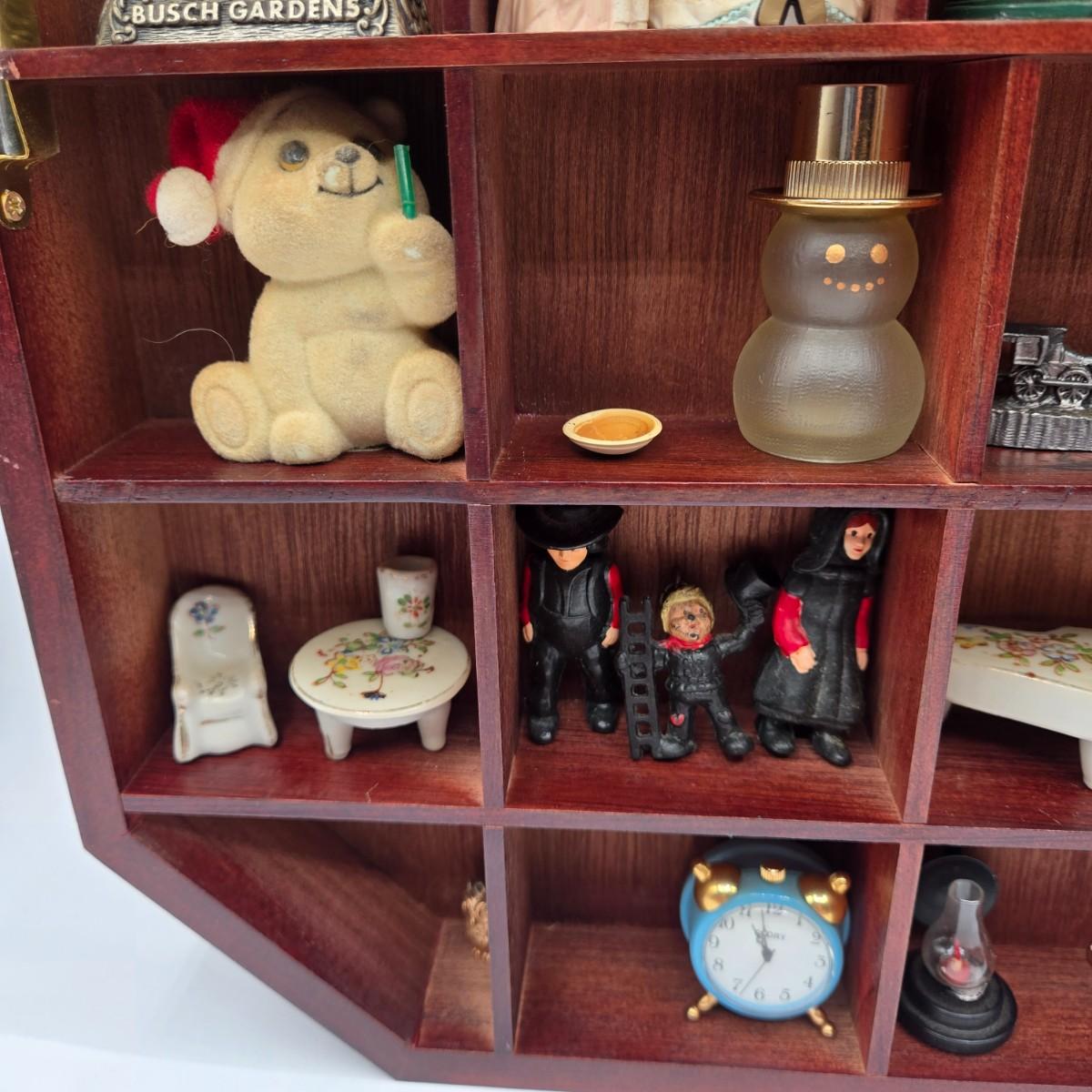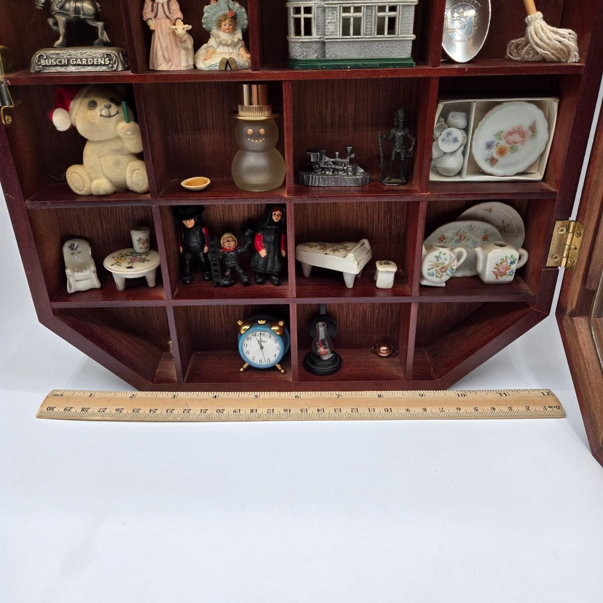 LOT 44A: Wooden Curio Cabinet with Various Miniatures Including Swarovski Mouse, Pewter Figurines, and More