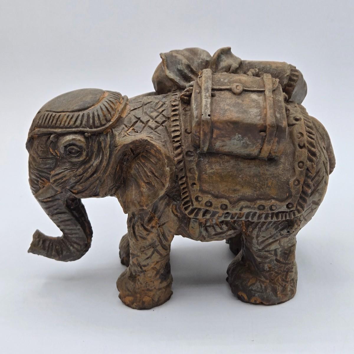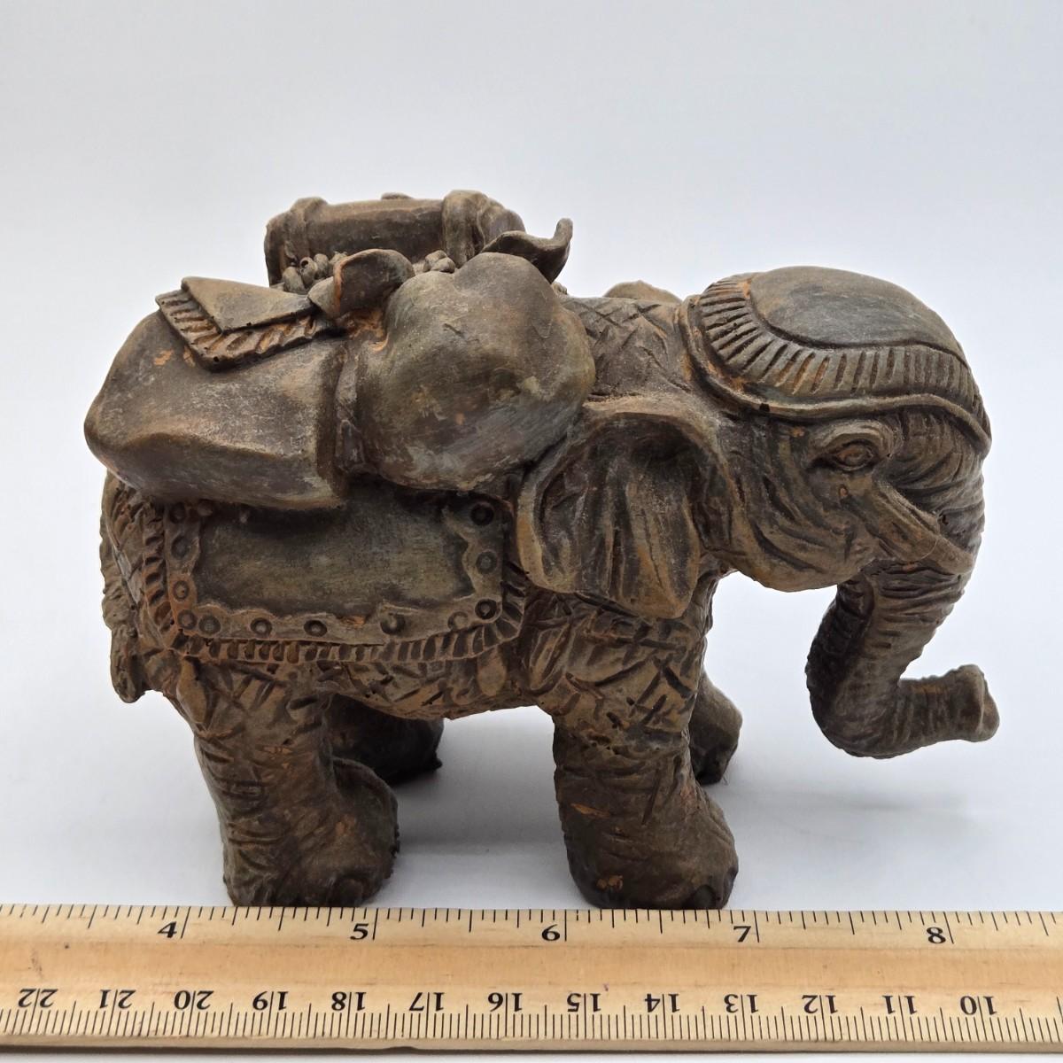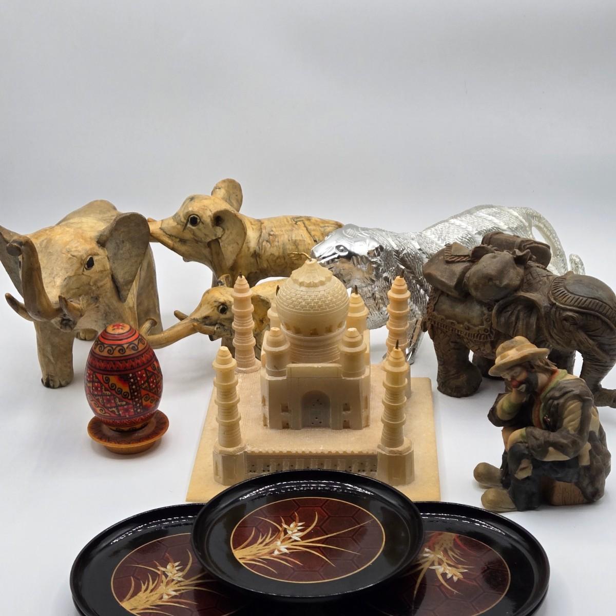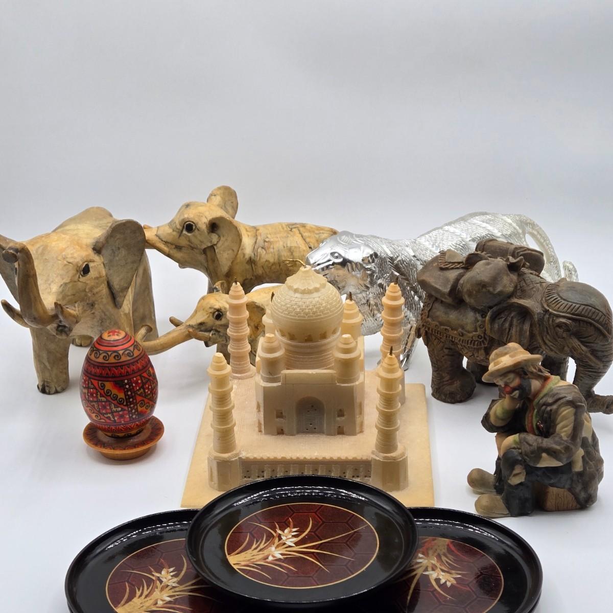 LOT 48A: Set of 5 Coasters, Elephant Carrying Luggage Figurine, The Thinker by Emmett Kelly Jr., Silver-tone Tiger, Family of Elephants Made From Crushed Oyster Shells, Taj Mahal , and Ukrainian Egg