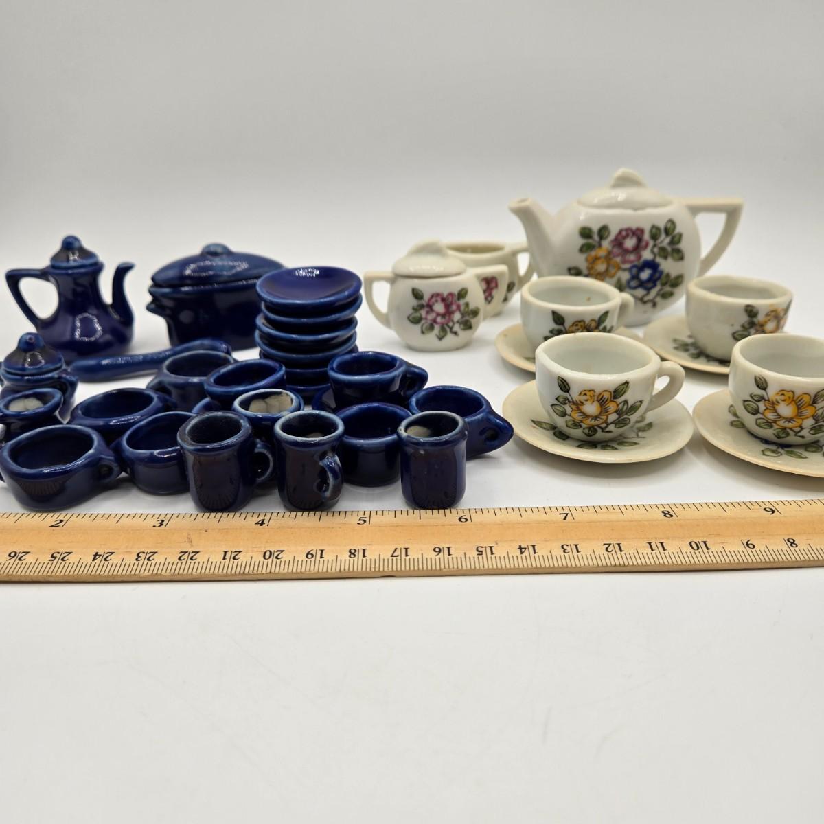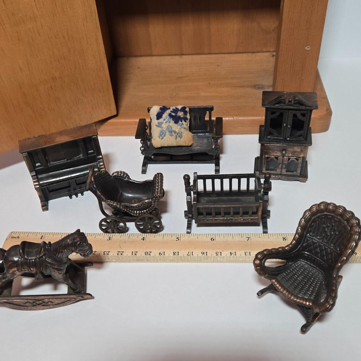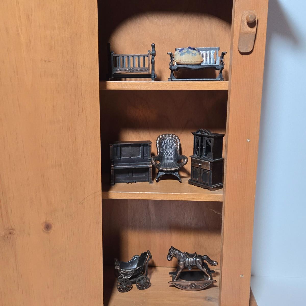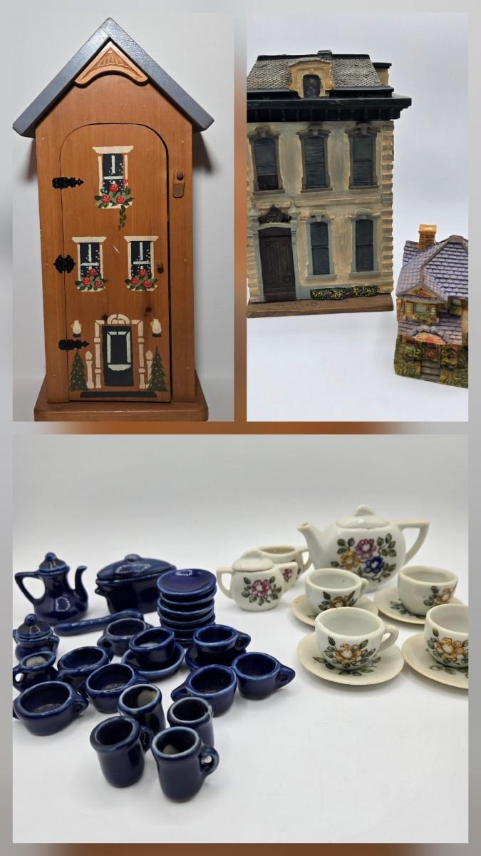LOT 57A: Wooden House Cabinet with Metal Doll house Furniture, Two Miniature Tea Sets, and More