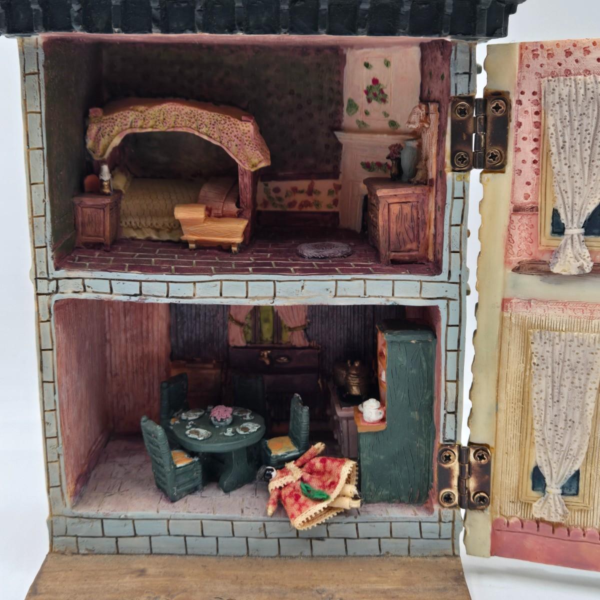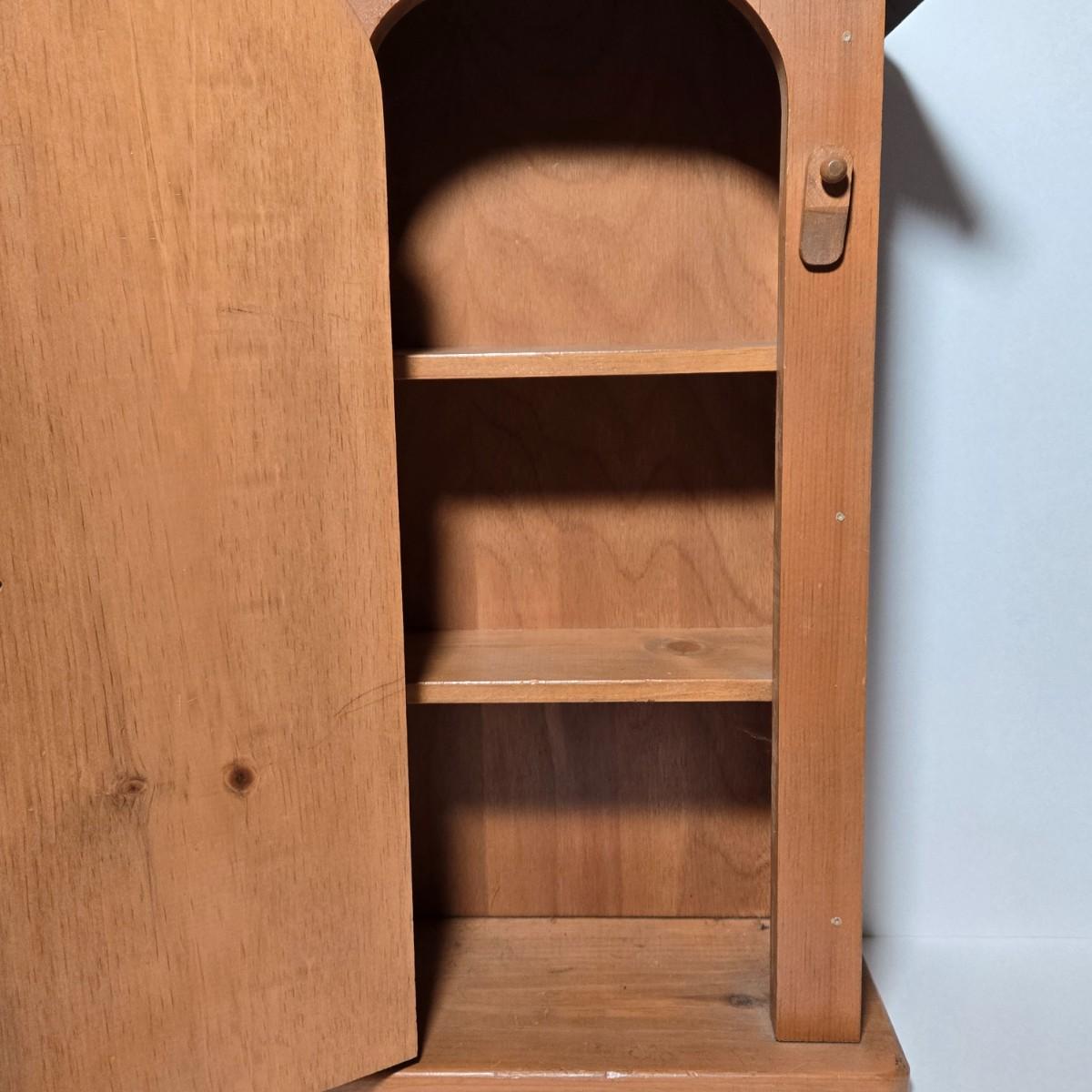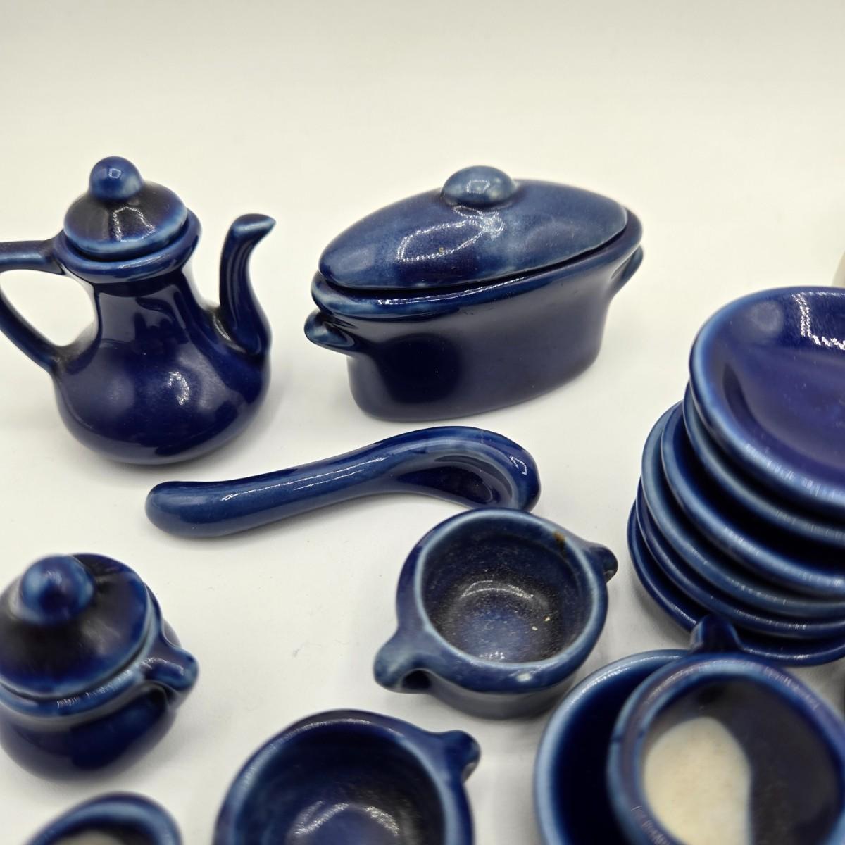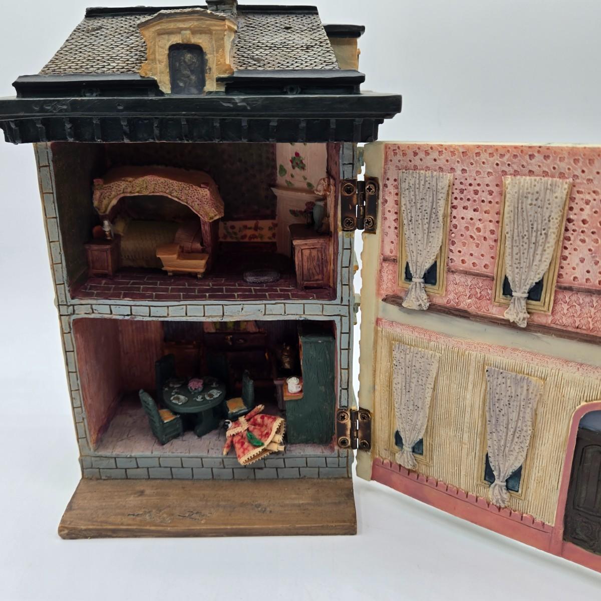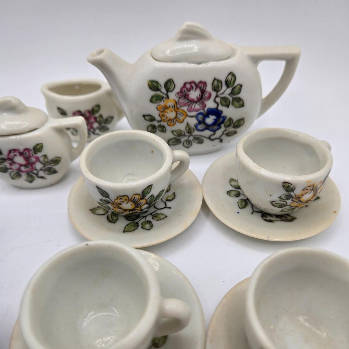 LOT 57A: Wooden House Cabinet with Metal Doll house Furniture, Two Miniature Tea Sets, and More
