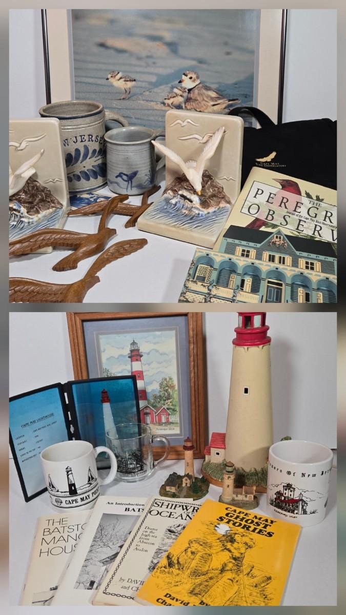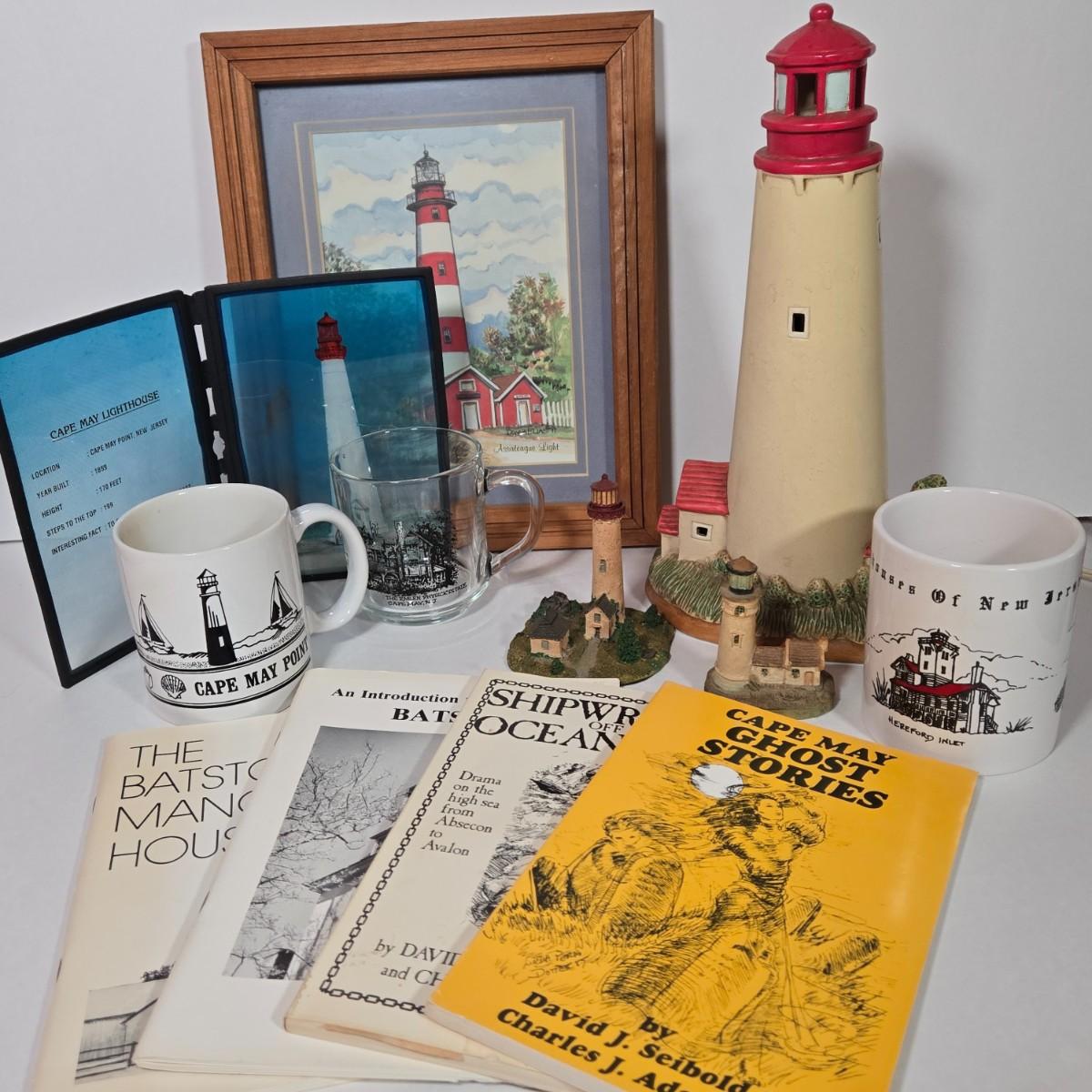 LOT 59A: " On the Way to Cape May..." Sea Gull Print, Bookends, Wall Hangings, Mugs, Light House Print, Light, Miniatures, Books, and More