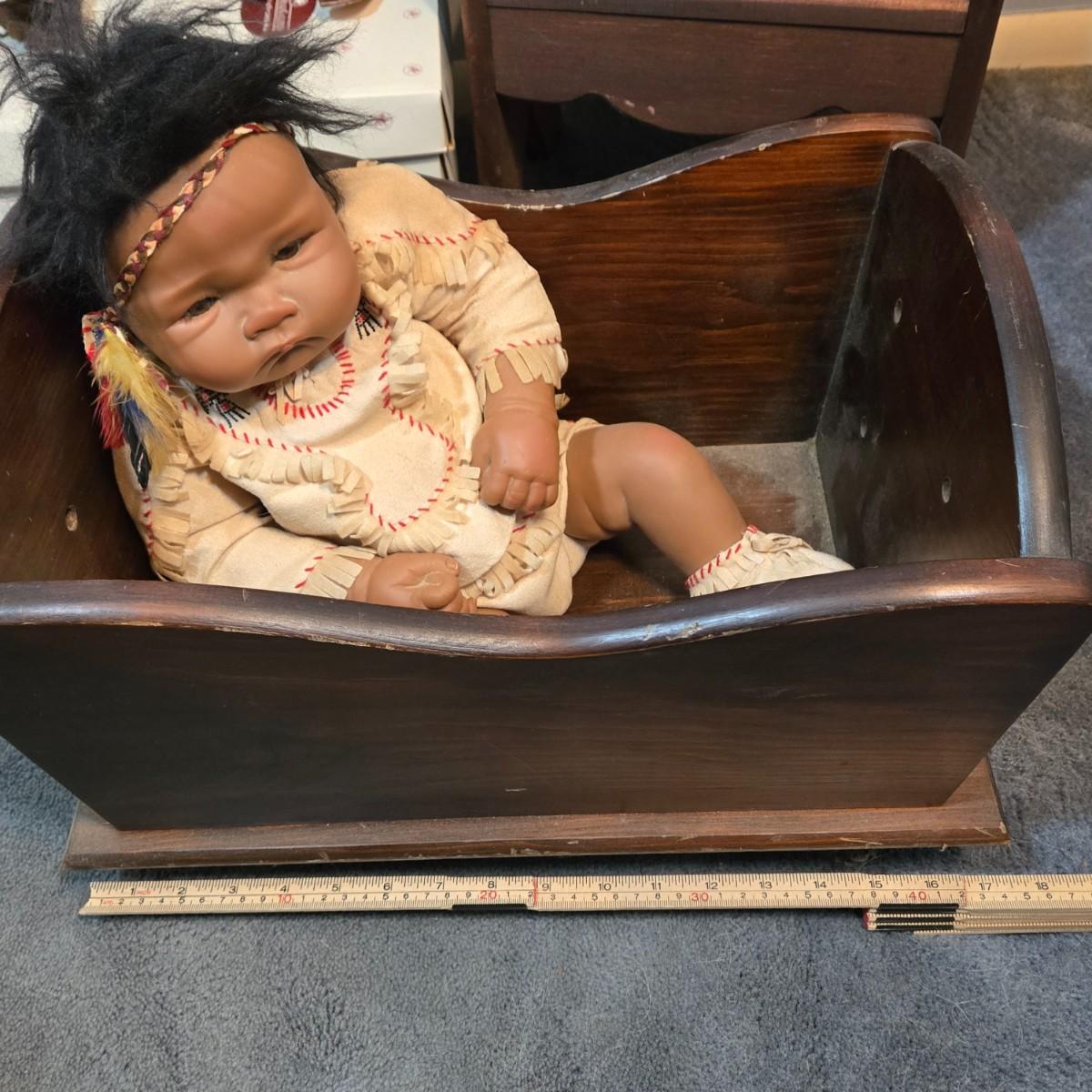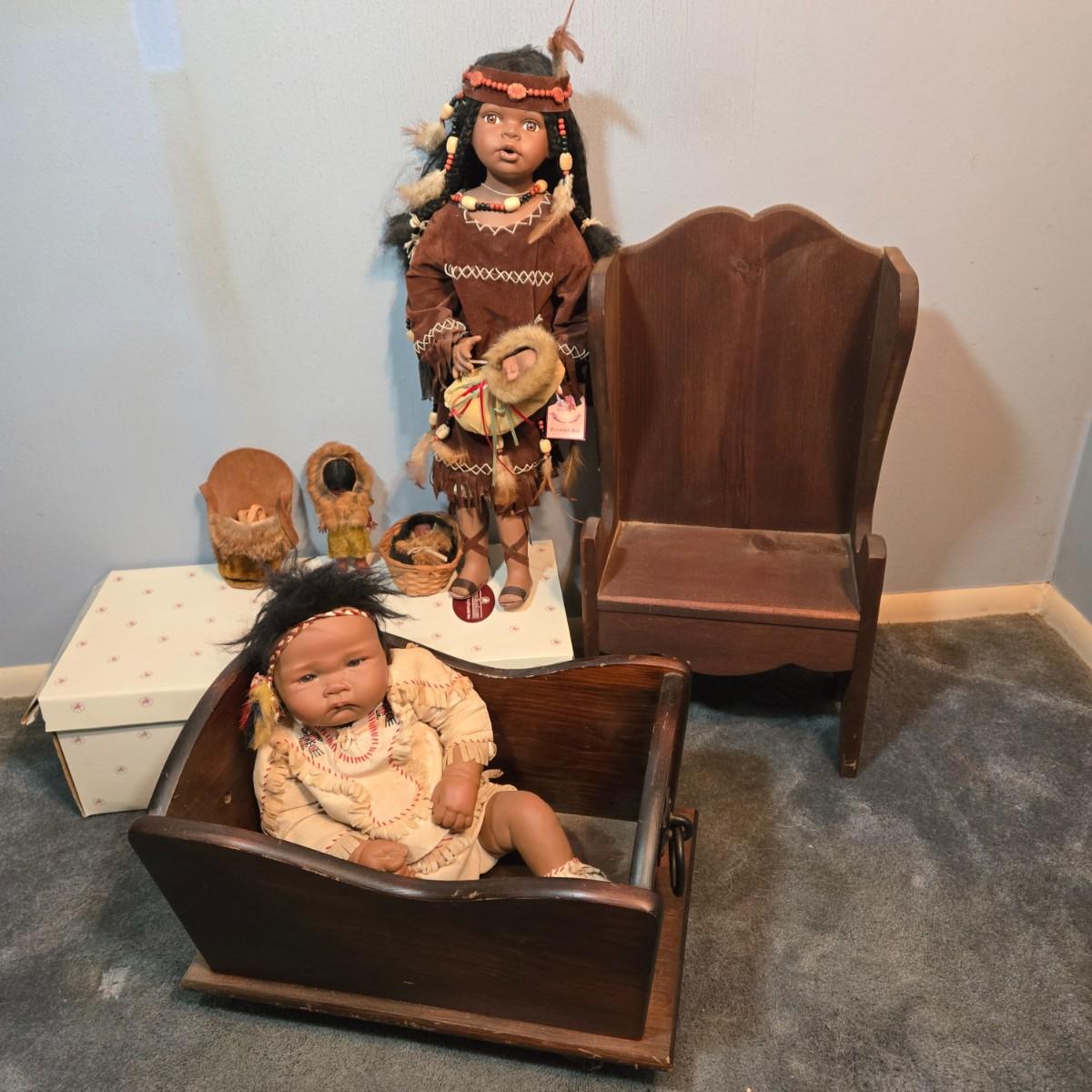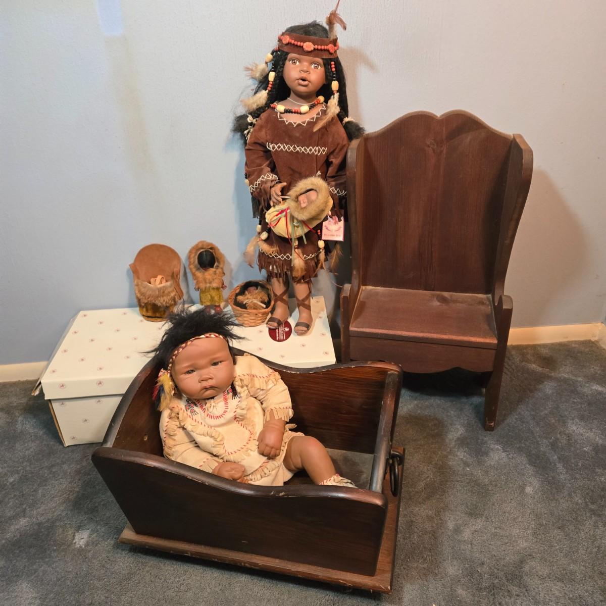 LOT 68B: Native American Porcelain Doll in Original Box, Baby Doll, Wood Doll Cradle, Wood Doll Chair, and More
