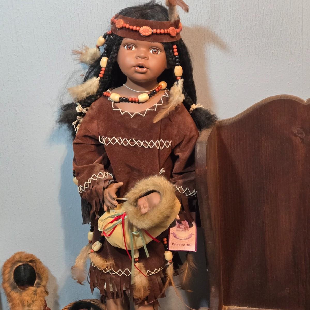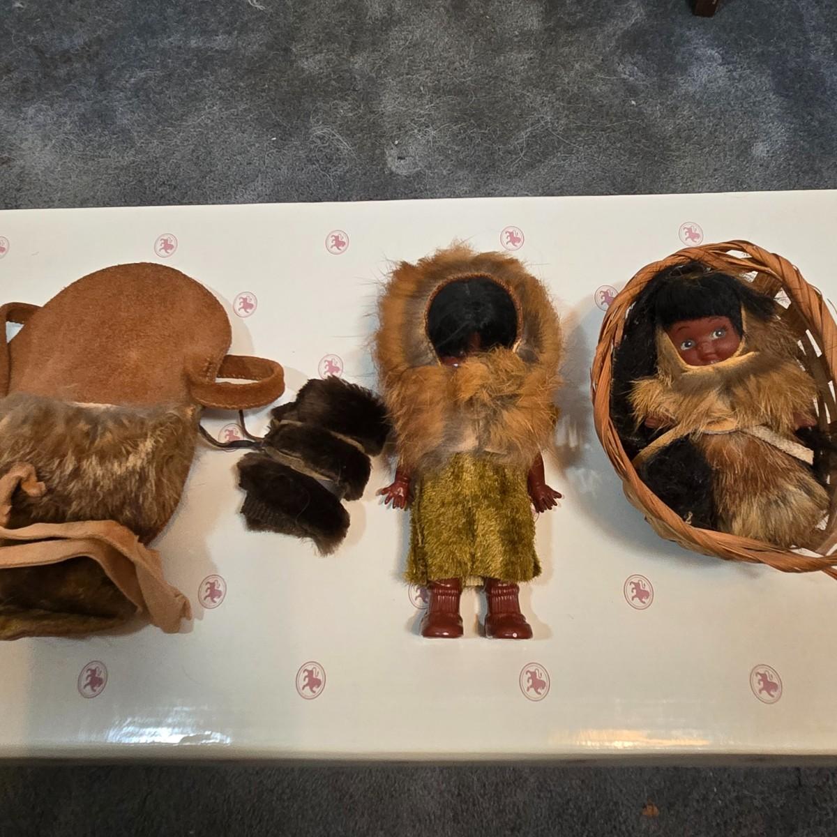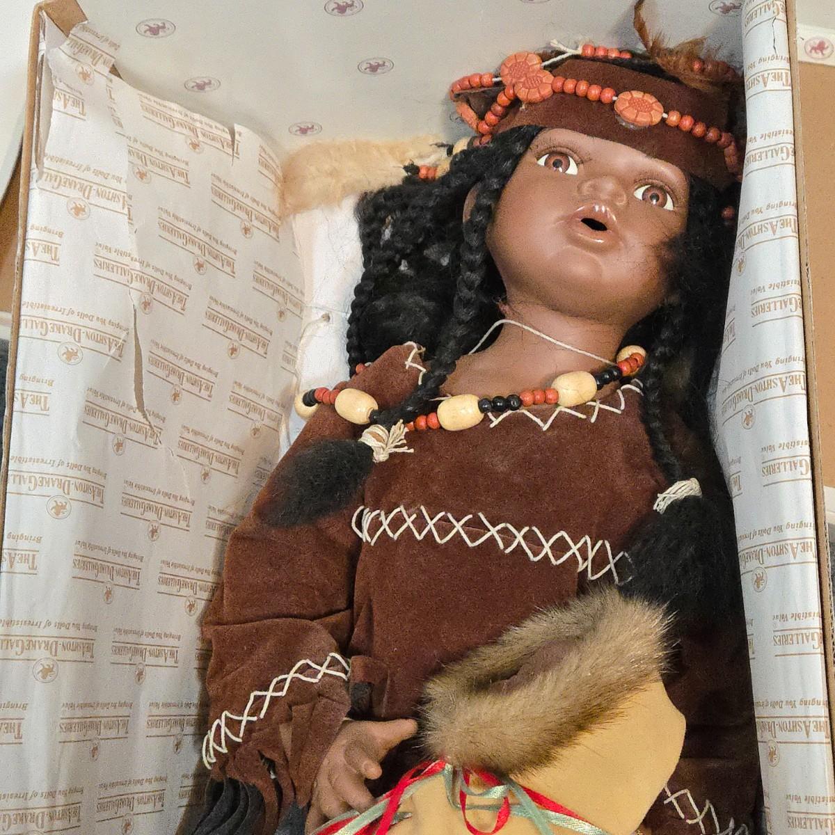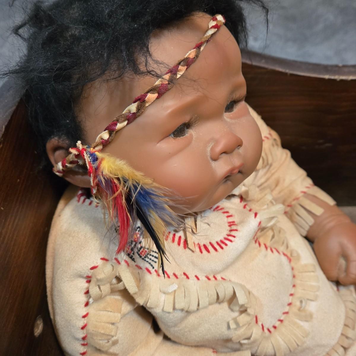 LOT 68B: Native American Porcelain Doll in Original Box, Baby Doll, Wood Doll Cradle, Wood Doll Chair, and More