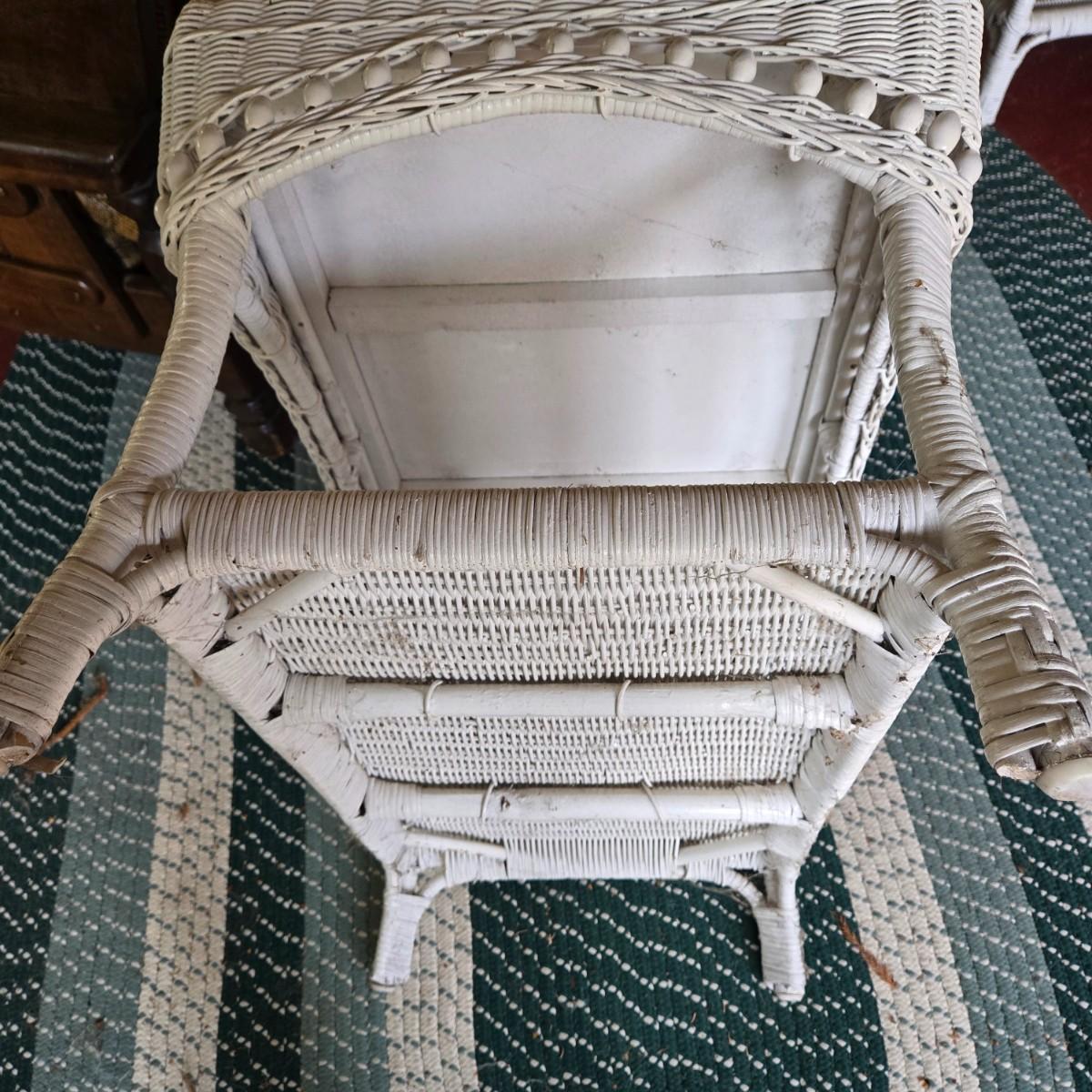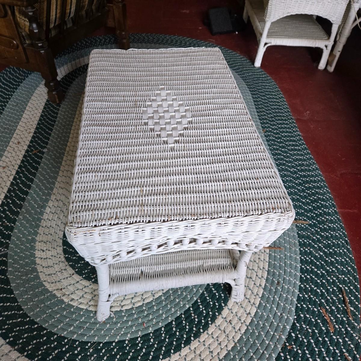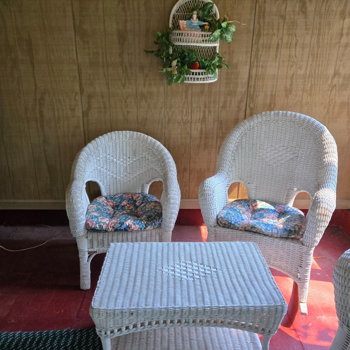 LOT 127S: White Wicker Chair & Rocking Chair with Cushions, Coffee Table, and Wall Shelf