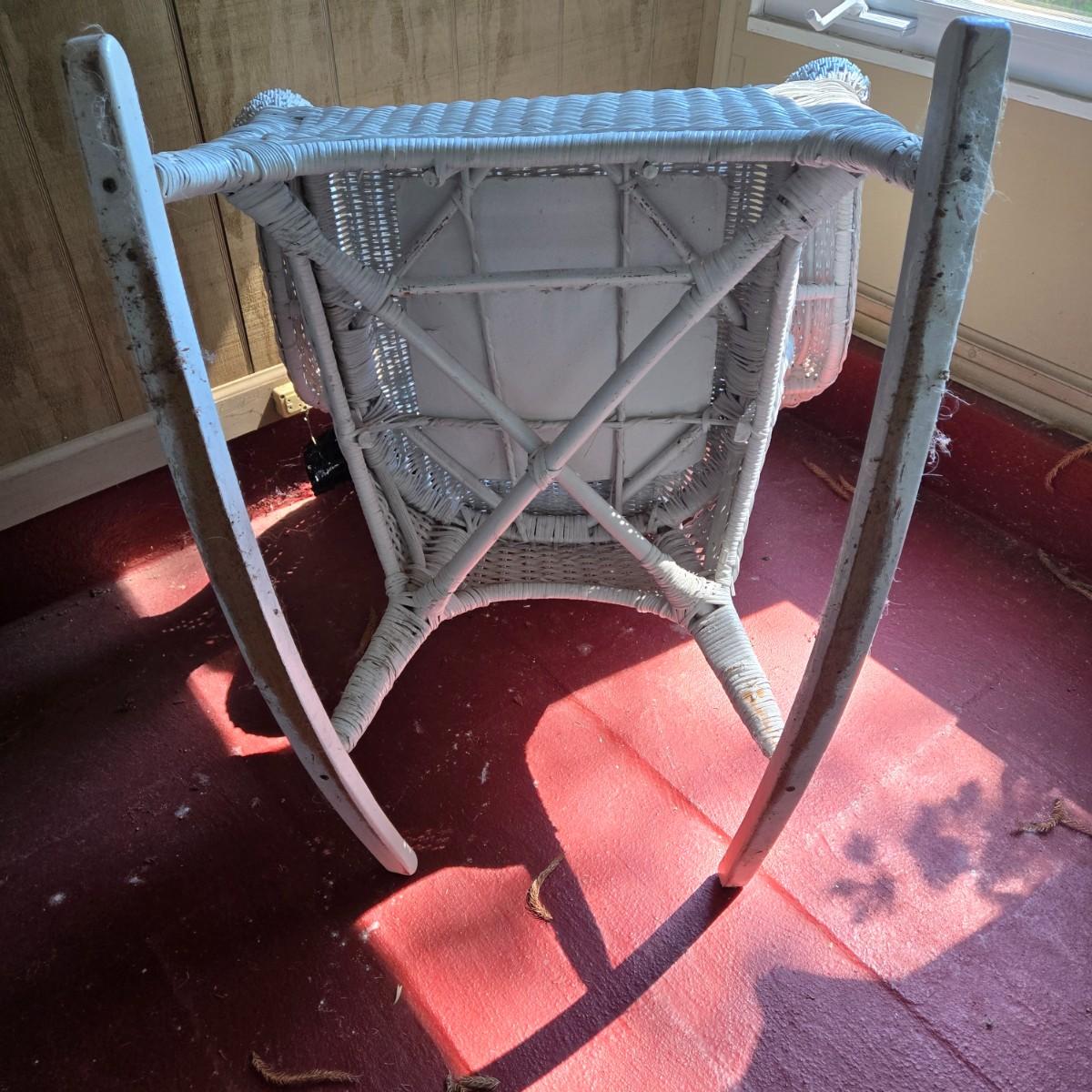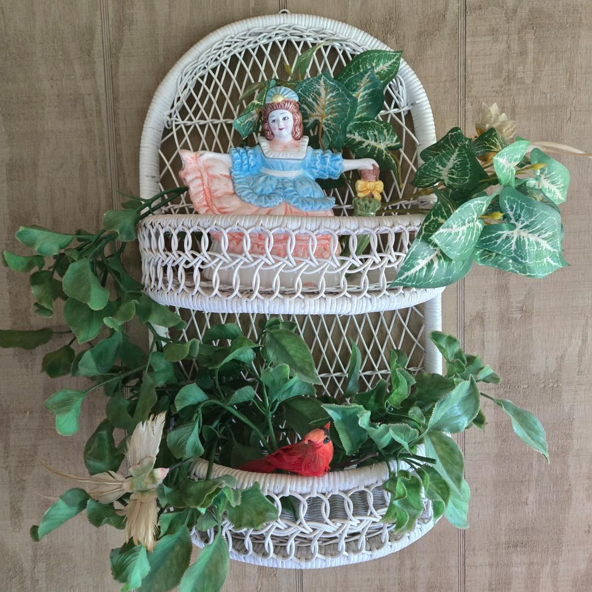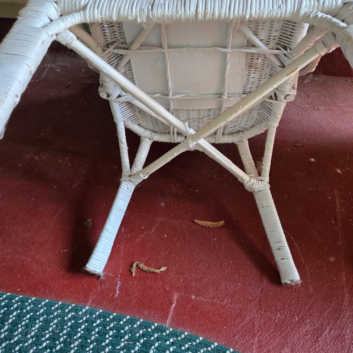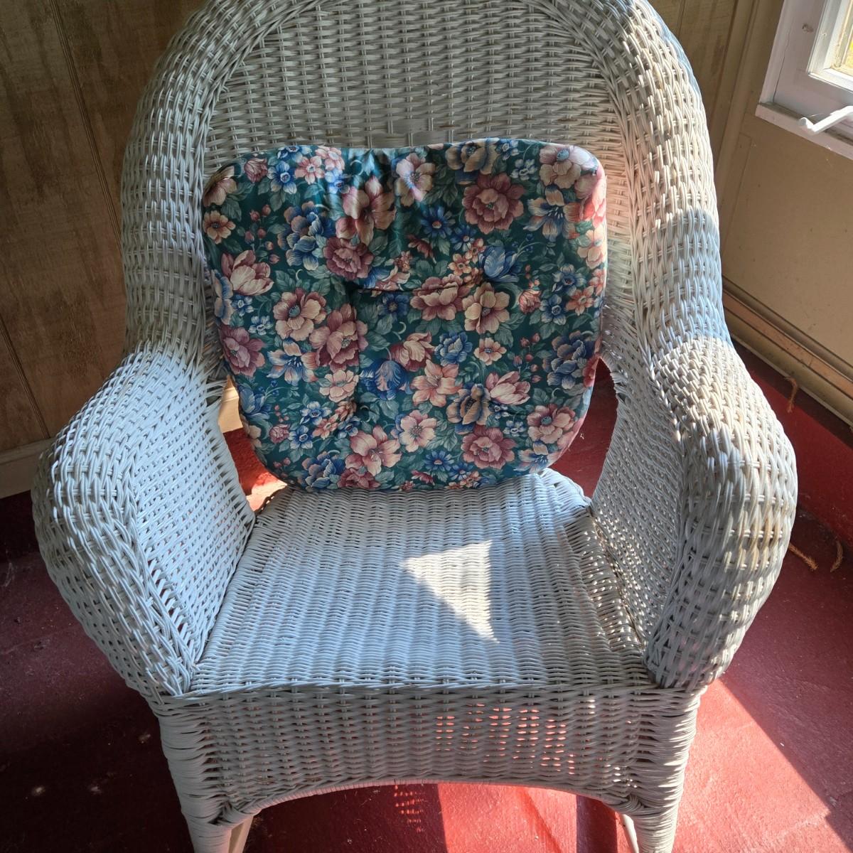 LOT 127S: White Wicker Chair & Rocking Chair with Cushions, Coffee Table, and Wall Shelf