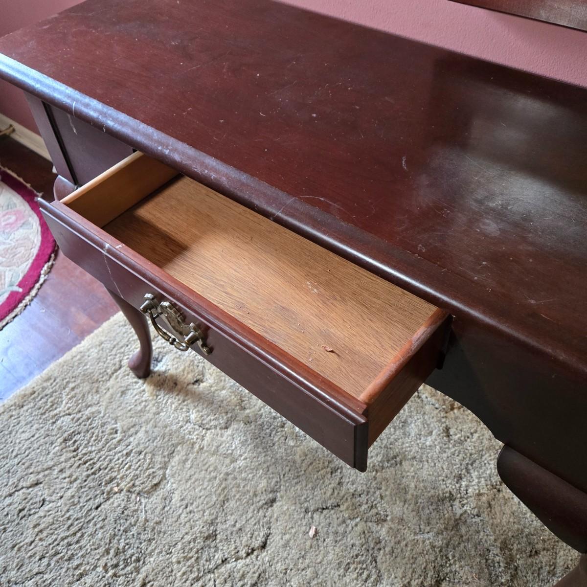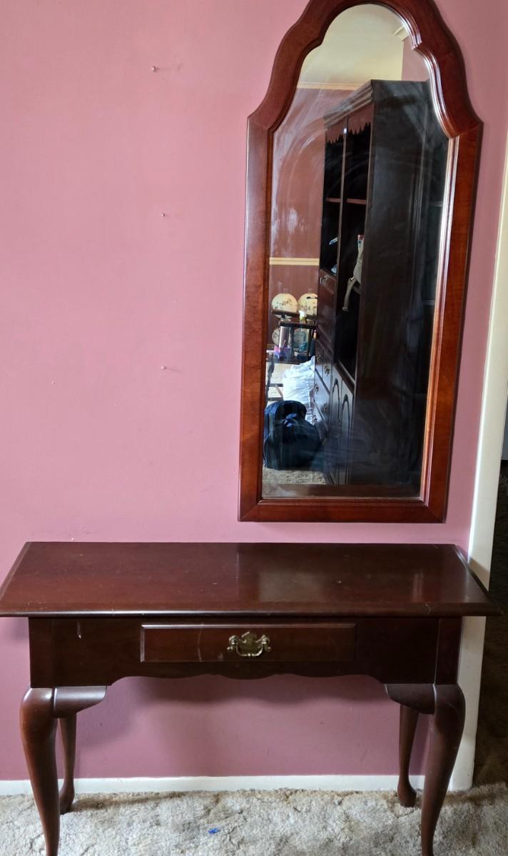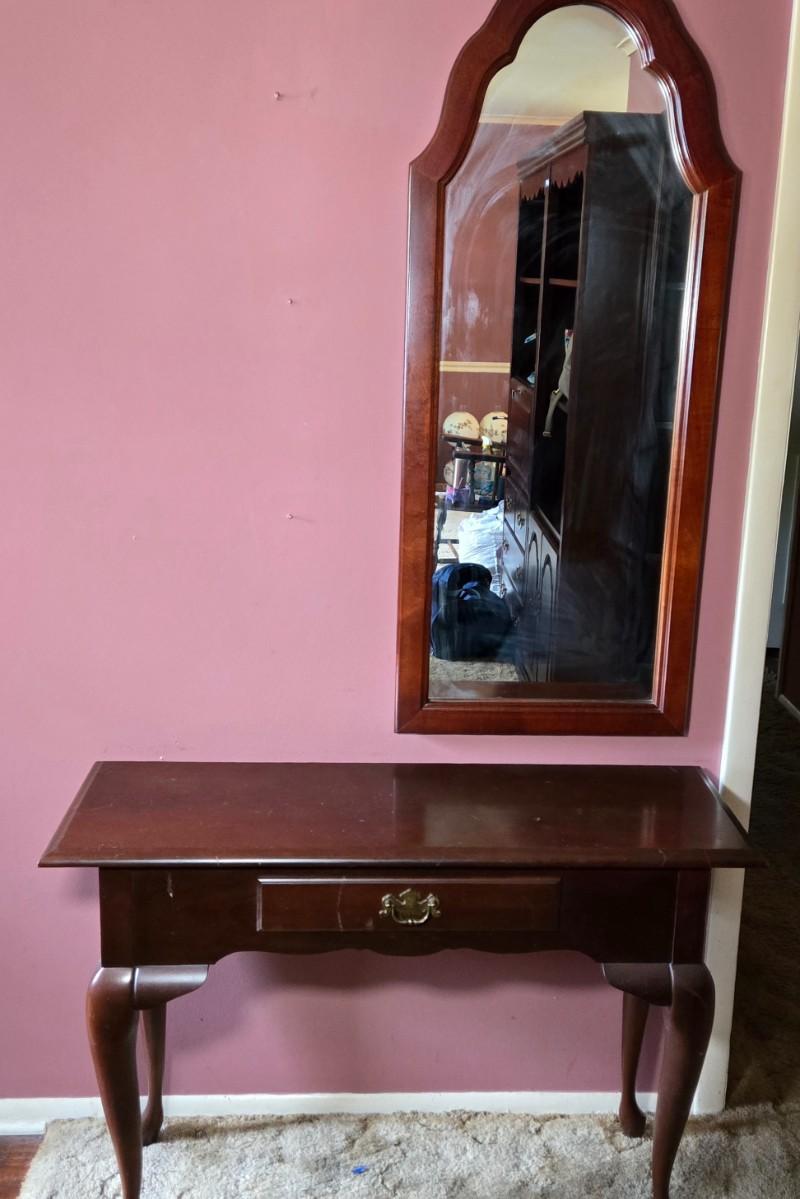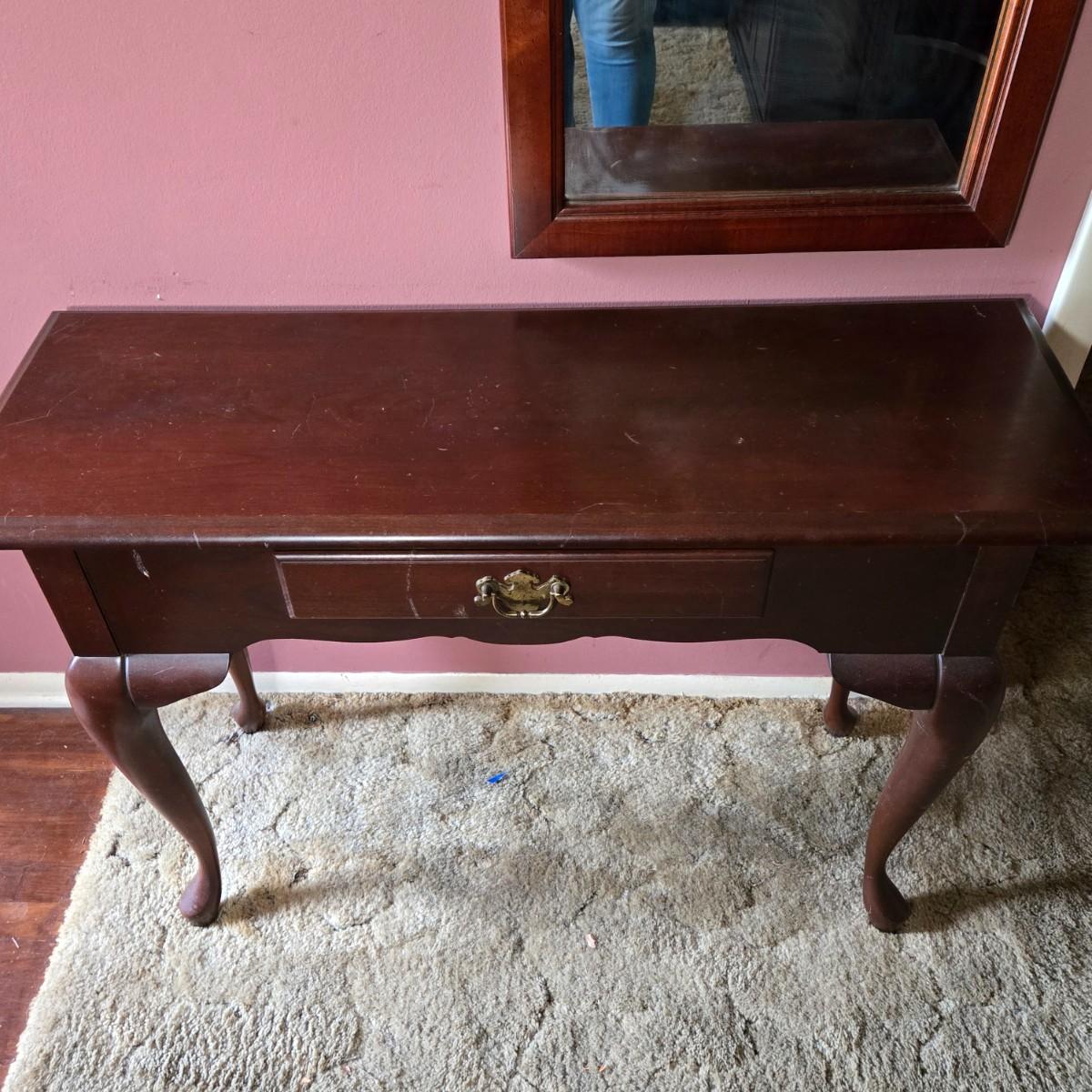 Table is 40x14x+28 high/ mirror is 19x46/ Table has some scratches as shown in photos. Please see all pictures as they are the best representation of the items. The pictures show condition, measurements if taken, and what is included in the lot. Due to the large amount that we photograph and the time frame, we are not always able to take measurements. All items unless noted, are pre-owned and have been used. If you purchased furniture, you must bring help. We do not allow one person to carry large furniture out on their own. Bring help, tools and a truck for the safety of our client’s homes, and your personal safety. Any damages that result to the property including walls, and floors due to moving of the furniture will be charged to the buyer. Company policy. Thank you.
