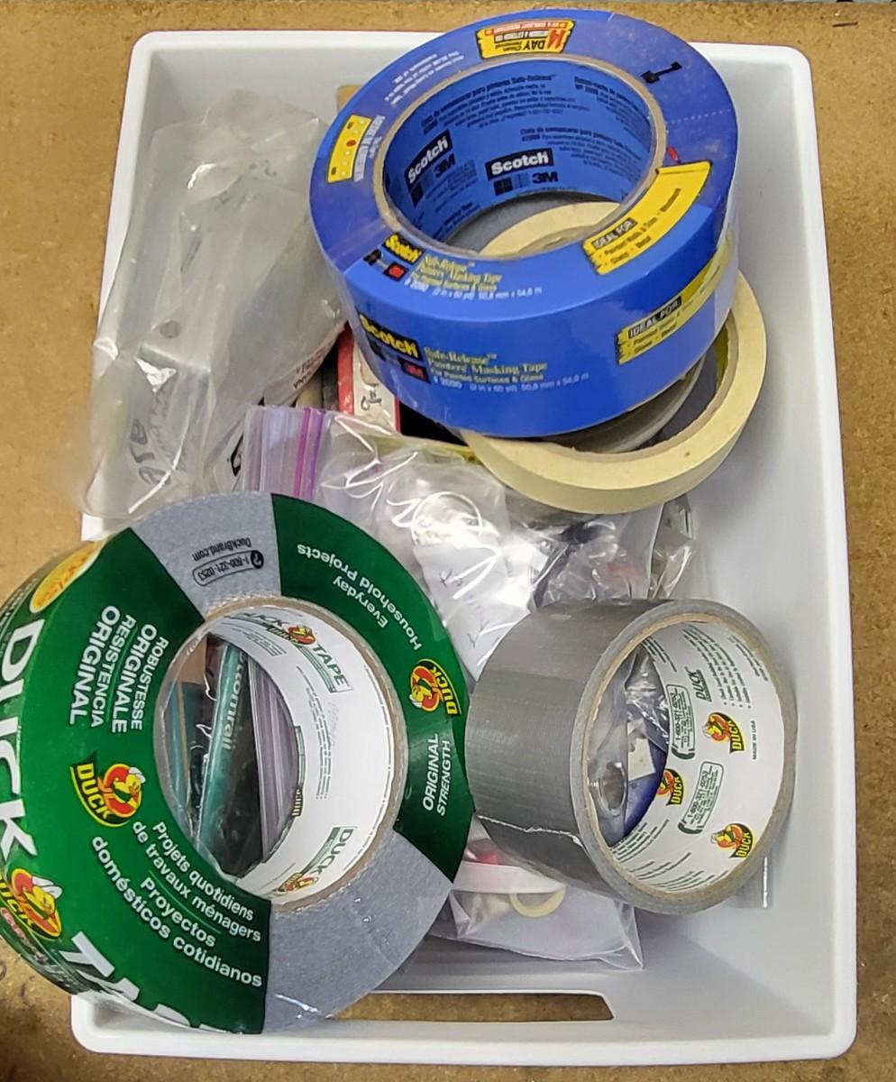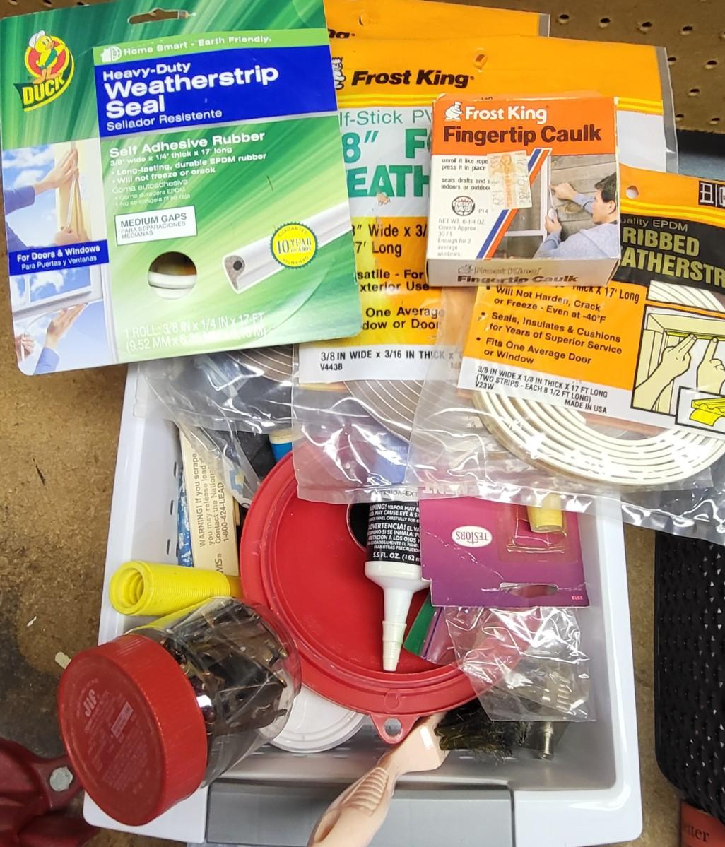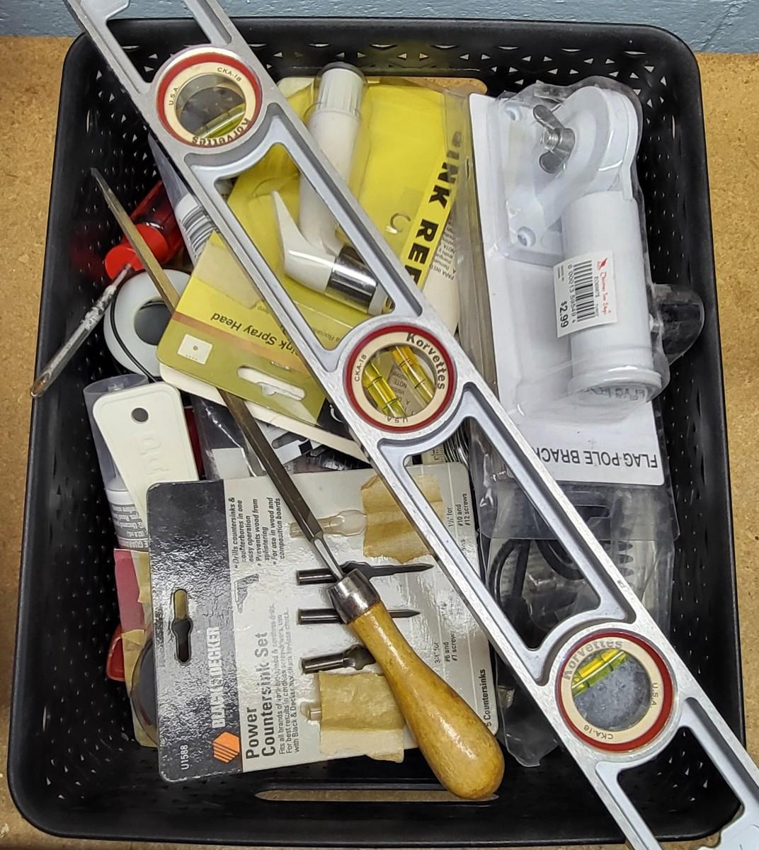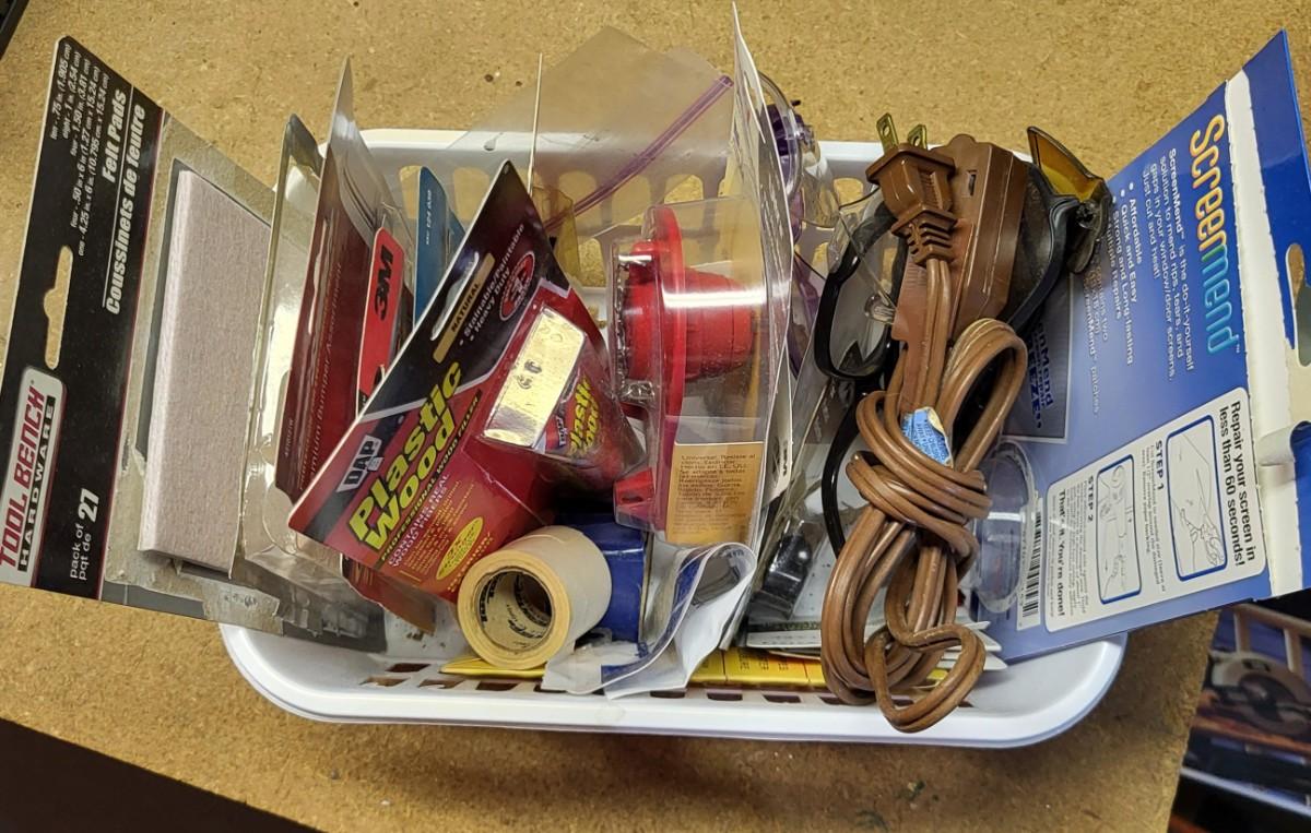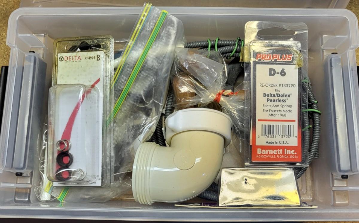 LOT 18B: Five Bins of Various Handyman Tools and Handyman Book