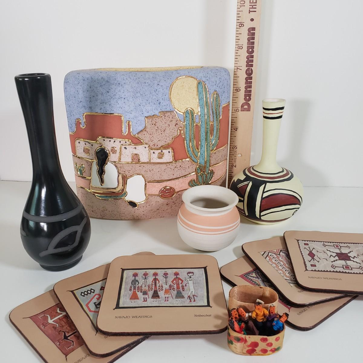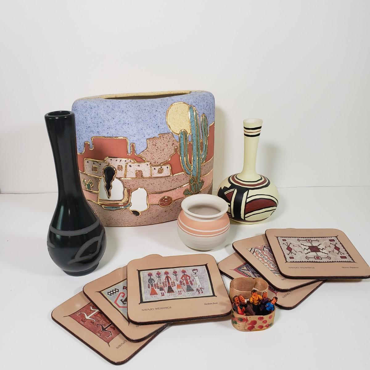 LOT 30D: Southwest Decor Assortment; Signed Pottery, Pimpernel Coaster Set, and More