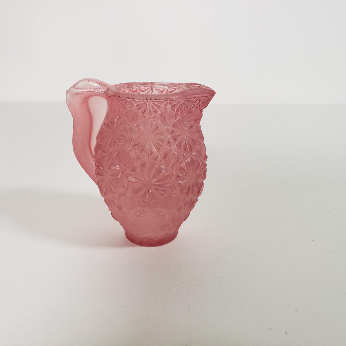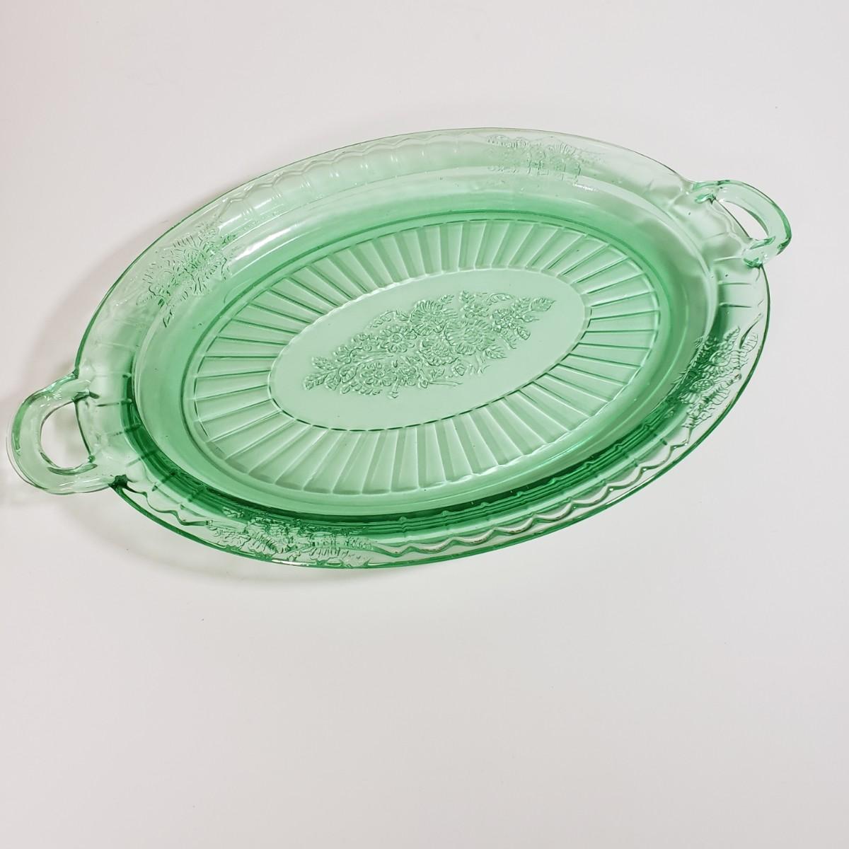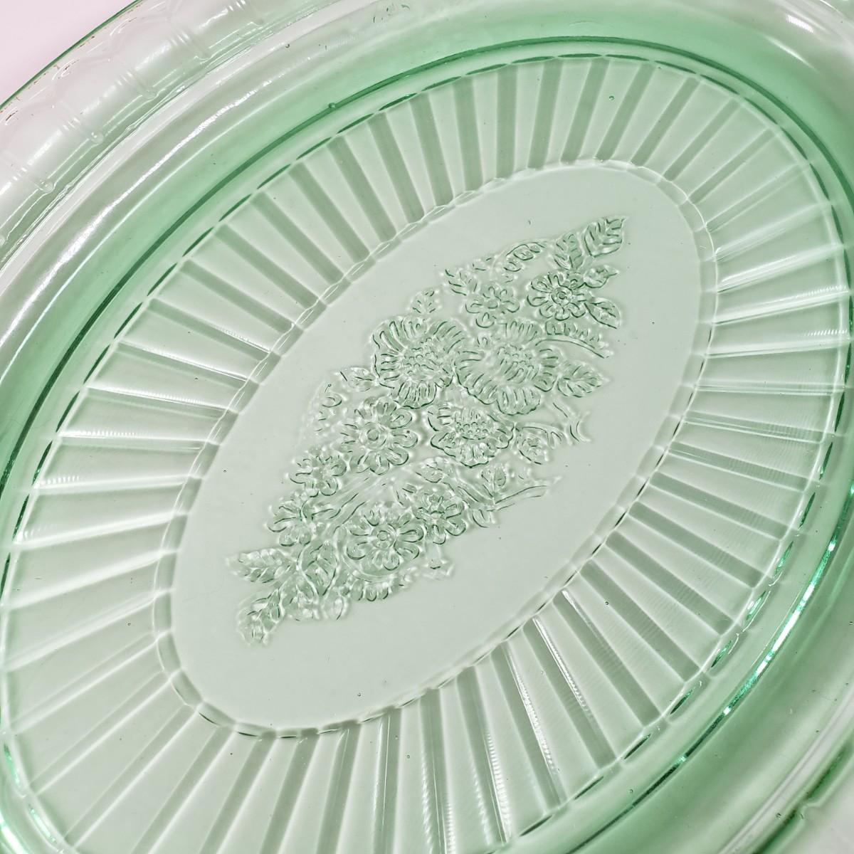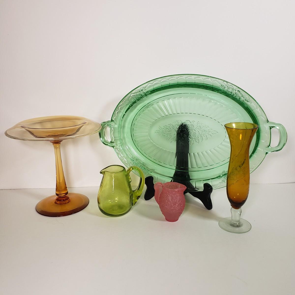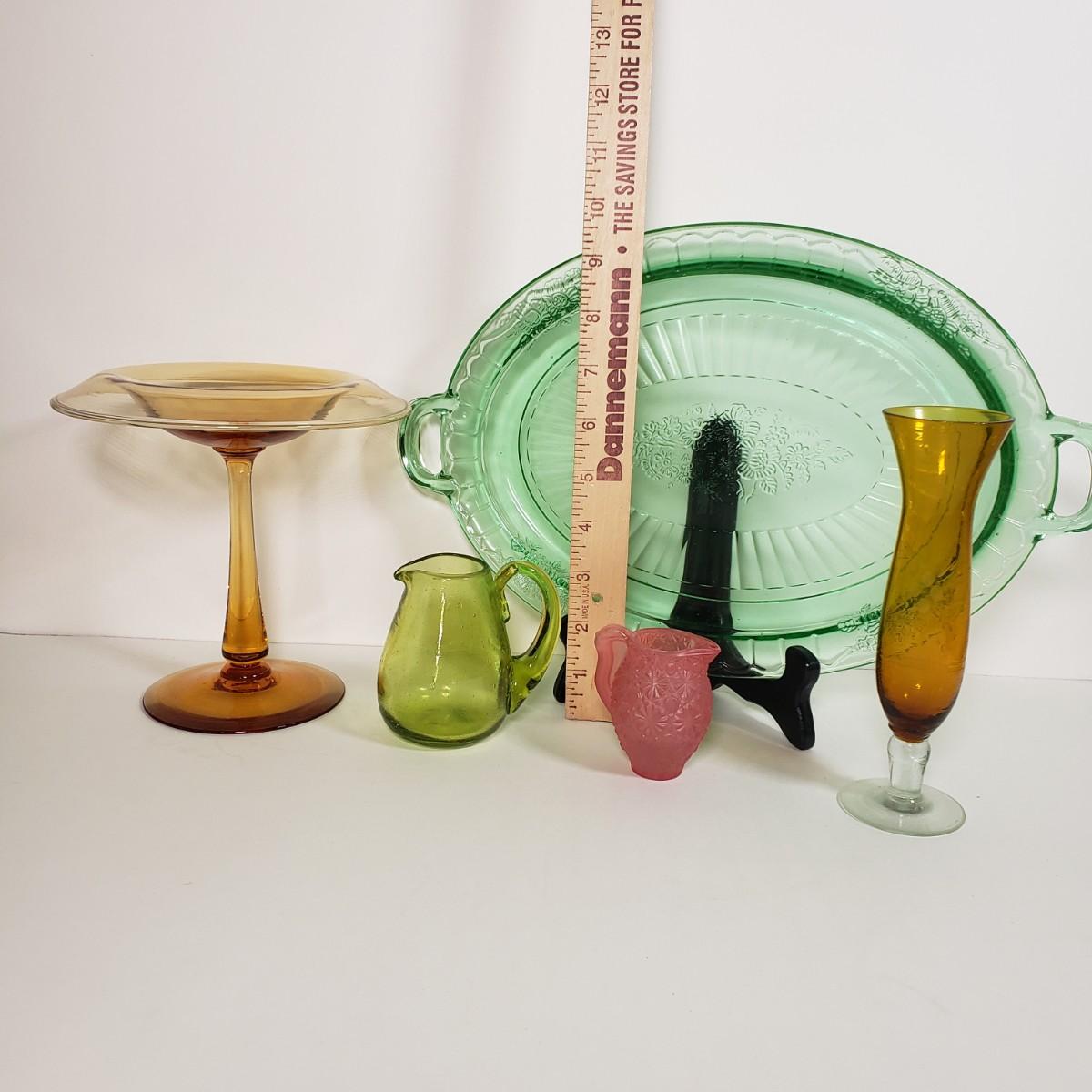 Lot 32: Anchor Hocking Mayfair Green Depression Glass Oval Platter, Vintage Mini Pitcher Daisy & Button Pink Glass Toothpick Holder, Fostoria Compote & More