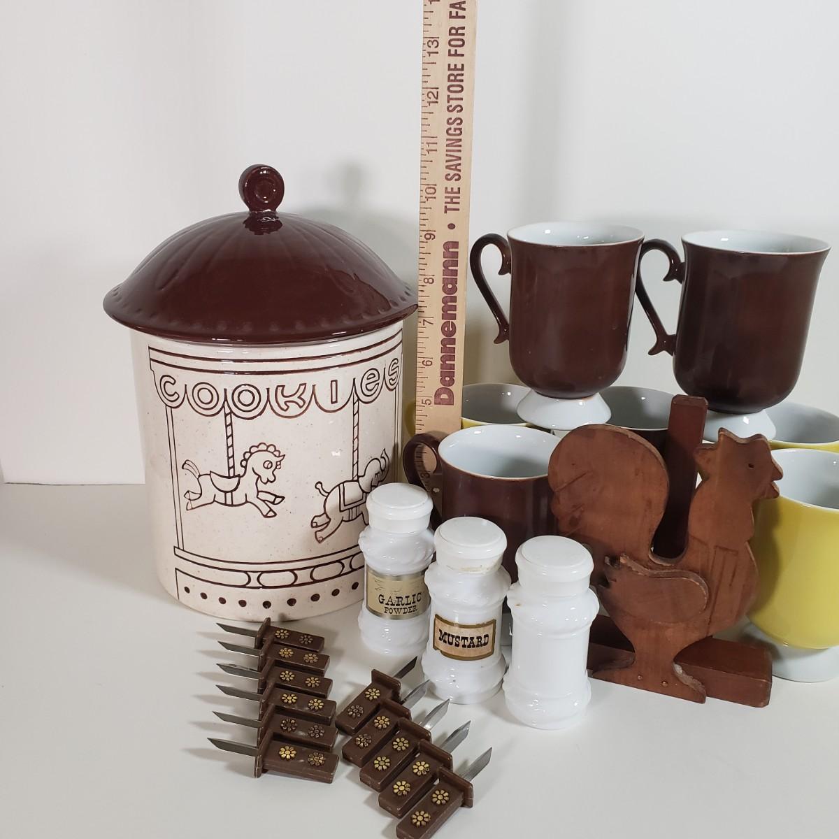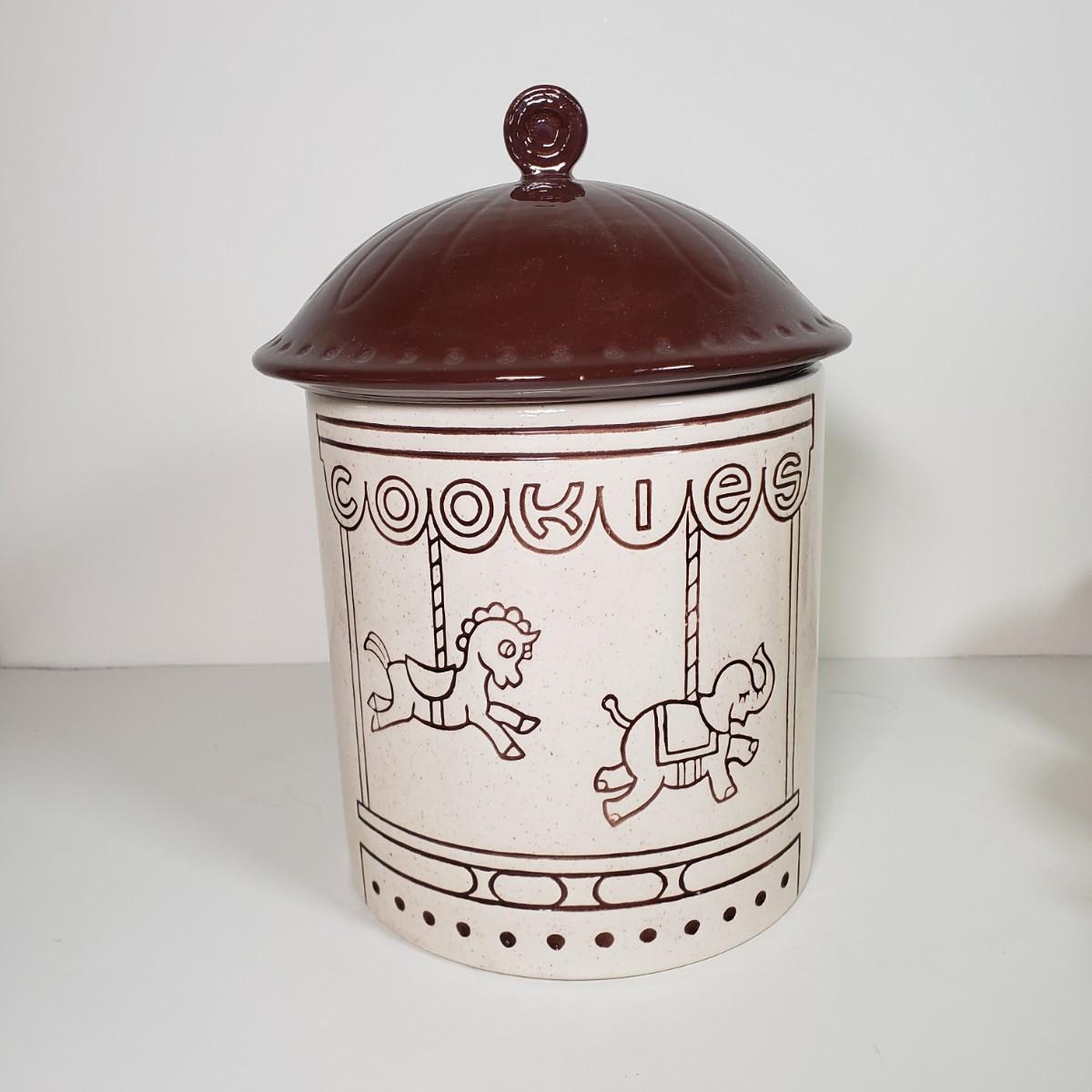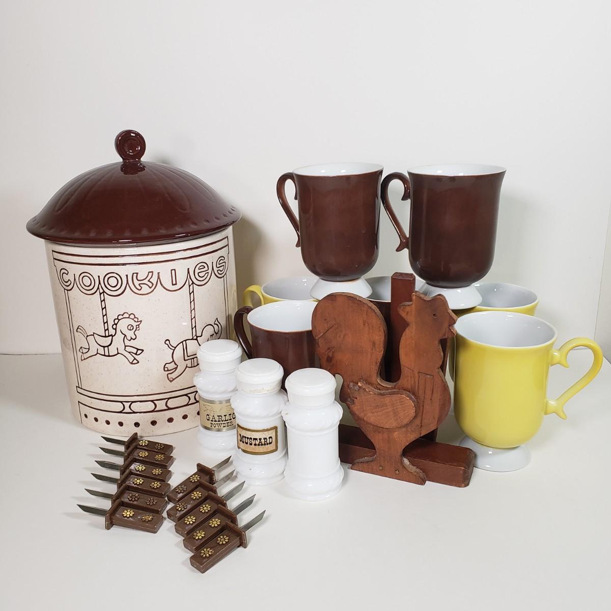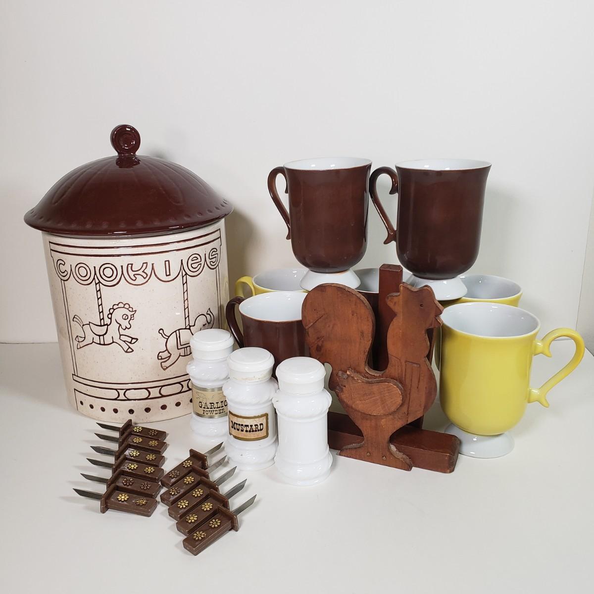 LOT 33K: Vintage Kitchen Assortment Mid Century featuring Hard to find Ceramic Carousel Horse & Elephant Cookie Jar