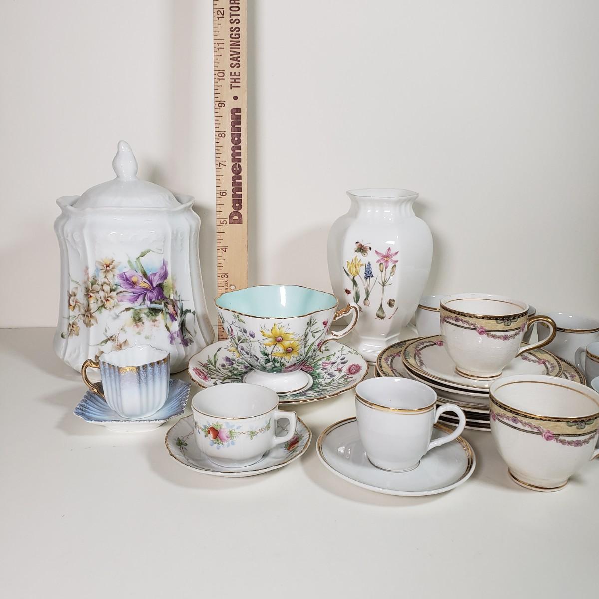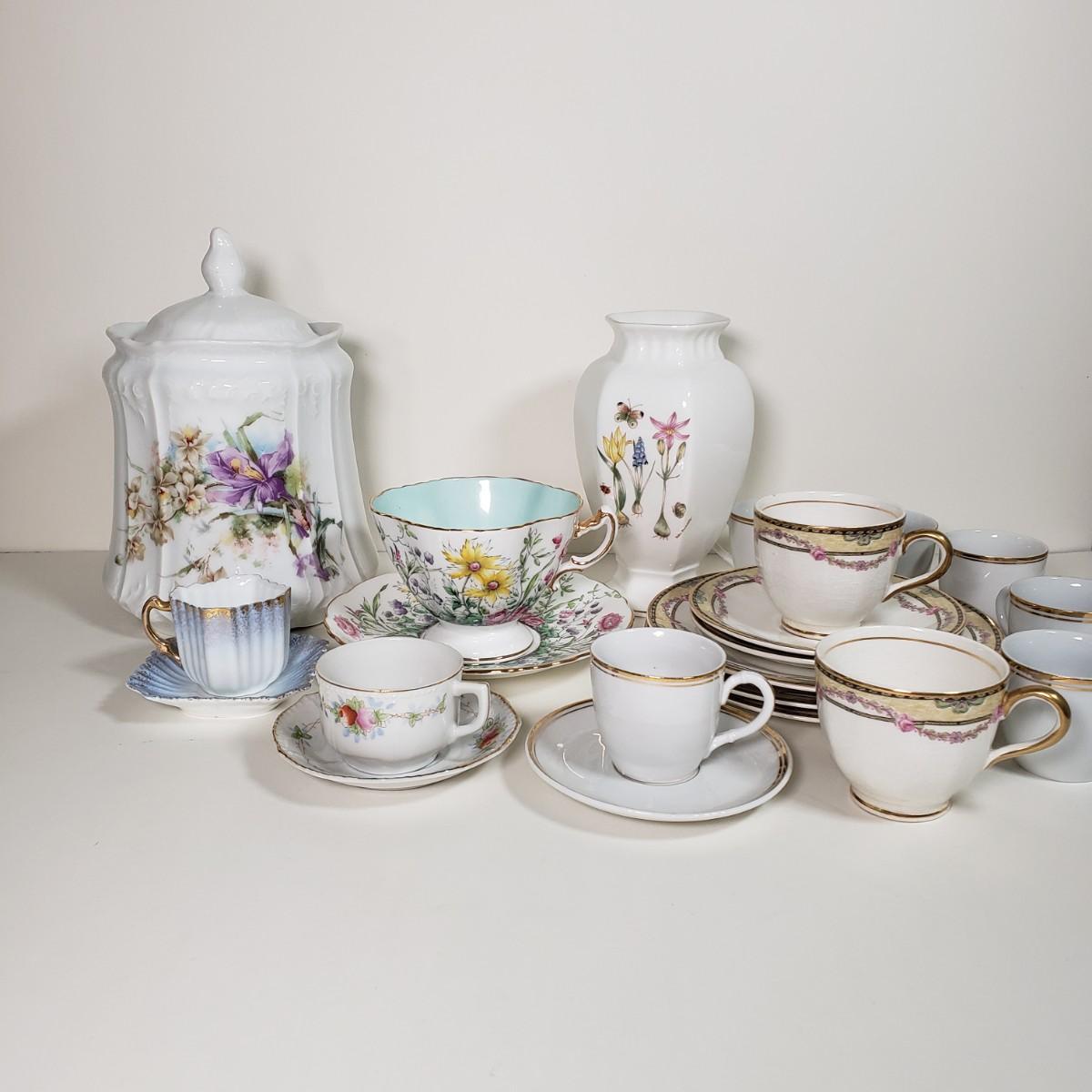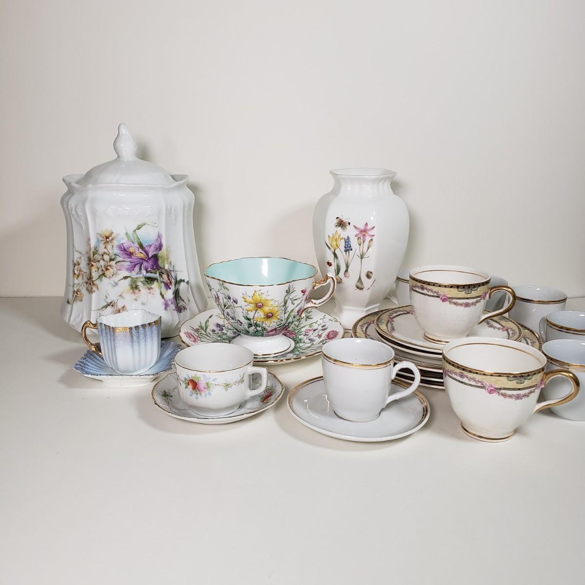 LOT 34D: Vintage/Antique Hand Painted Porcelain, Bone China & Ceramic Assortment; Biscuit Jar, Teacups, and More