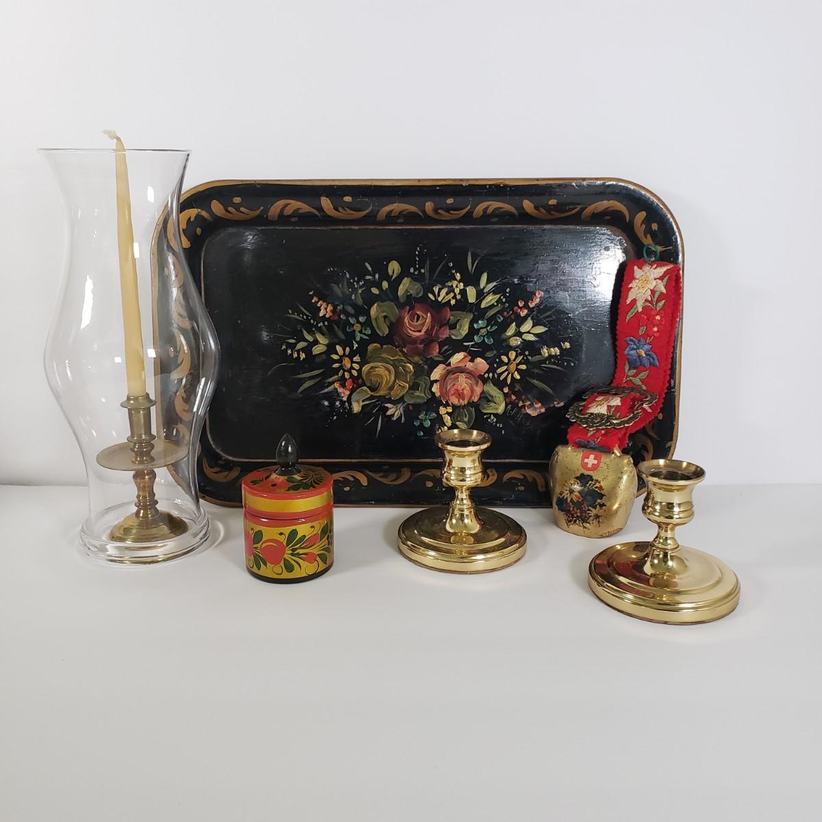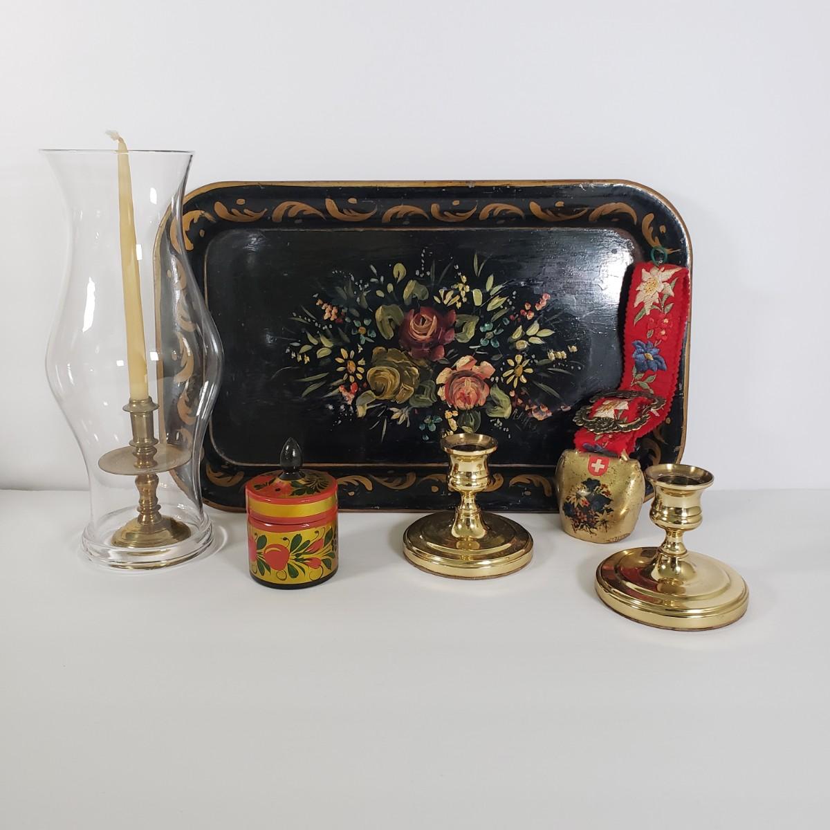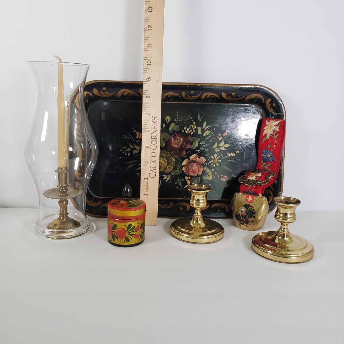 LOT 35K: Vintage Lot- Russian Ussr Hand Painted Lacquered Wood Container, Baldwin Brass Candlesticks, Toleware Tray & More