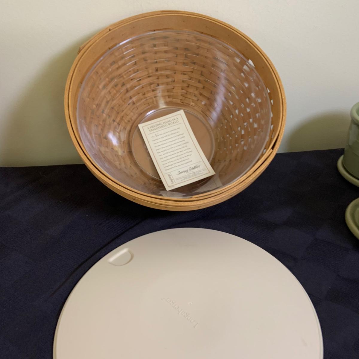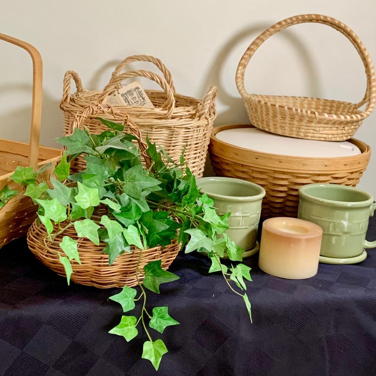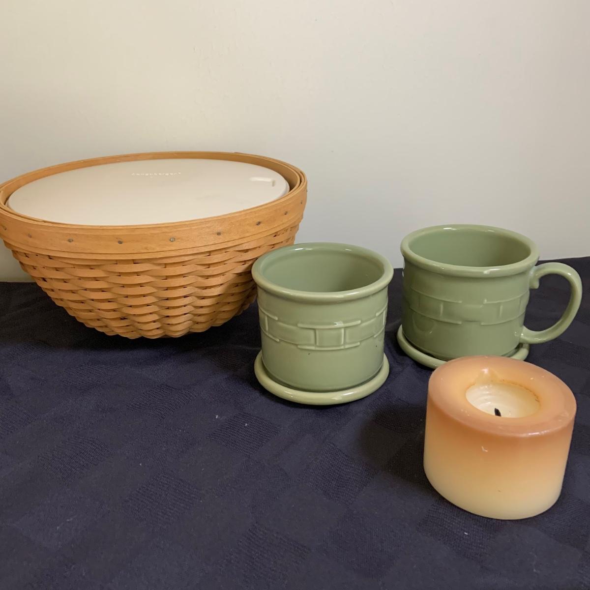 LOT 44L: Longaberger Baskets & More: Longaberger Candle Holders & Candle, Mug w/ Lid, Signed Basket w/ Lidded Bowl Insert