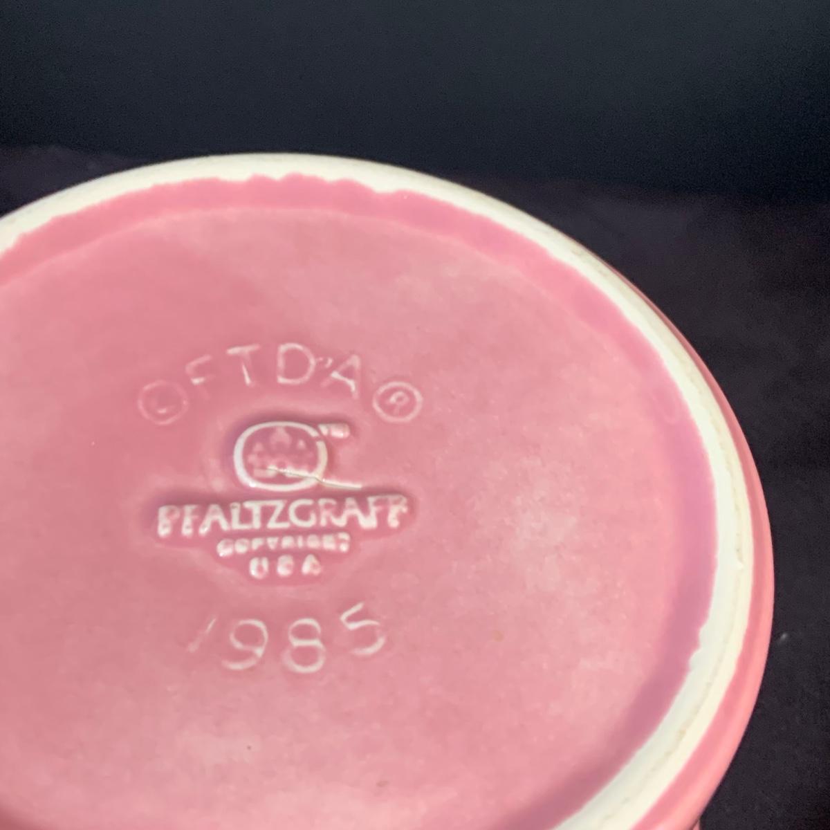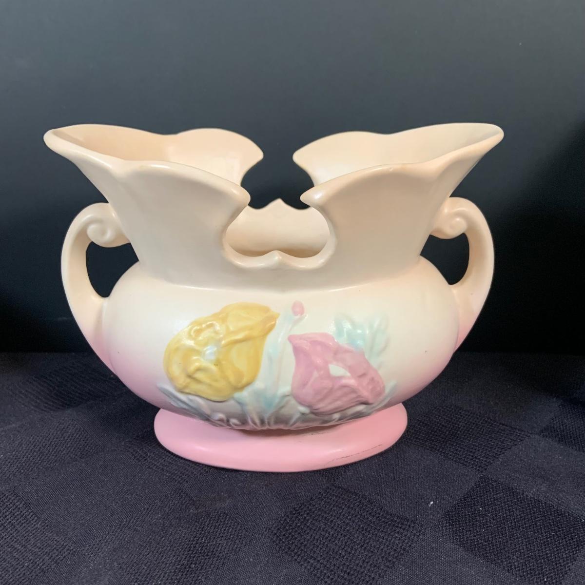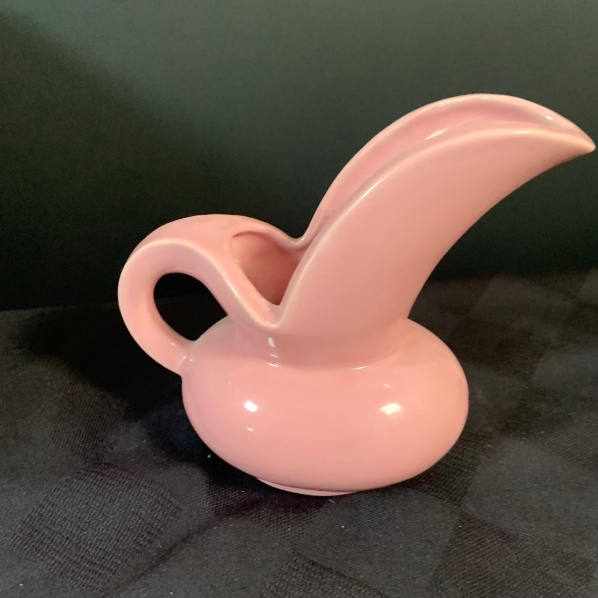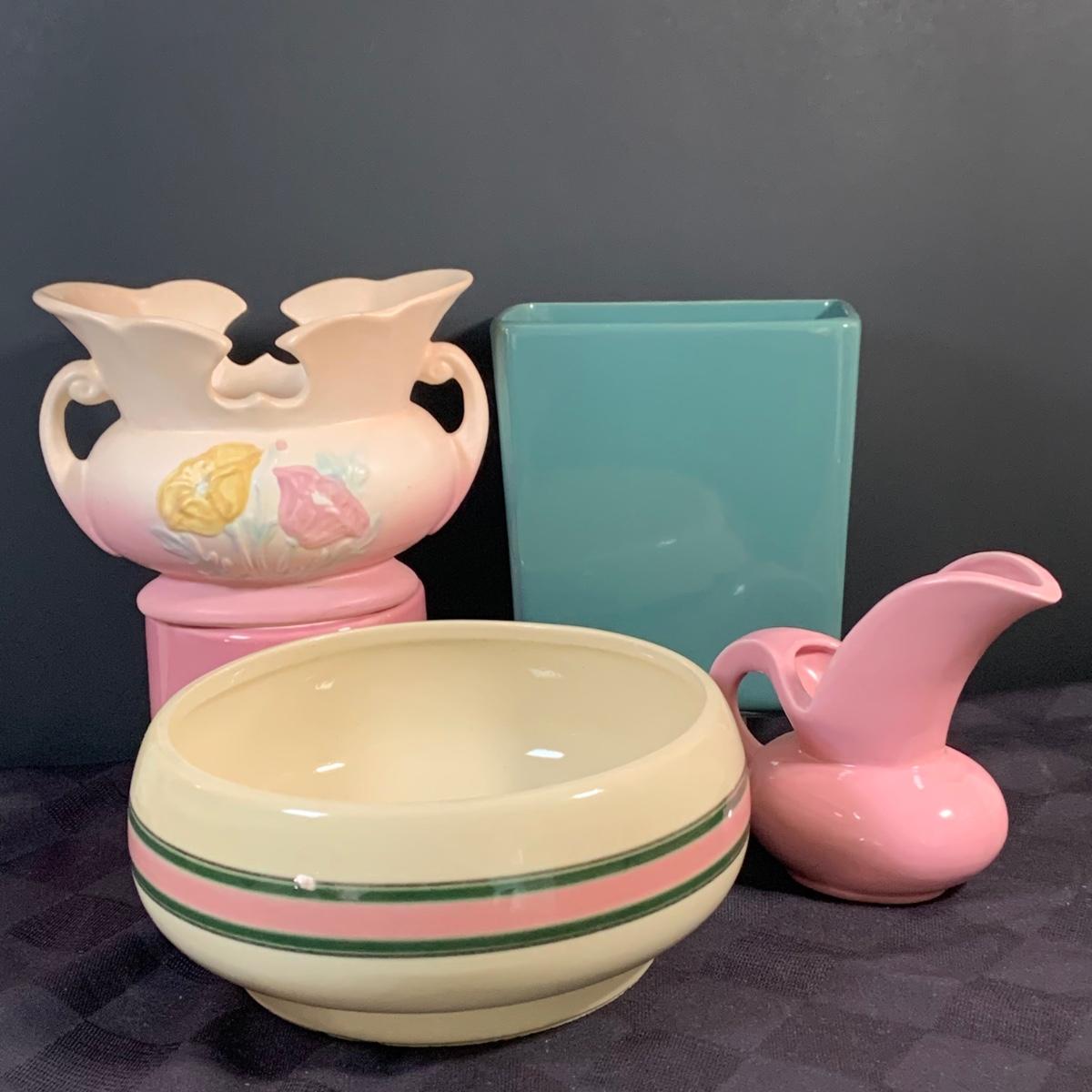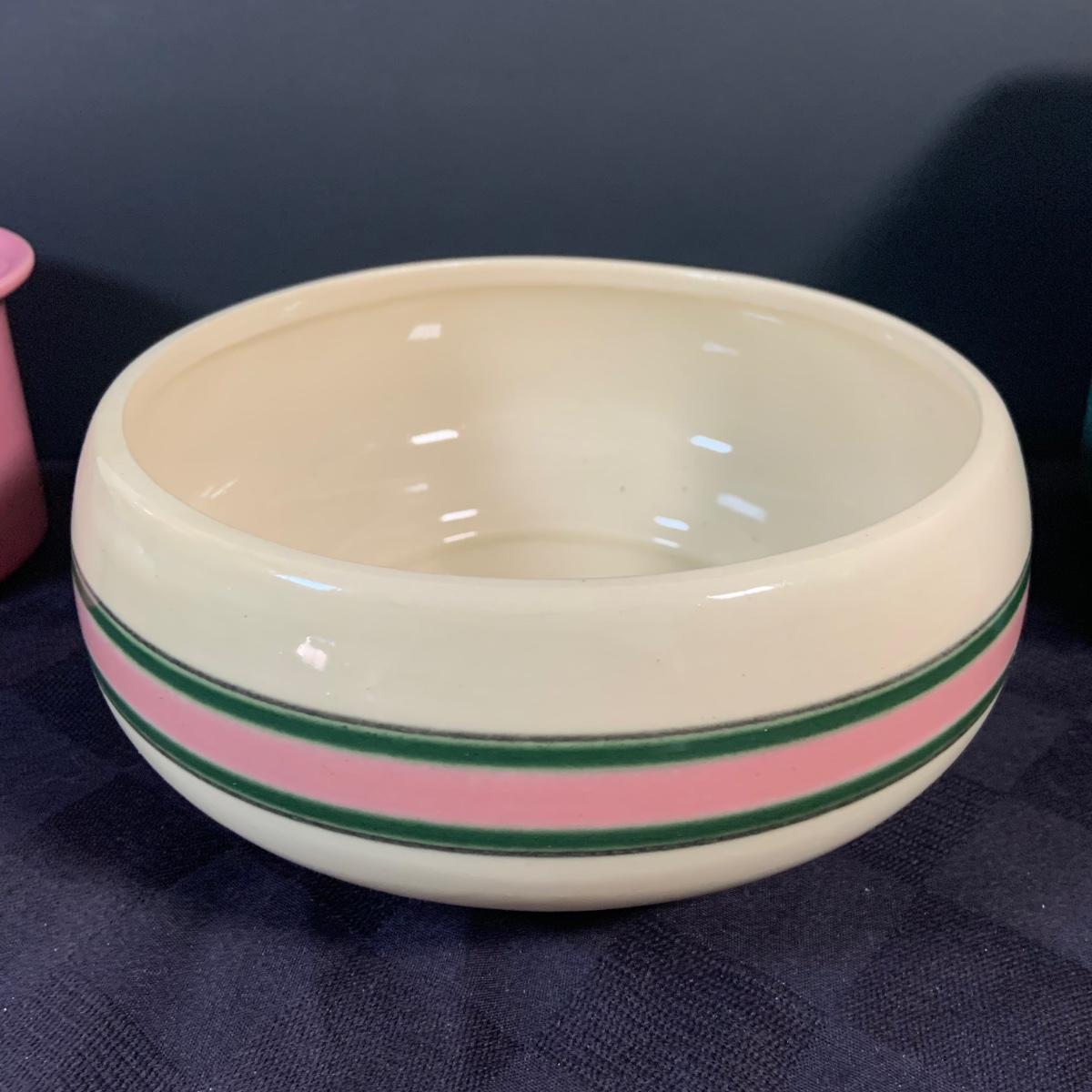 LOT 52K: Hull Pottery Poppy Low Bowl, Cookson Pottery Striped Bowl/Planter. Pink Pfaltzgraff Planter, Turquoise Ceramic Planter and Pink Pitcher