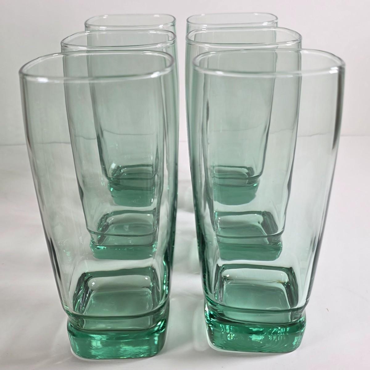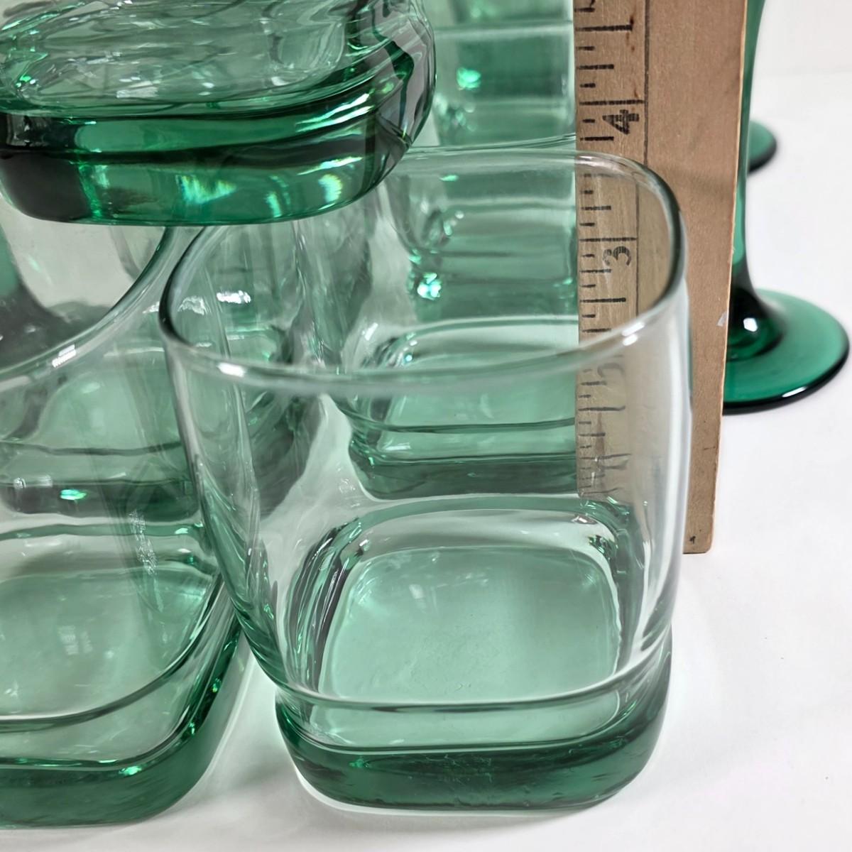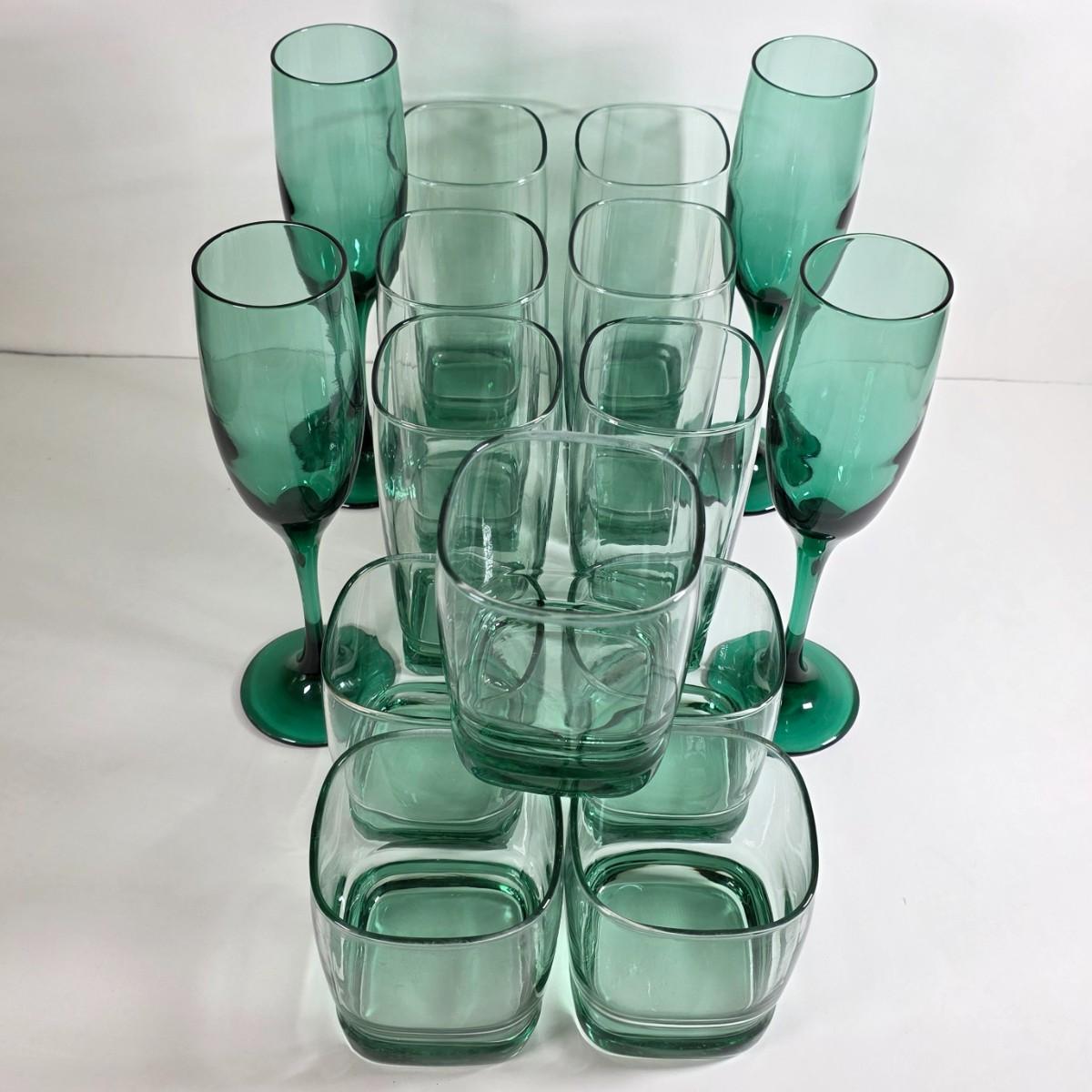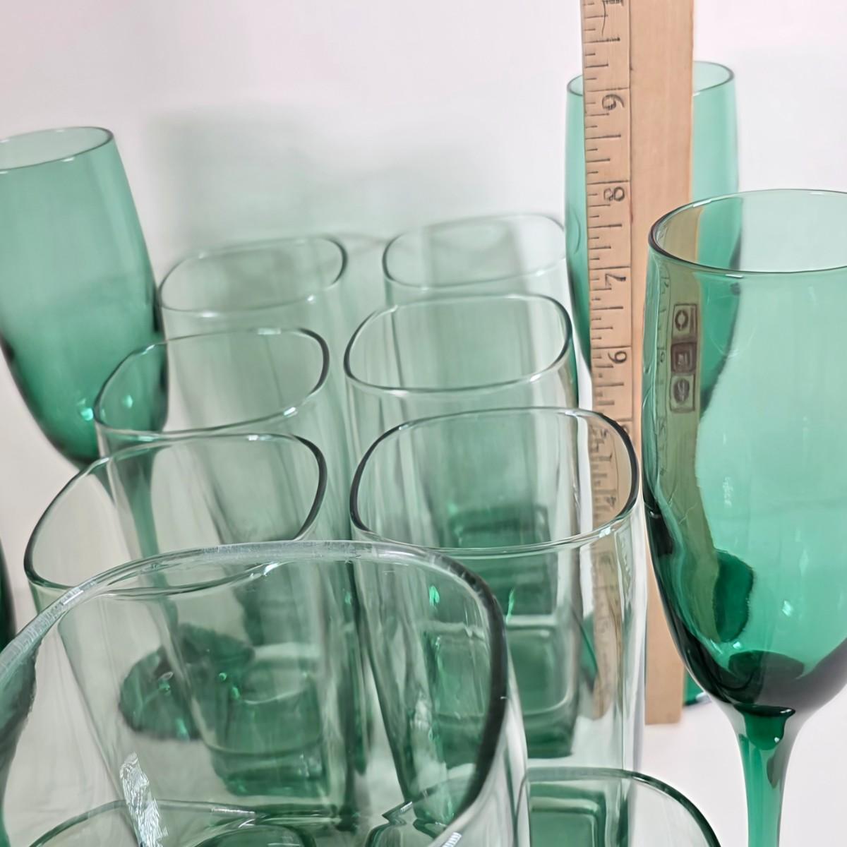 LOT 55D: Vintage Libby Carrington Green Glasses, 6 Highball Glasses, 5 Rocks Style & 4 Juniper Green Flute Champagne Glasses
