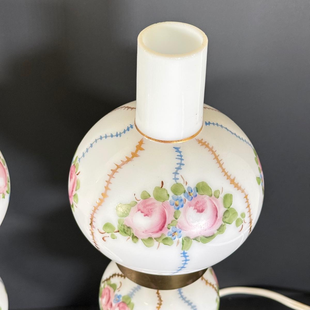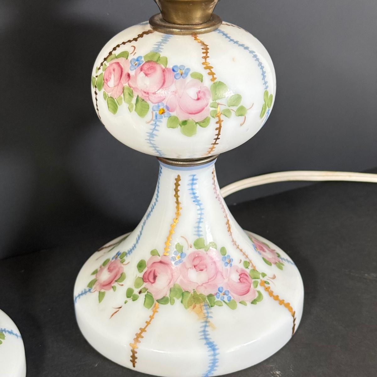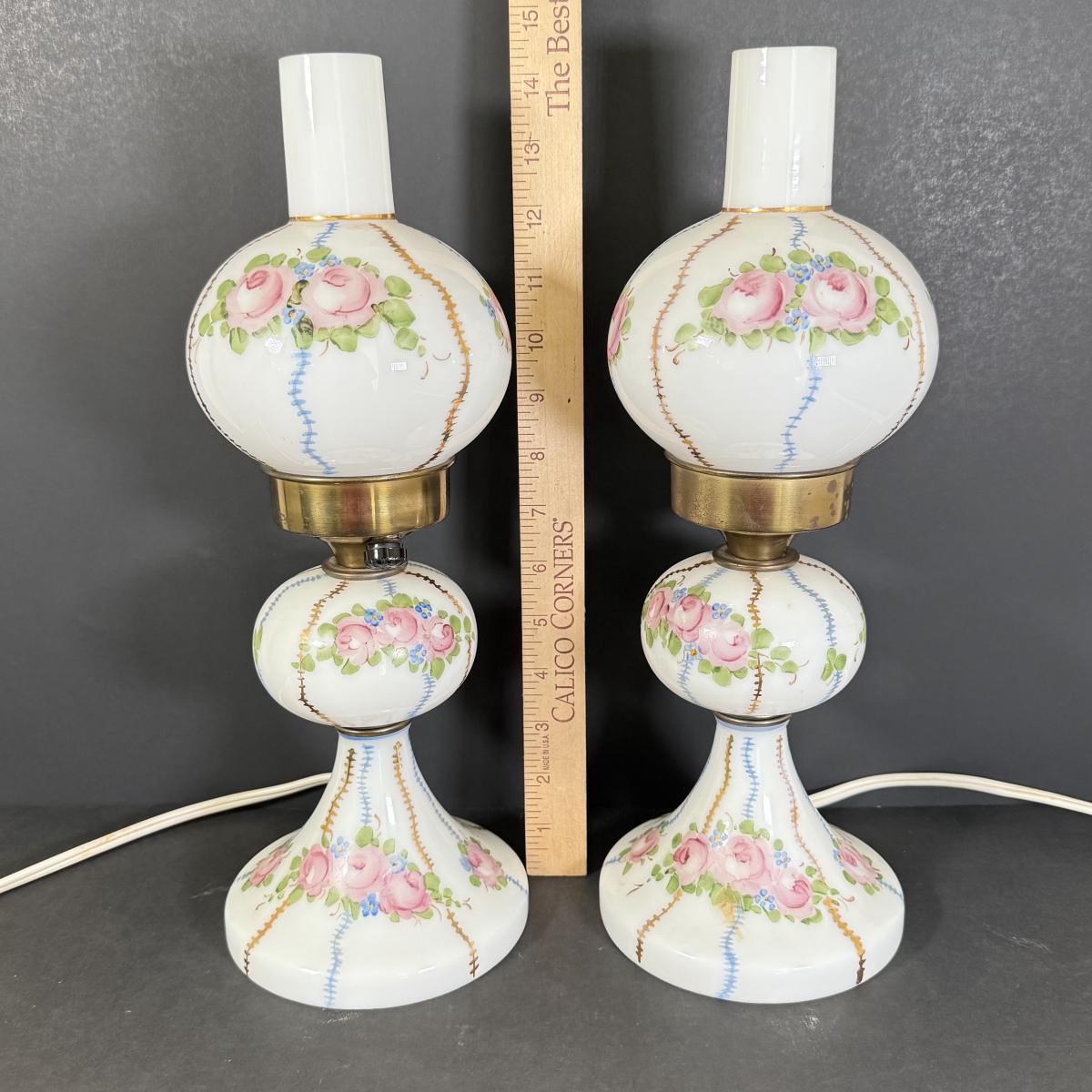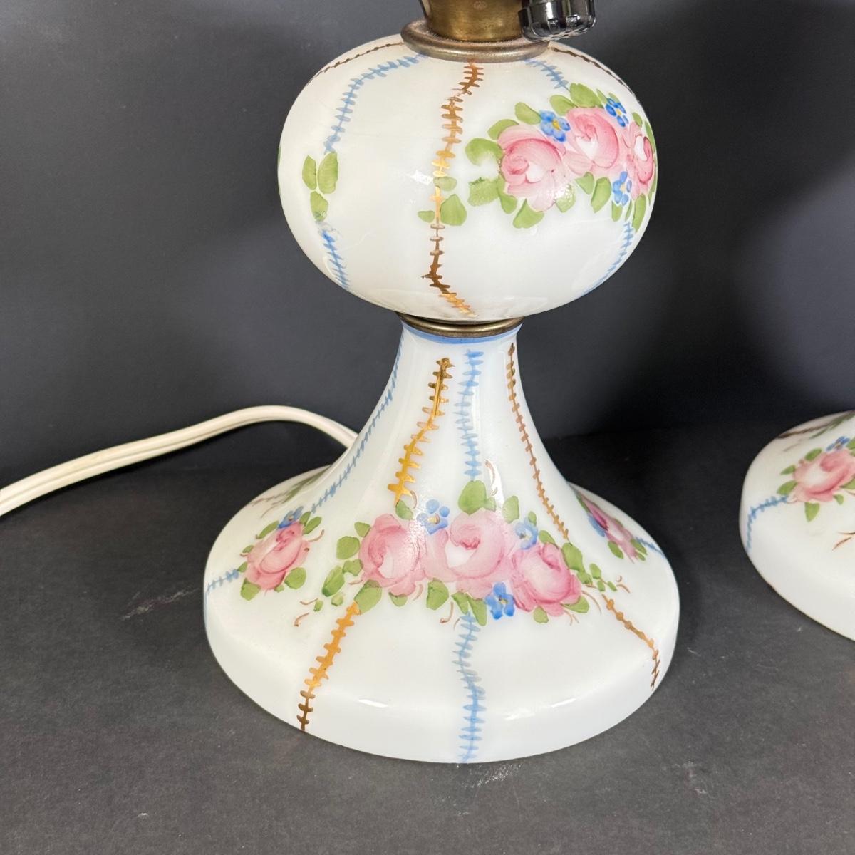 LOT 78L: Pair of Vintage Hand Painted Floral Milk Glass Electric Lamps