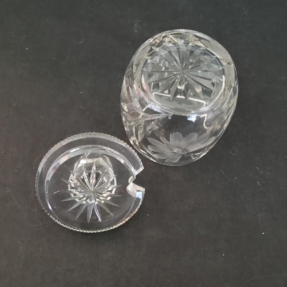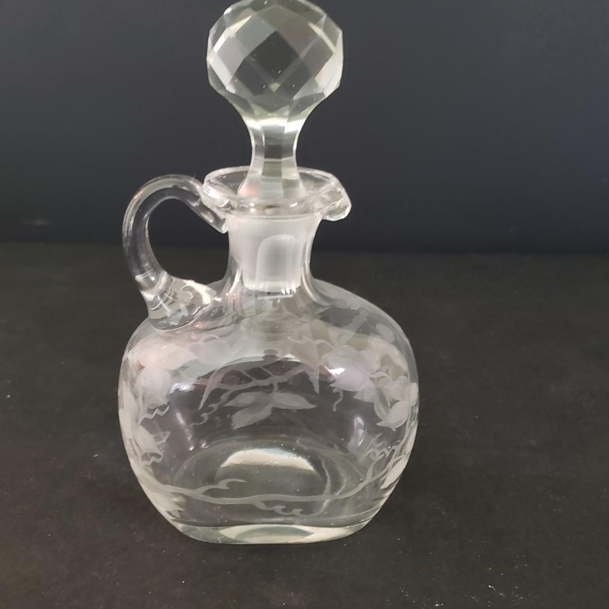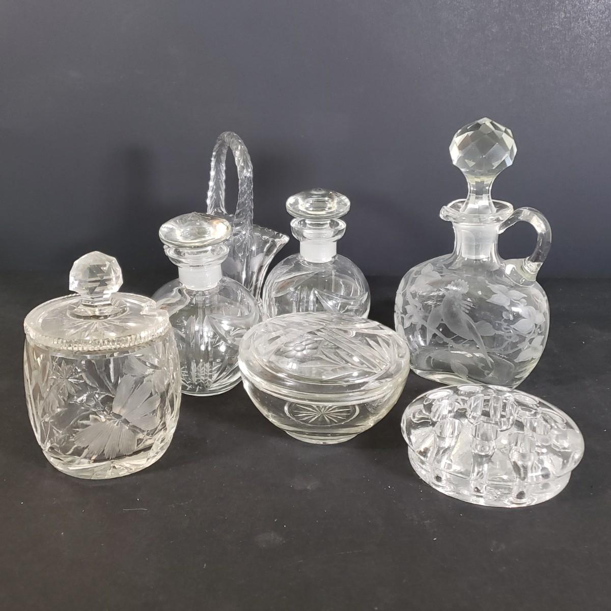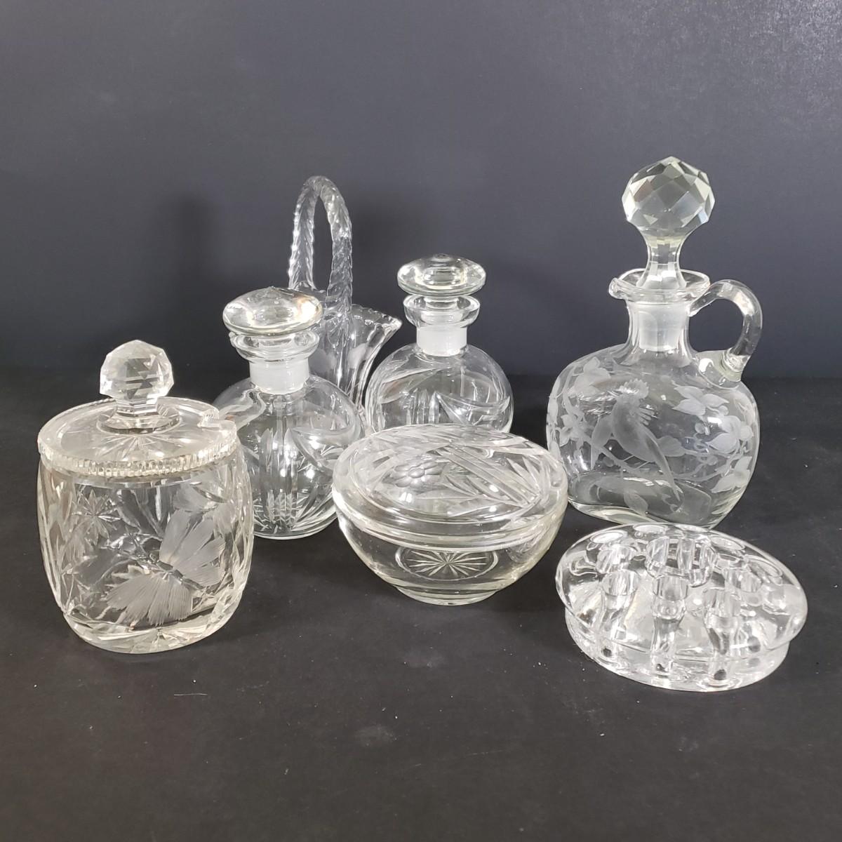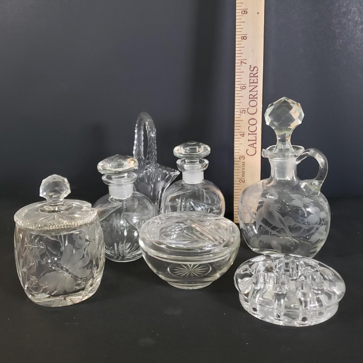 LOT 86D: Etched Glass Cruets, Condiment Jar, Trinket Dish, and More