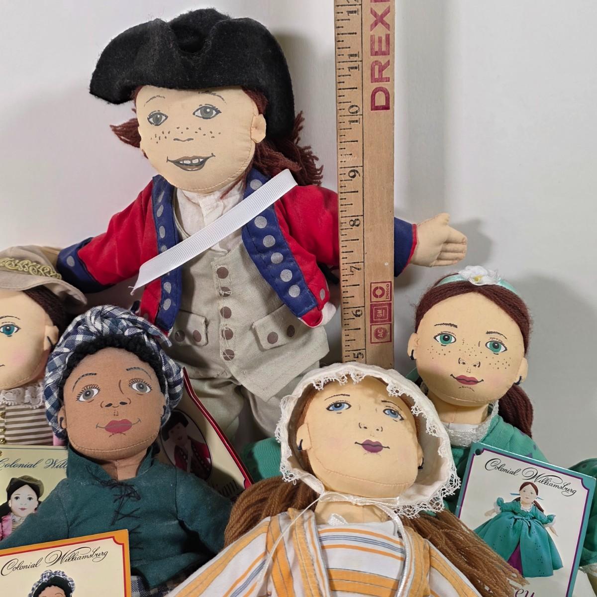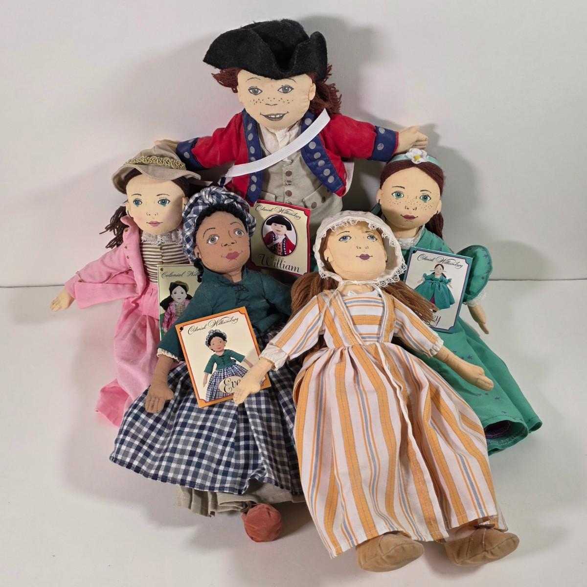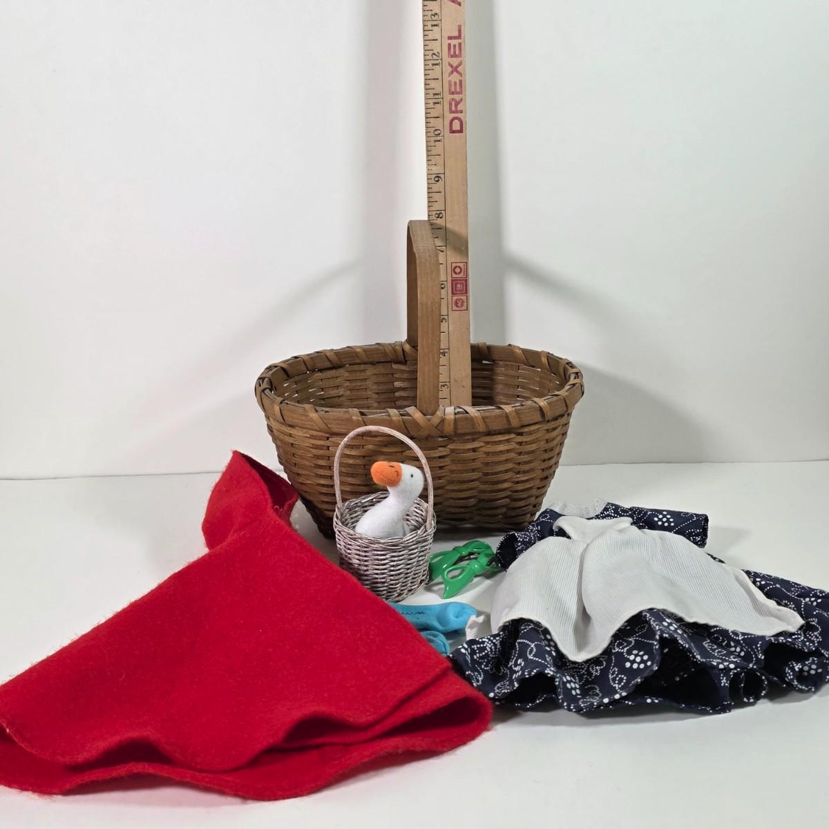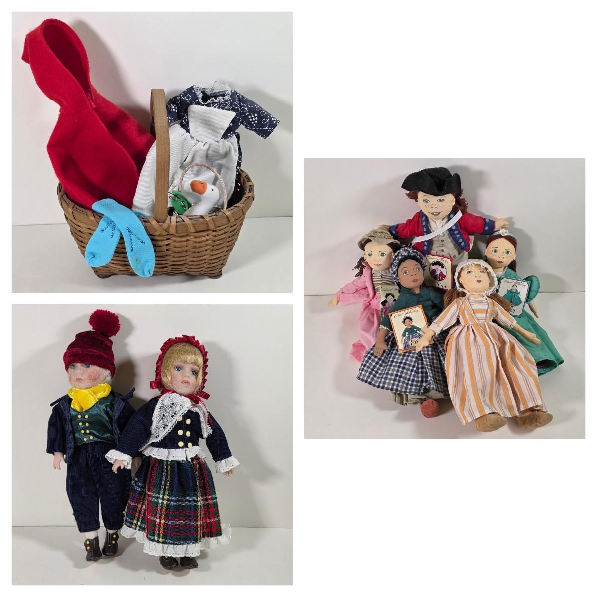 LOT 141D: Vintage Doll Collection W/Basket of Accessories, Including Heritage Signature Collection Erik & Eva Ski Dolls and Merry Makers Colonial Williamsburg Dolls