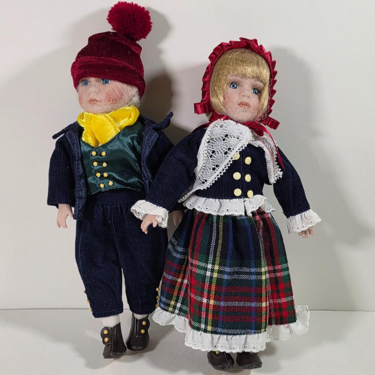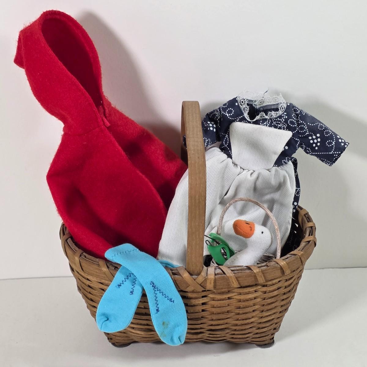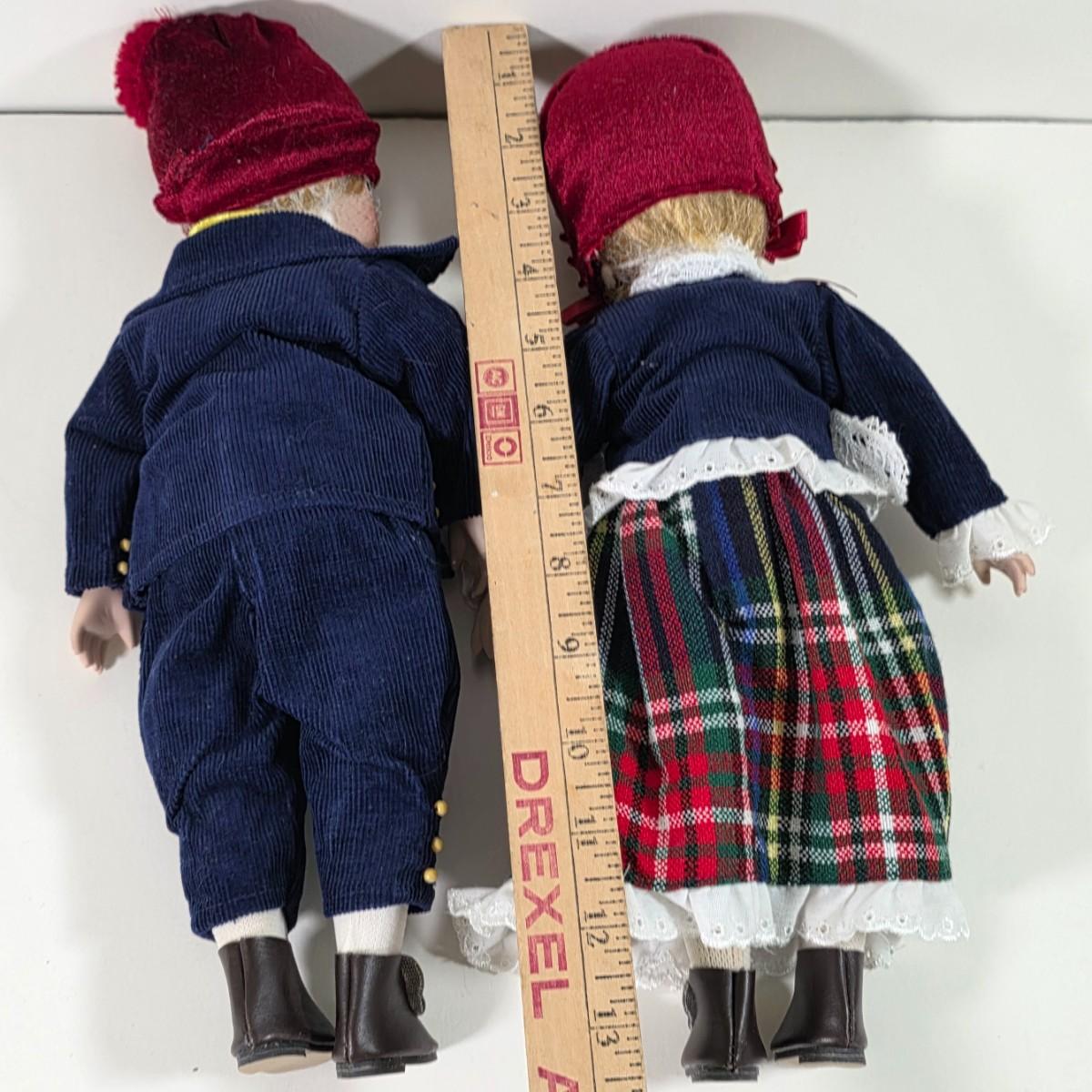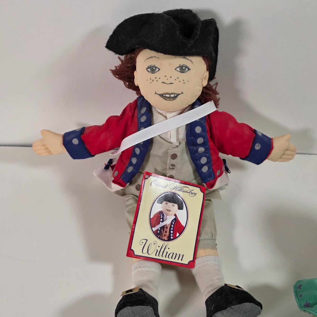 LOT 141D: Vintage Doll Collection W/Basket of Accessories, Including Heritage Signature Collection Erik & Eva Ski Dolls and Merry Makers Colonial Williamsburg Dolls