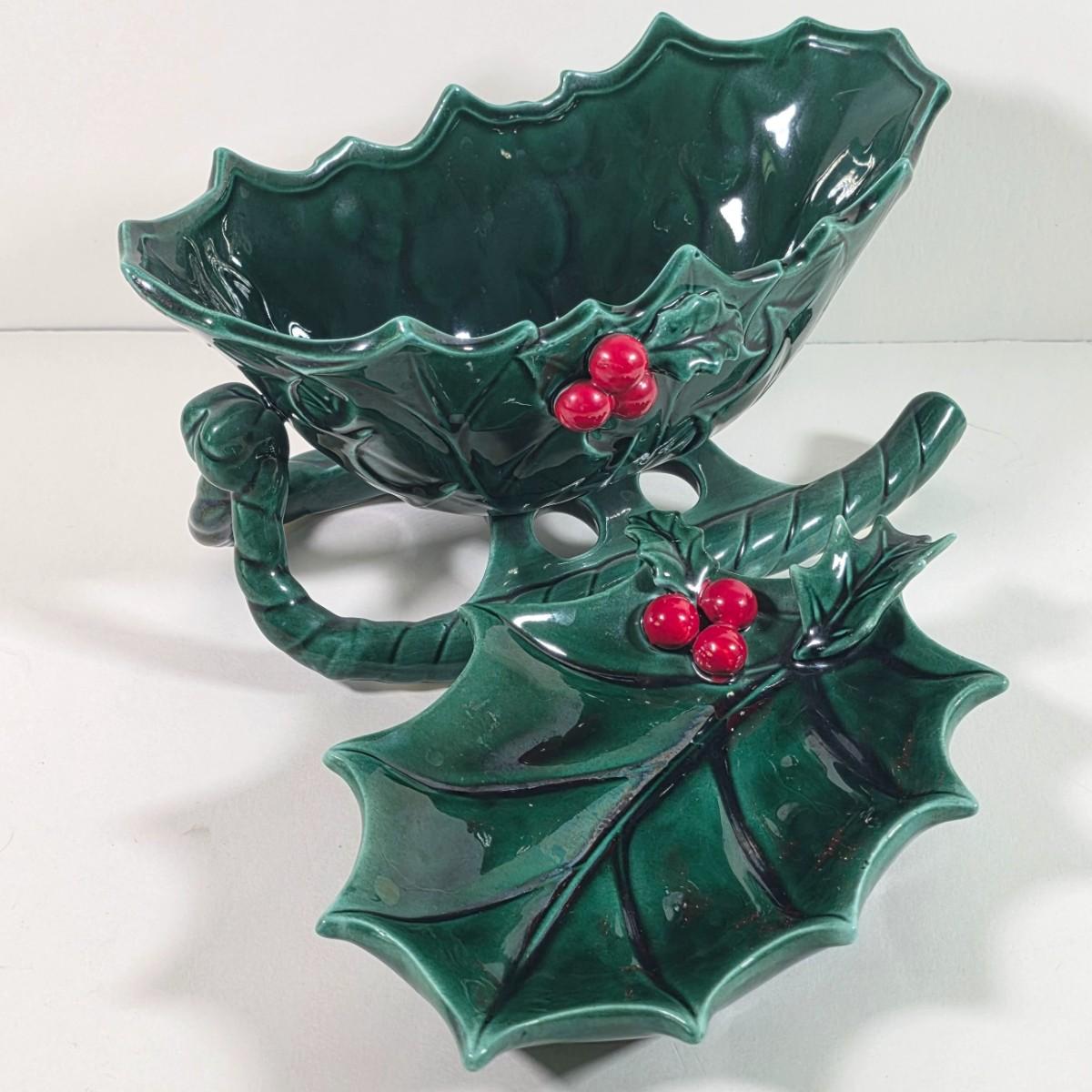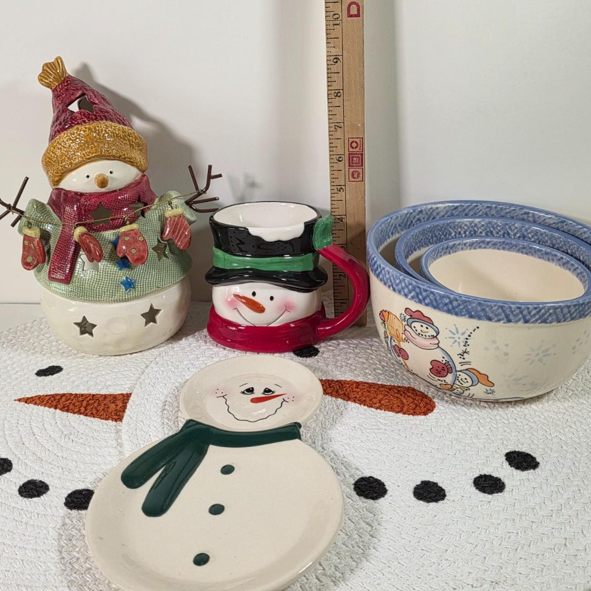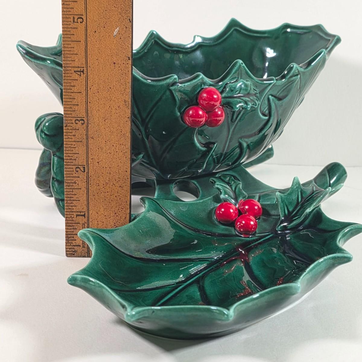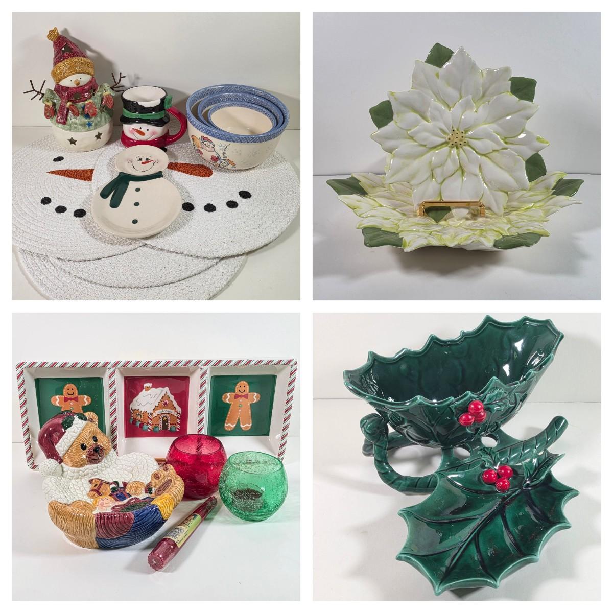 LOT 144D: Christmas in July! Vintage Lefton Holly Berry Collection Ceramic Sleigh & Leaf Dish, Ceramic Poinsettia Dishes, Snowman Placemats, Nesting Bowls, Votives W/Candles & More